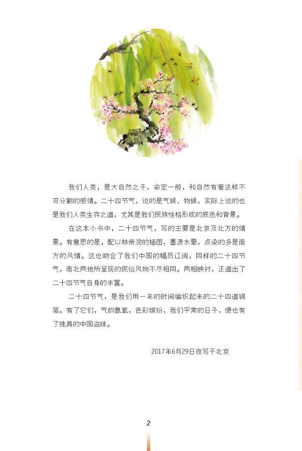 这本书中的二十四节气,写的主要是北京以及北方的情景。但配以南方画家小林的插图,墨渍水晕,尽显南方风情。这也吻合了中国的幅员辽阔,同样的二十四节气,南北两地所呈现的民俗风物不尽相同。