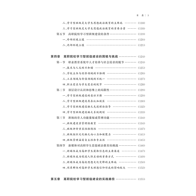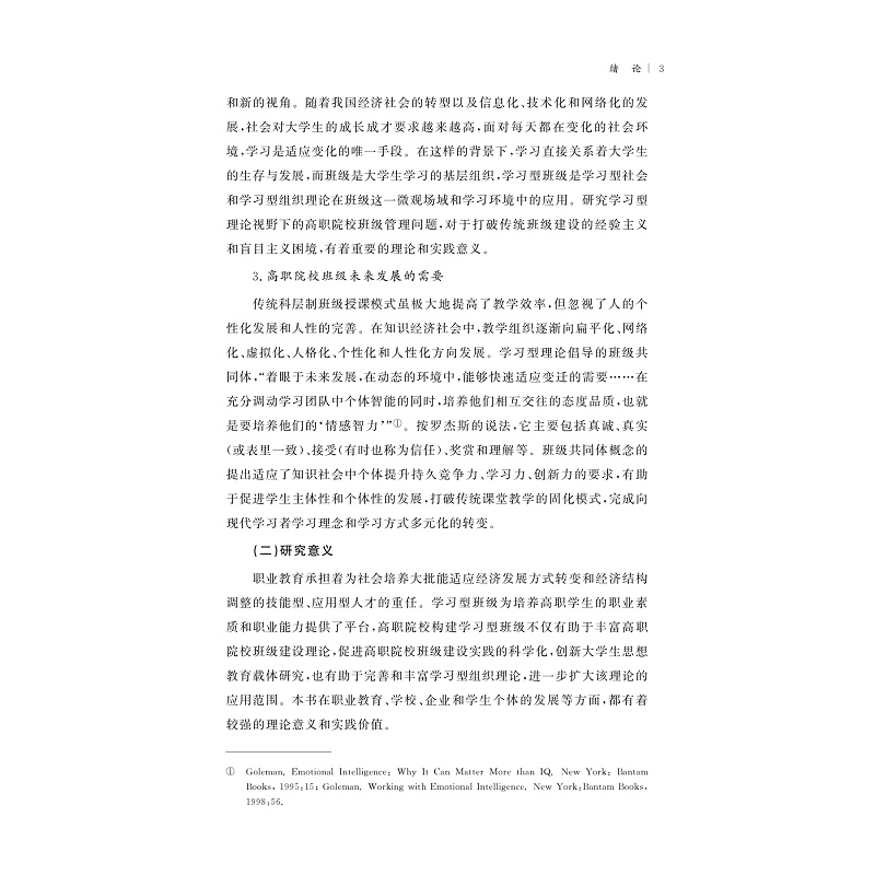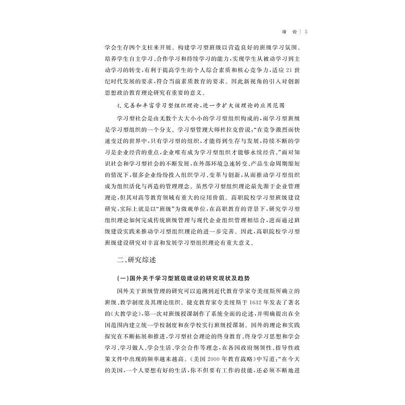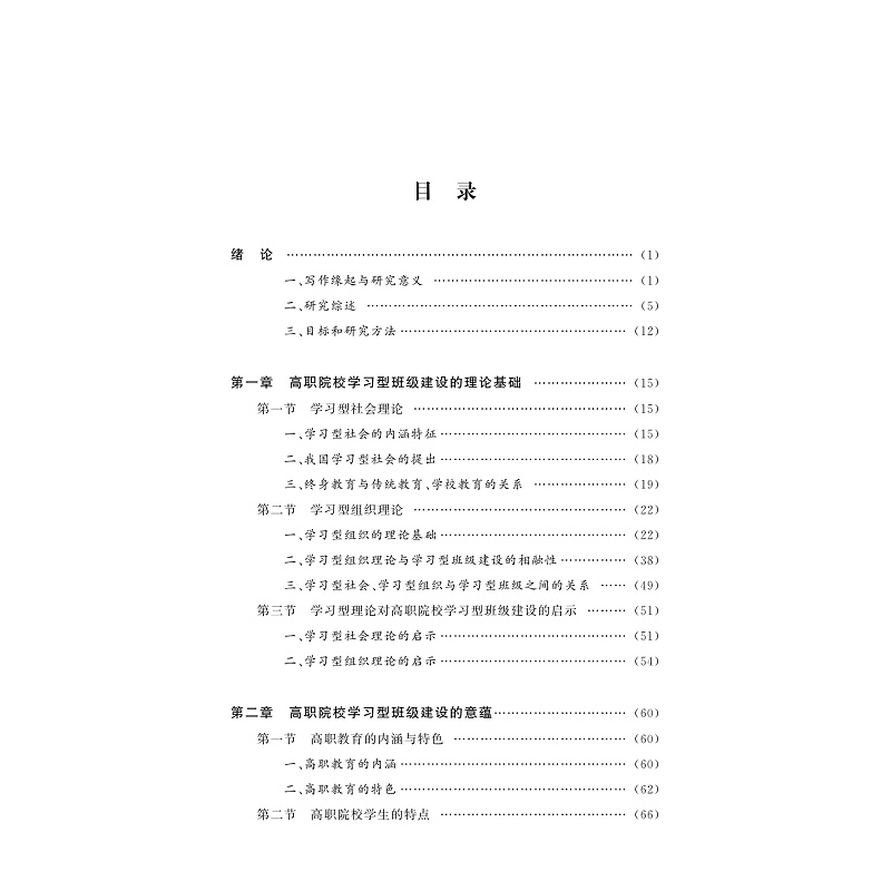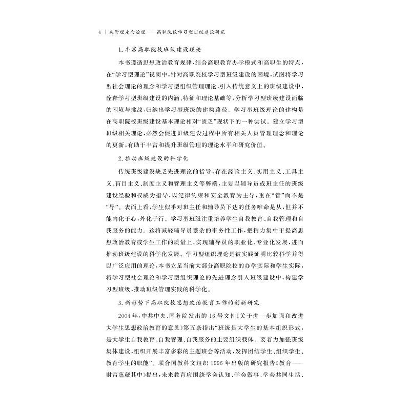 十八大以来,党中央提出推进国家治理体系和治理能力现代化,加强基层自治建设,大学班级是一个重要的基层自治单位。学习型组织的理念与党中央对基层组织建设的理念和要求具有契合性。以中央精神为指导,以学习型理论为理论基础,研究班级建设规律,创建班级的自治组织模式,塑造学习型班级文化,为提高大学班级建设质量提供启示和借鉴。本书主要以学习型理论为理解、分析和探索的框架,以高职院校的学习型班级建设为研究对象,以反思—构建为基本方法,综合运用调查访谈、归纳演绎、反思建构和跨学科研究等具体方法,考察了学习型班级建设的理论基础、诠释了高职院校学习型班级理论的意蕴,分析了高职院校学习型班级建设的必要性、动因和条件,重点分析了高职院校学习型班级建设面临的困境, 探索了构建高职院校学习型班级建设体系的基本思路。