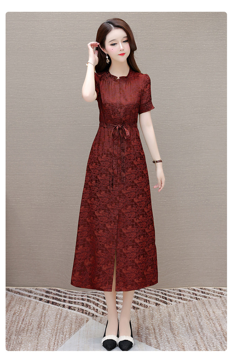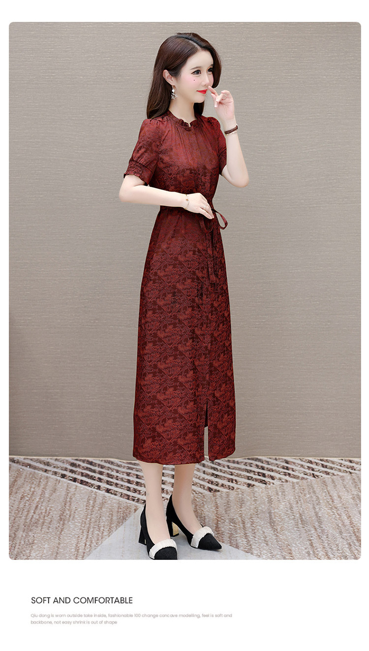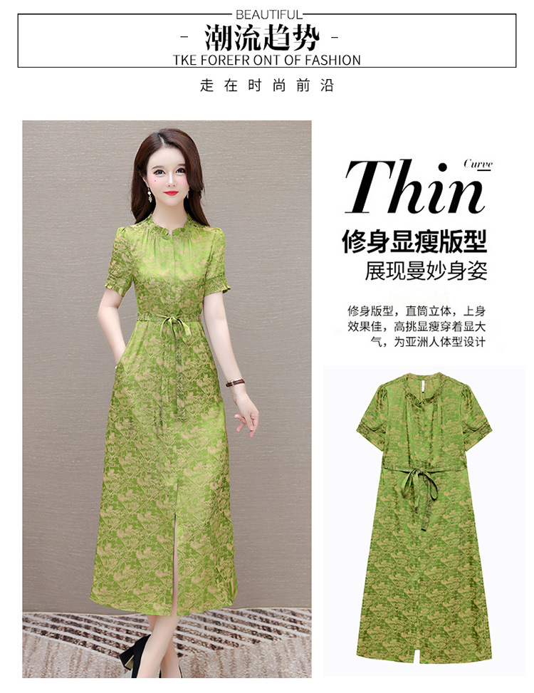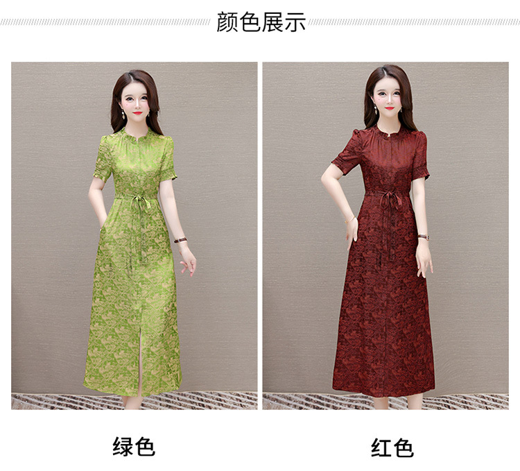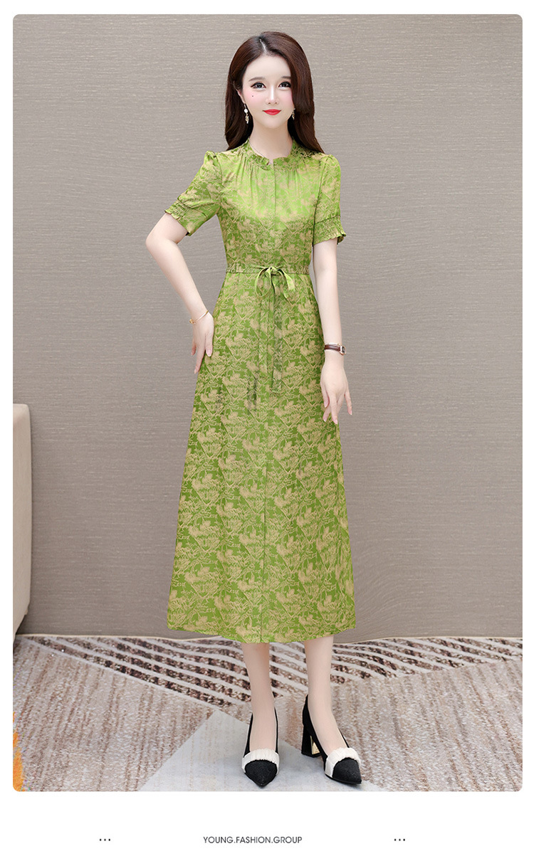 QYMJJ-FXP067-Y 时尚印花连衣裙女2024年夏季新款短袖系带收腰中长款妈妈半裙子 商品图4