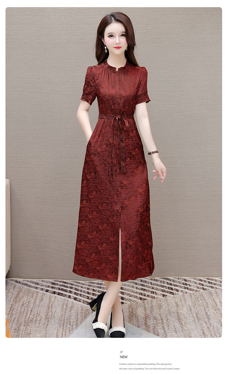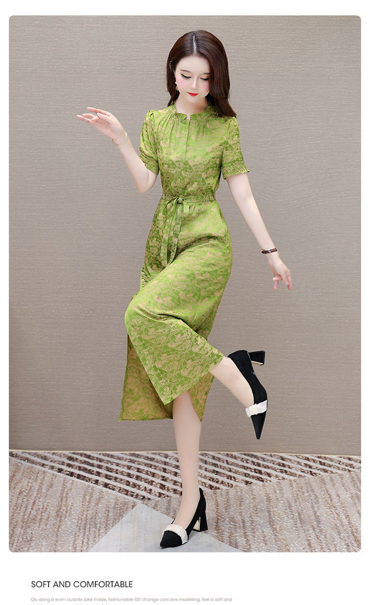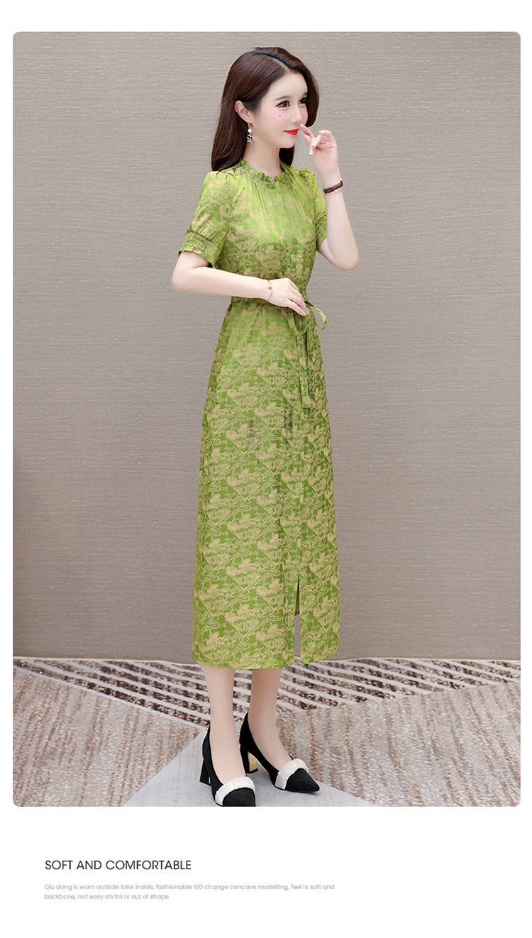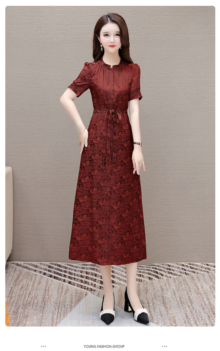 QYMJJ-FXP067-Y 时尚印花连衣裙女2024年夏季新款短袖系带收腰中长款妈妈半裙子 商品图4