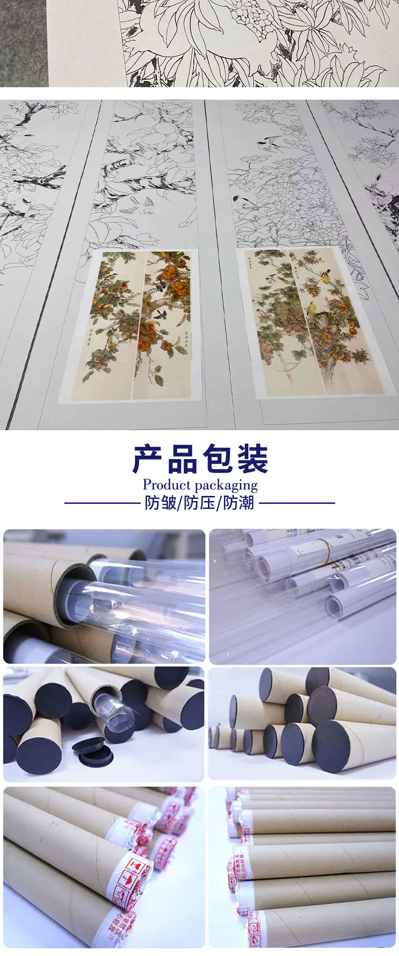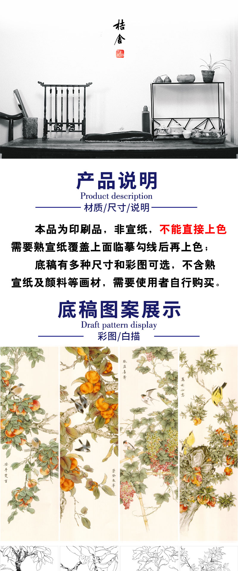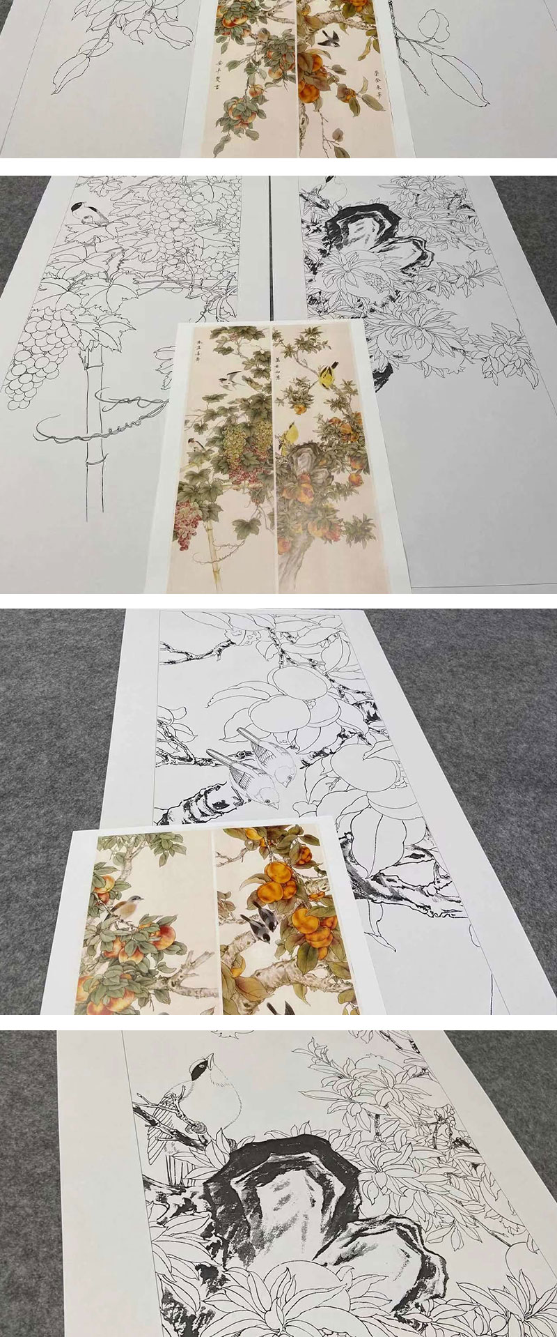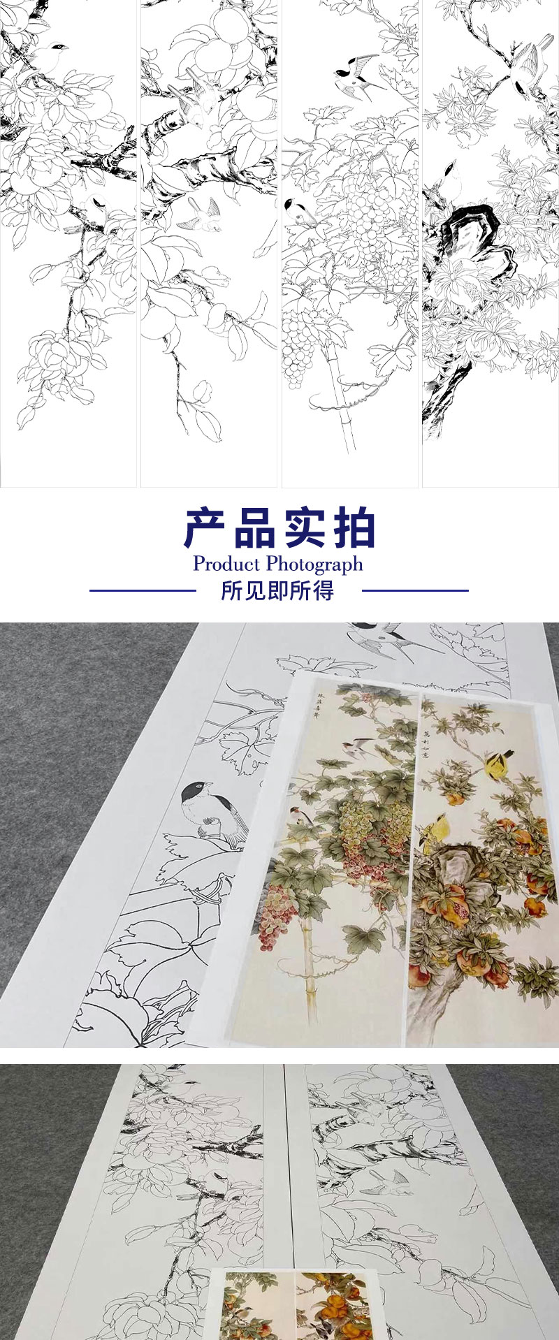 【四条屏】工笔画白描底稿石榴葡萄临摹勾线花鸟线稿TP15
