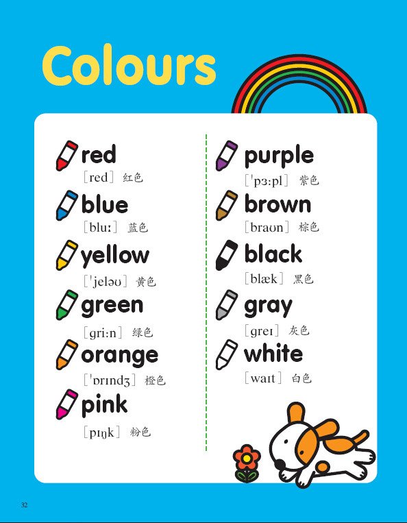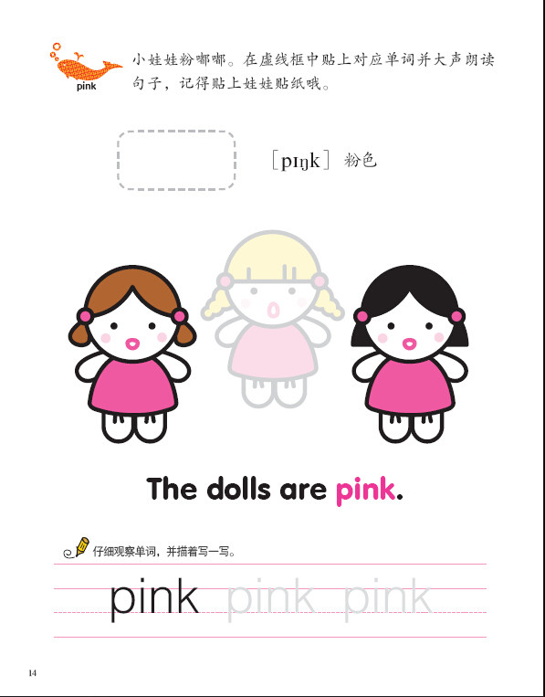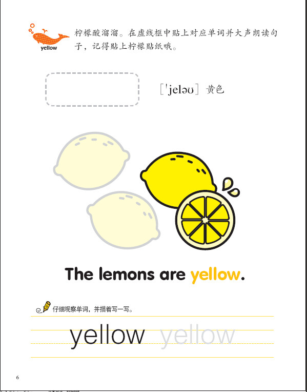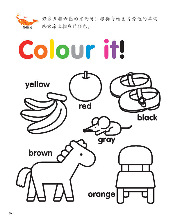 本册书旨在让孩子通过贴贴画,涂颜色,学写字,掌握11种颜色的英文名称。看文字,涂颜色,学单词,在反复练习中掌握颜色的英文名称。