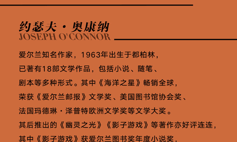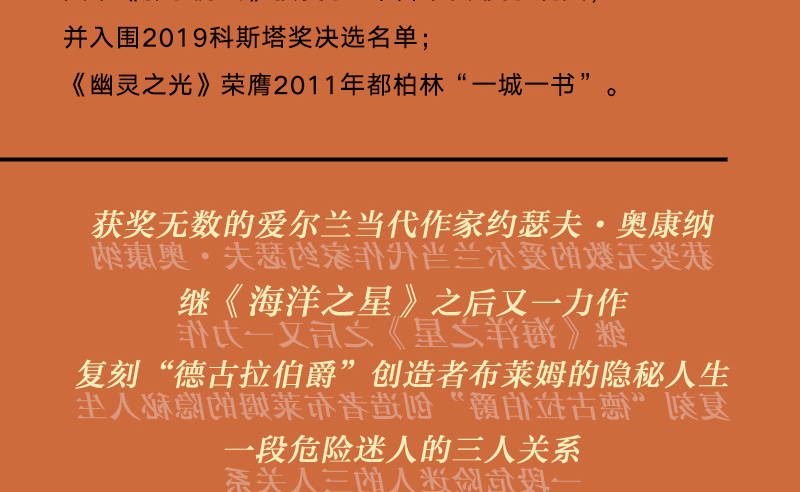 1. 获奖无数的爱尔兰当代作家约瑟夫•奥康纳继《海洋之星》之后又一力作,复刻“德古拉伯爵”创造者布莱姆的爱情与创造人生。
