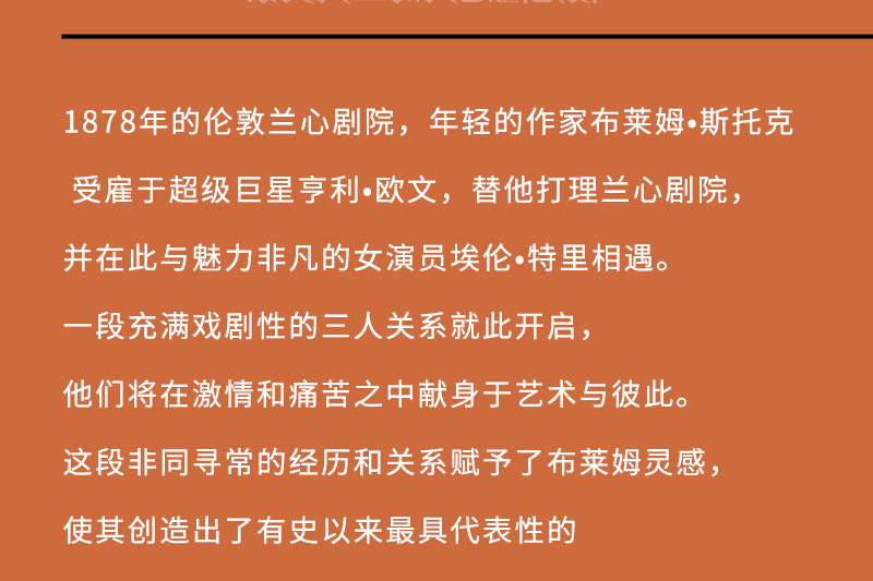 1878年的伦敦兰心剧院,年轻的作家布莱姆•斯托克受雇于超级巨星亨利•欧文,替他打理兰心剧院,并在此与魅力非凡的女演员埃伦•特里相遇。一段充满戏剧性的三人关系就此开启,他们将在激情和痛苦之中献身于艺术与彼此。这段非同寻常的经历和关系赋予了布莱姆灵感,使其创造出了有史以来最具代表性的吸血鬼故事——《德古拉》。