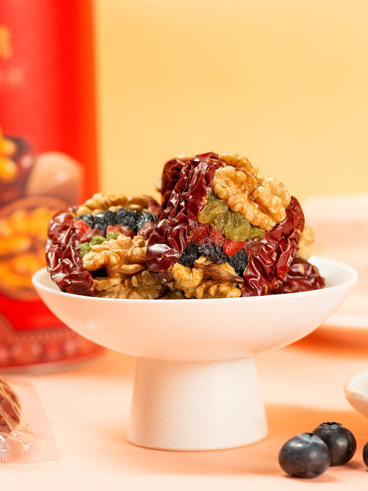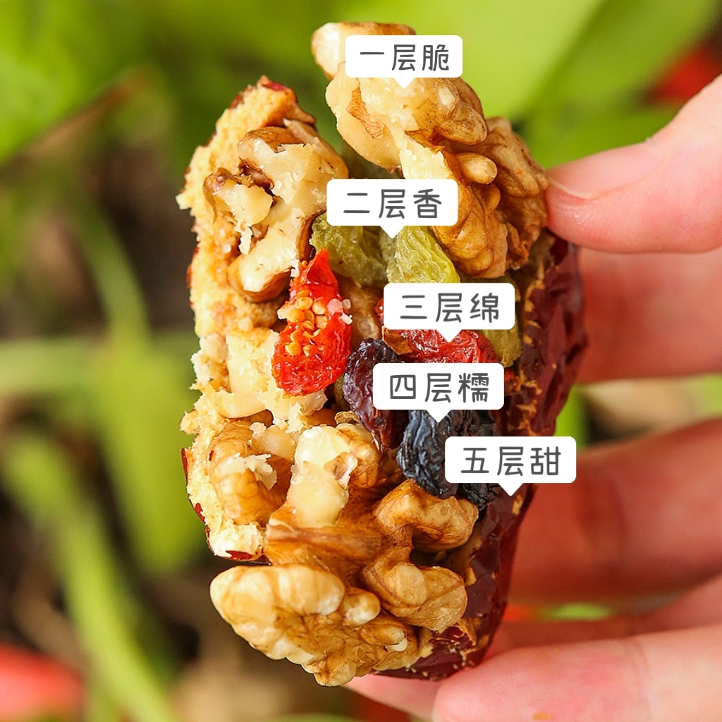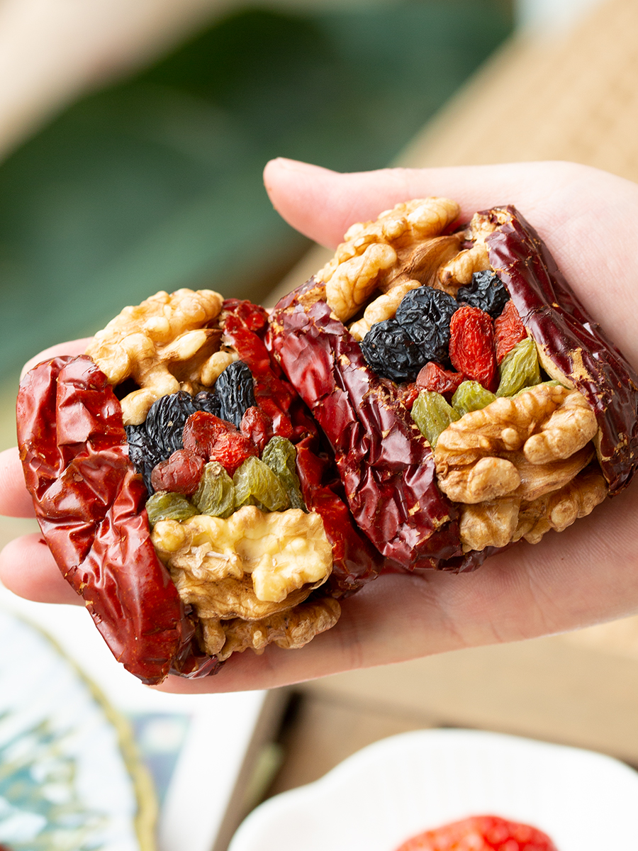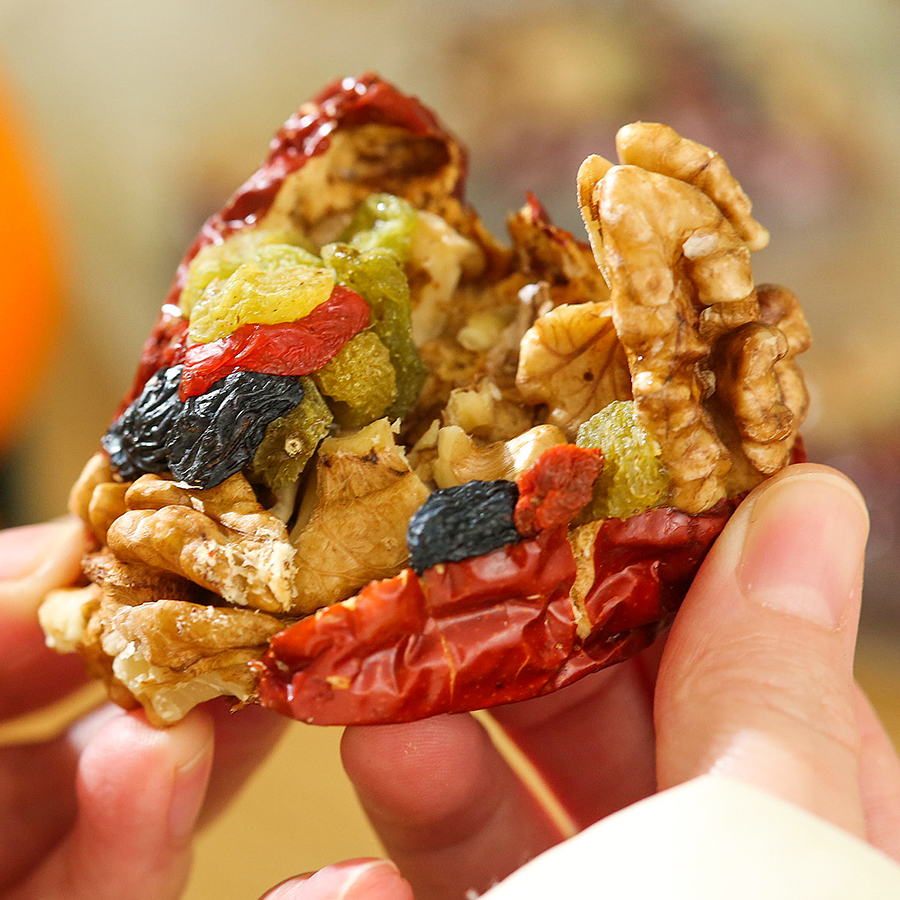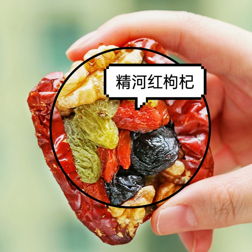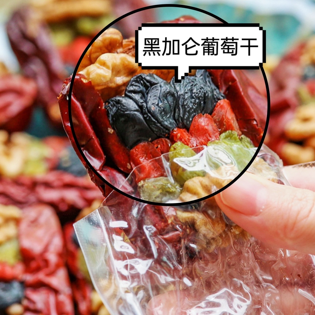 【配料】: 和田大枣,核桃仁,葡萄干, 精河枸杞,黑加仑葡萄干