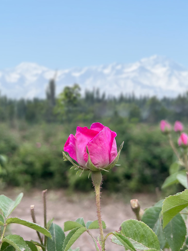 前面是塔克拉玛干沙漠,后面是昆仑山,紧挨着西藏阿里,起源于伊朗原生种大马士革,经过丝绸之路,来到了古西域三十六国古于阗,历经2000年,和现在的大马士革属于同宗同源,但是又在各自的土地,完成了品种自我的进化,欲放更加适应这里气候、土壤,也成了世界唯一高地沙漠玫瑰。