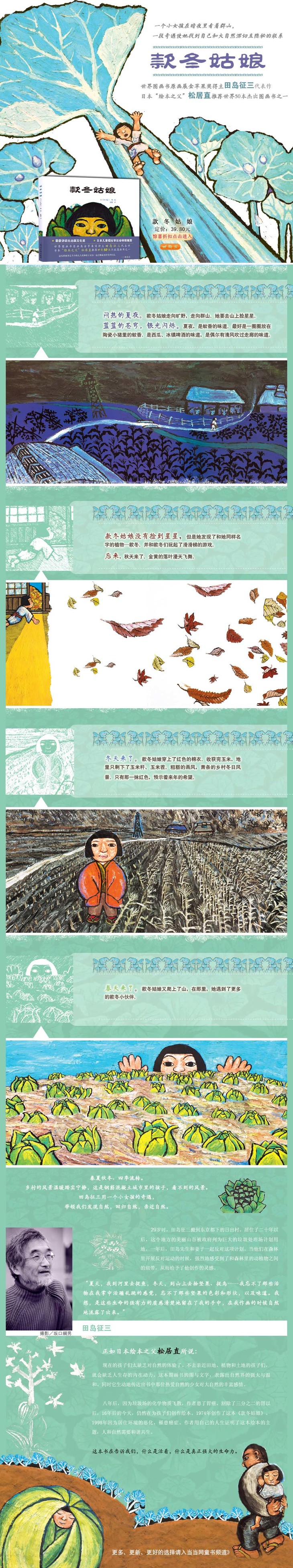 这本绘本讲述了一个叫款冬的小姑娘在山上的奇遇。一个美丽的幻想故事。夜里,款冬姑娘发现对面的山上有星星落了下来,爬上去一看,是款冬叶子上的夜露闪闪放光……它的图与文字表露出了自然界的强大和温和。同时它生动地传达出了热爱自然的少女对大自然的丰富感情。这是一部反映了日本人的坚强温和的性格和传统生存状态的作品。