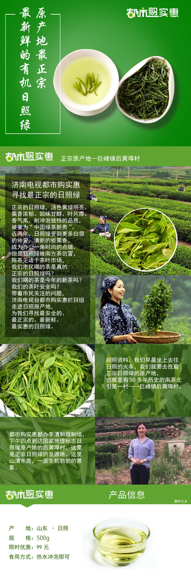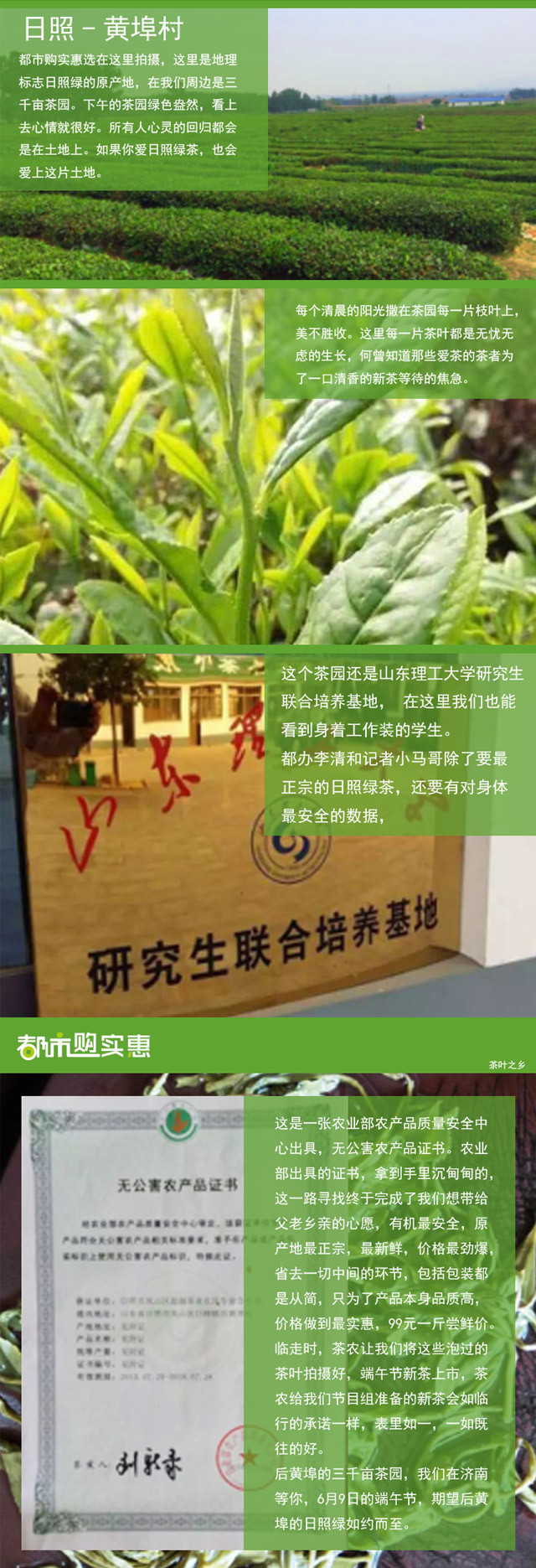 后记:2020年巨峰镇相对干旱,日照率减产,2021年开春天气忽冷忽热,情况不比去年好,更为严峻的是2022年露天明前茶几乎绝收,今年的谷雨茶品质就是往年的明前茶。5月中旬初开园茶才入市,栏目监控的品质茶叶要五月底才能与大家见面,对于消费第一市场的济南来说,这迟来的日照绿给予了格外的关照,当然都市购实惠给大家找到的日照绿以零投诉的成绩回报给我们的济南观众。