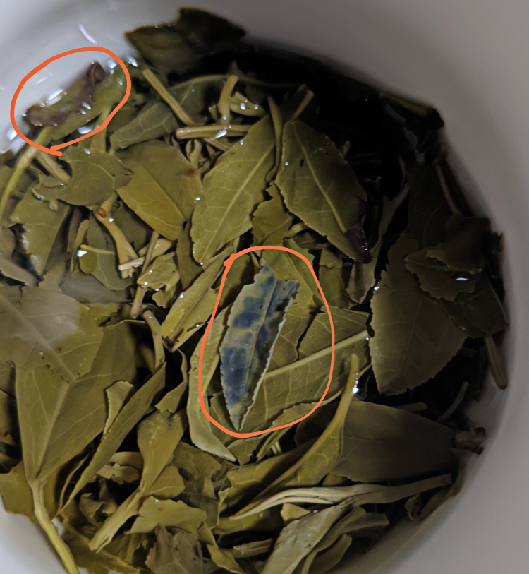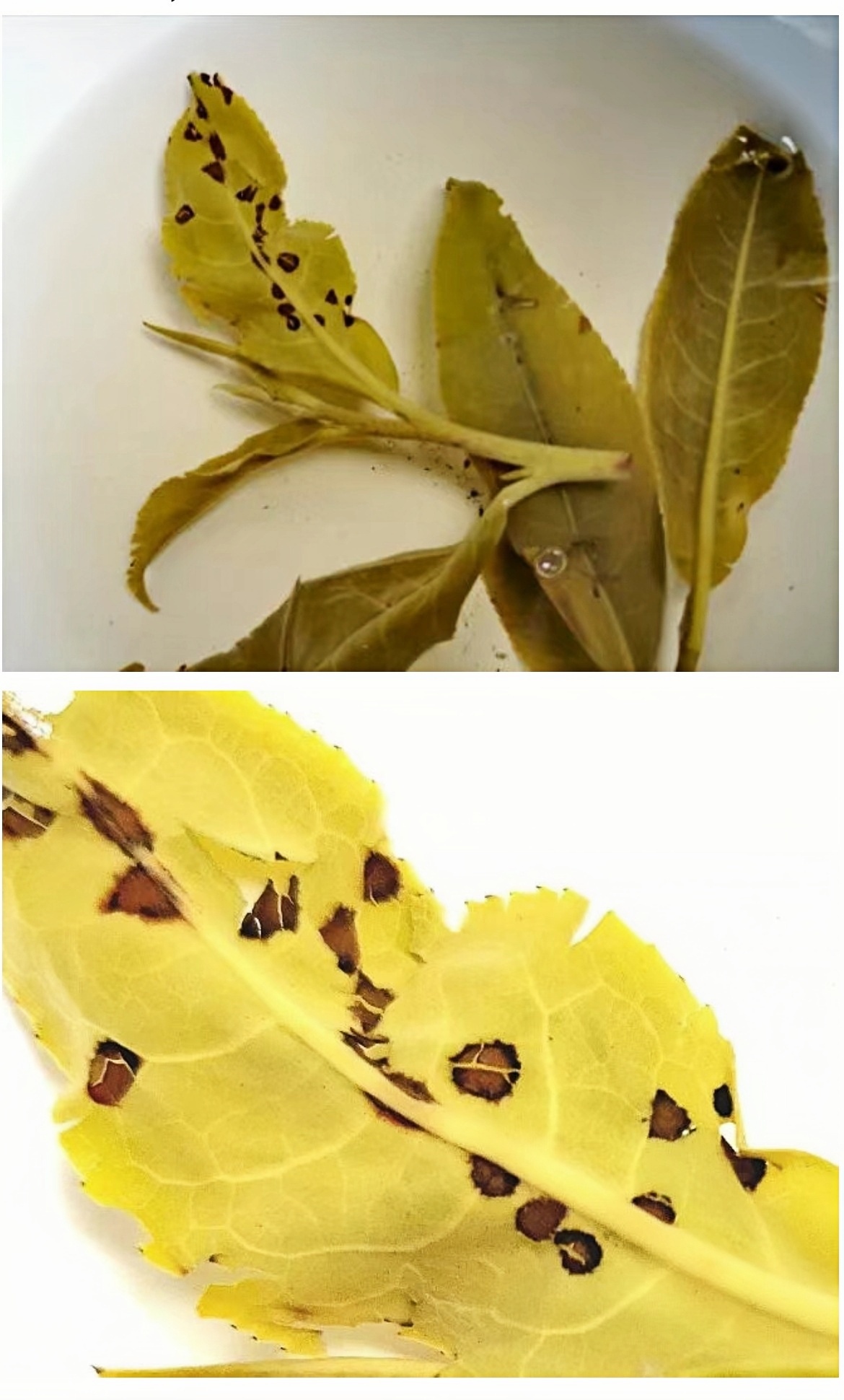 (上图)这也是天然鲜叶做茶后,无法杜绝受伤害叶片无法杜绝的情况,页面会呈现黑点或蓝色或紫色的斑点。