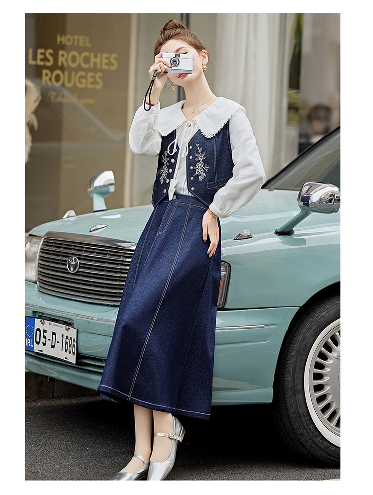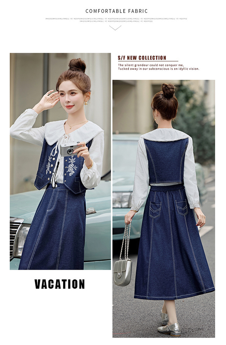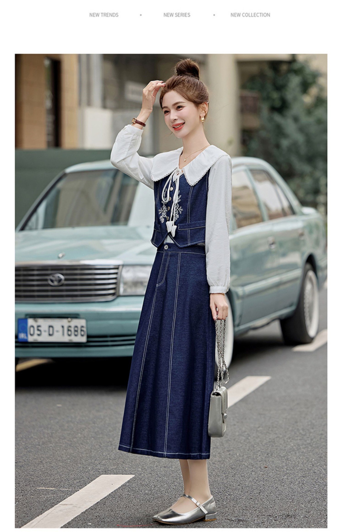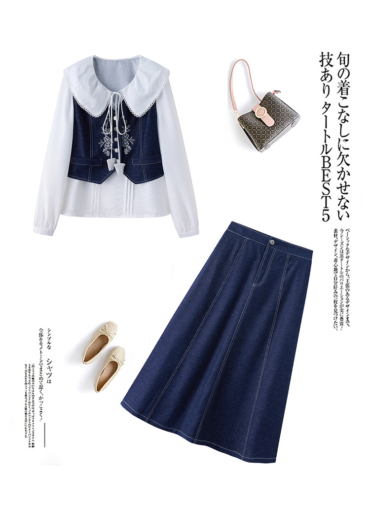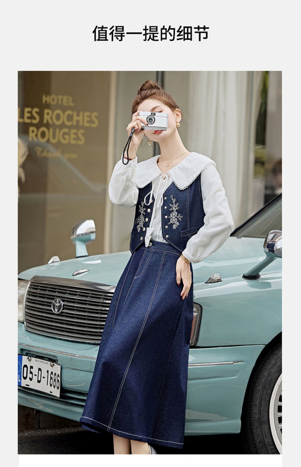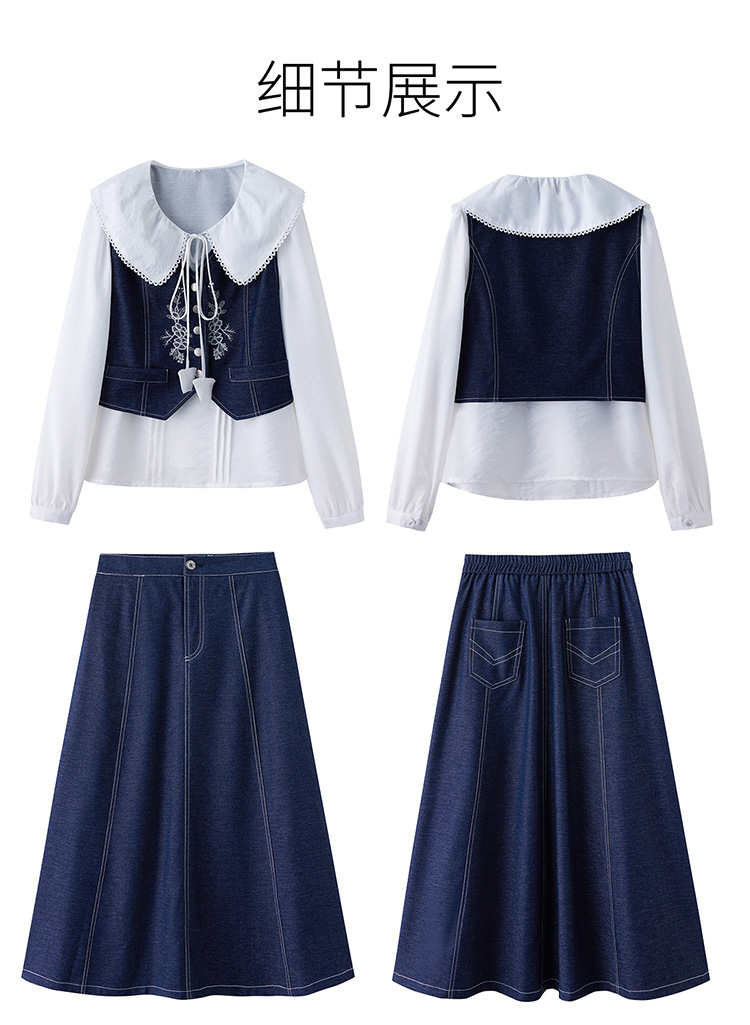 显瘦今年流行时尚套装女小个子长袖衬衣马甲半身裙三件套YM9951A