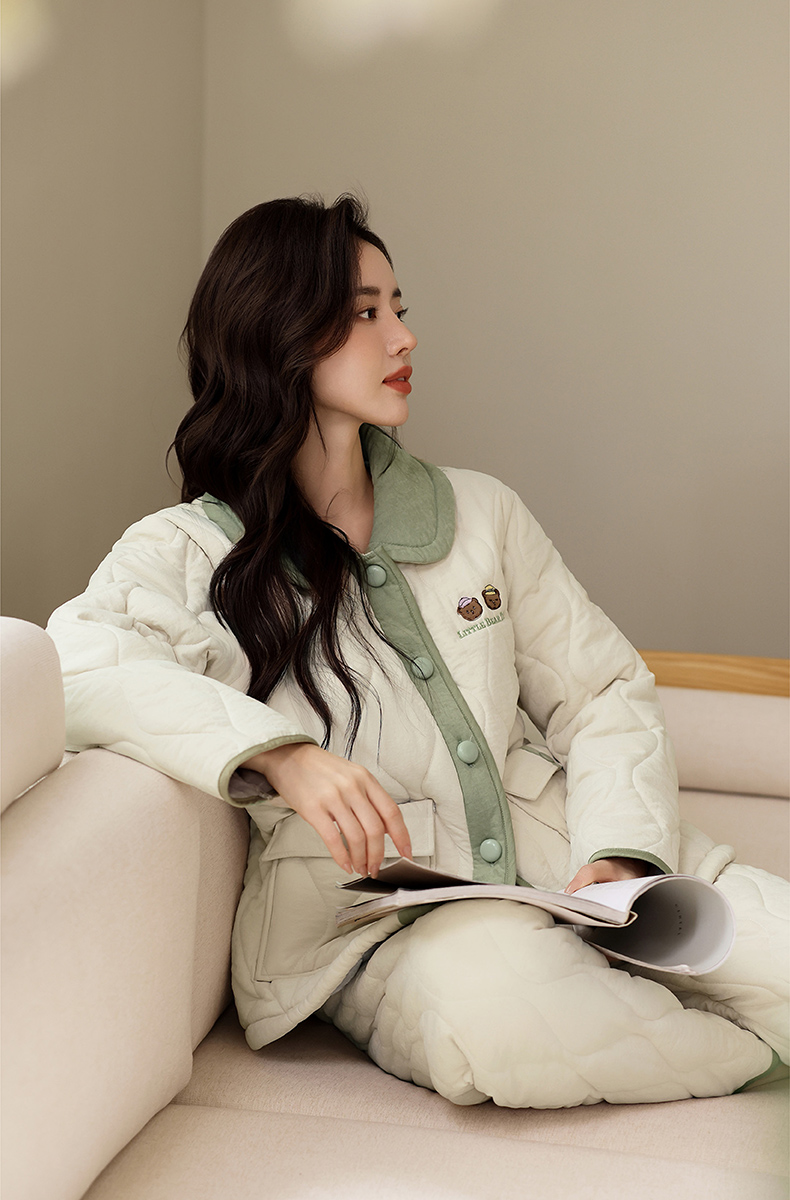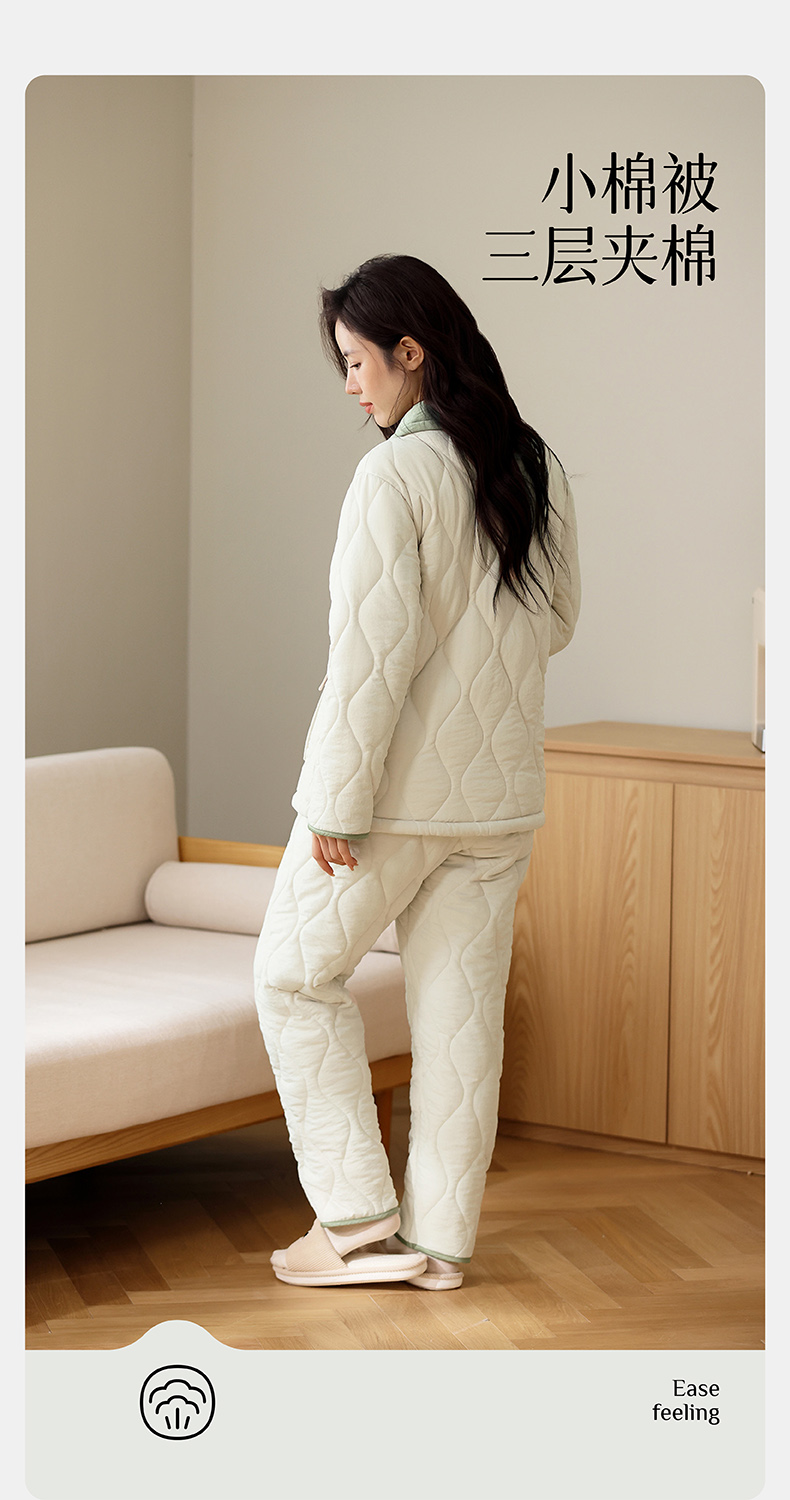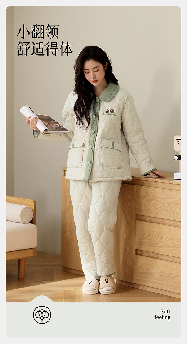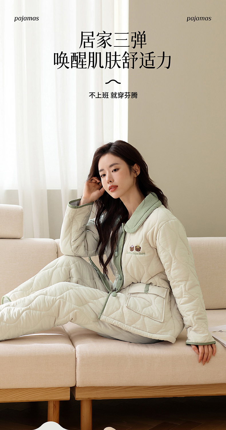 芬腾冬季女士三层夹棉翻领开衫睡衣大码套装珊瑚绒加绒加厚家居服