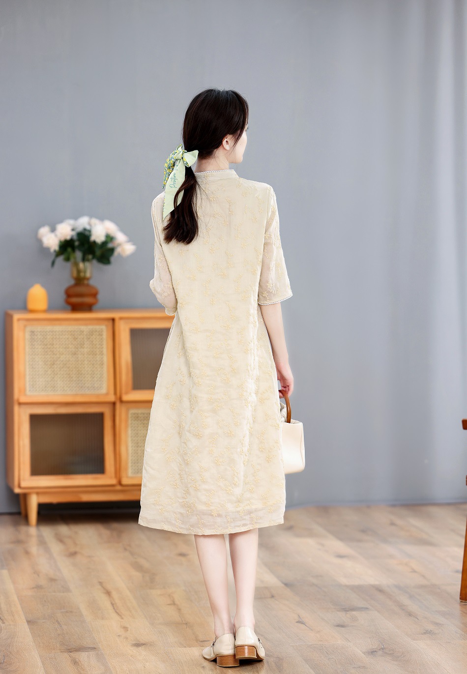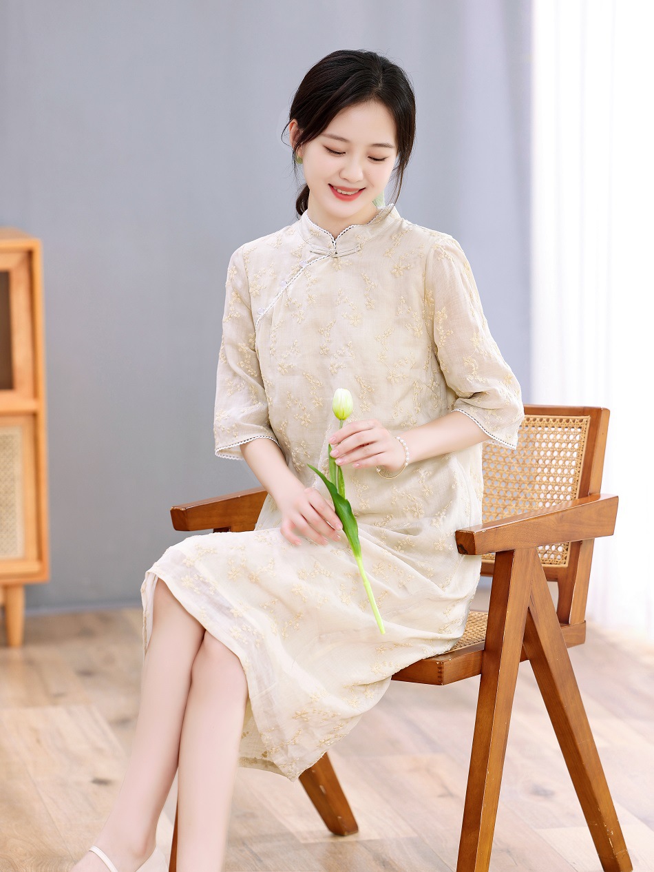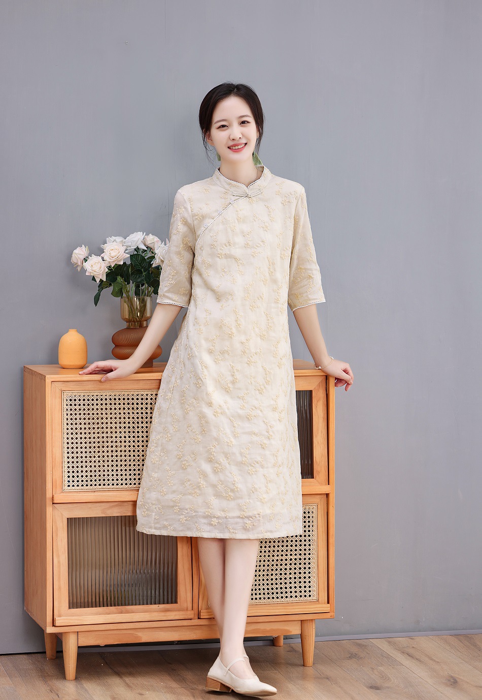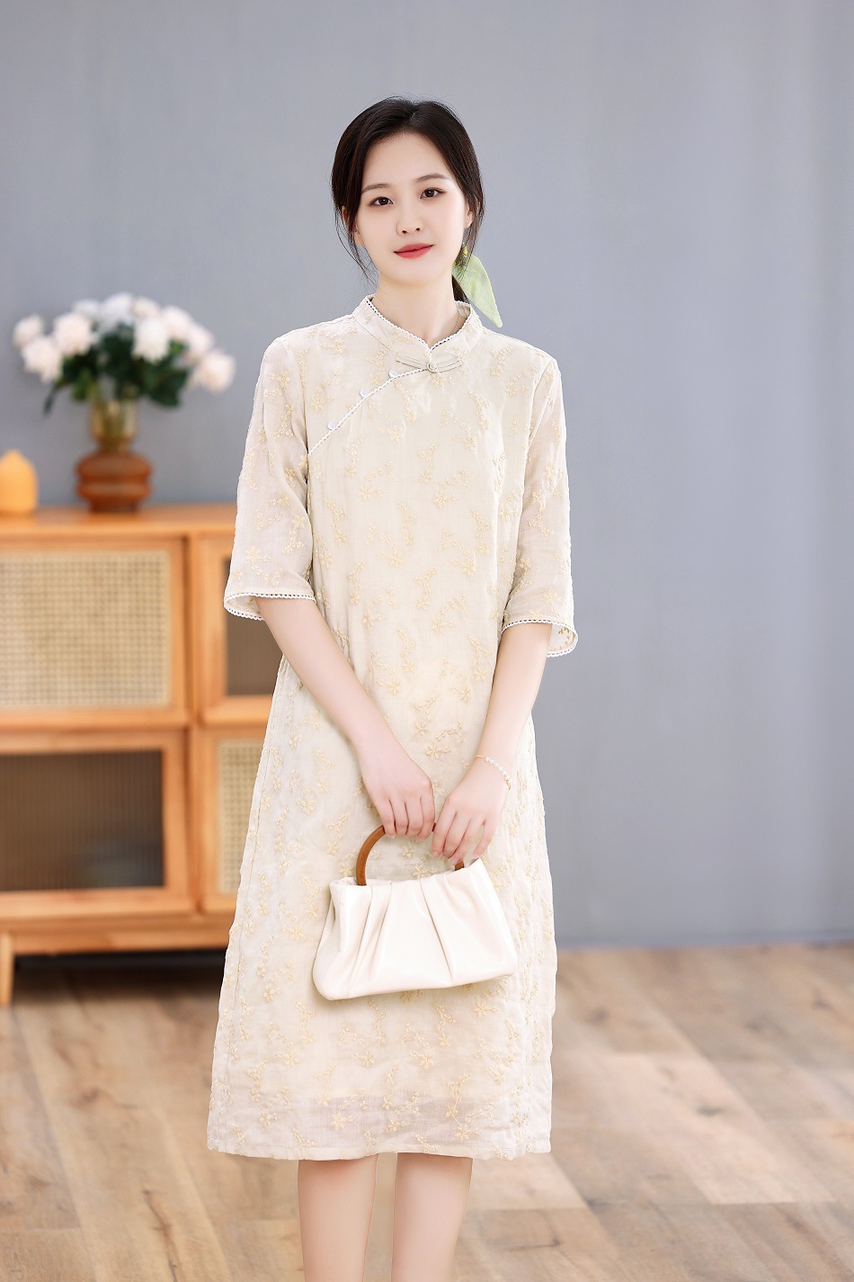 苎麻刺绣,重磅中袖长款连衣裙盘扣旗袍HS-HY2217-1