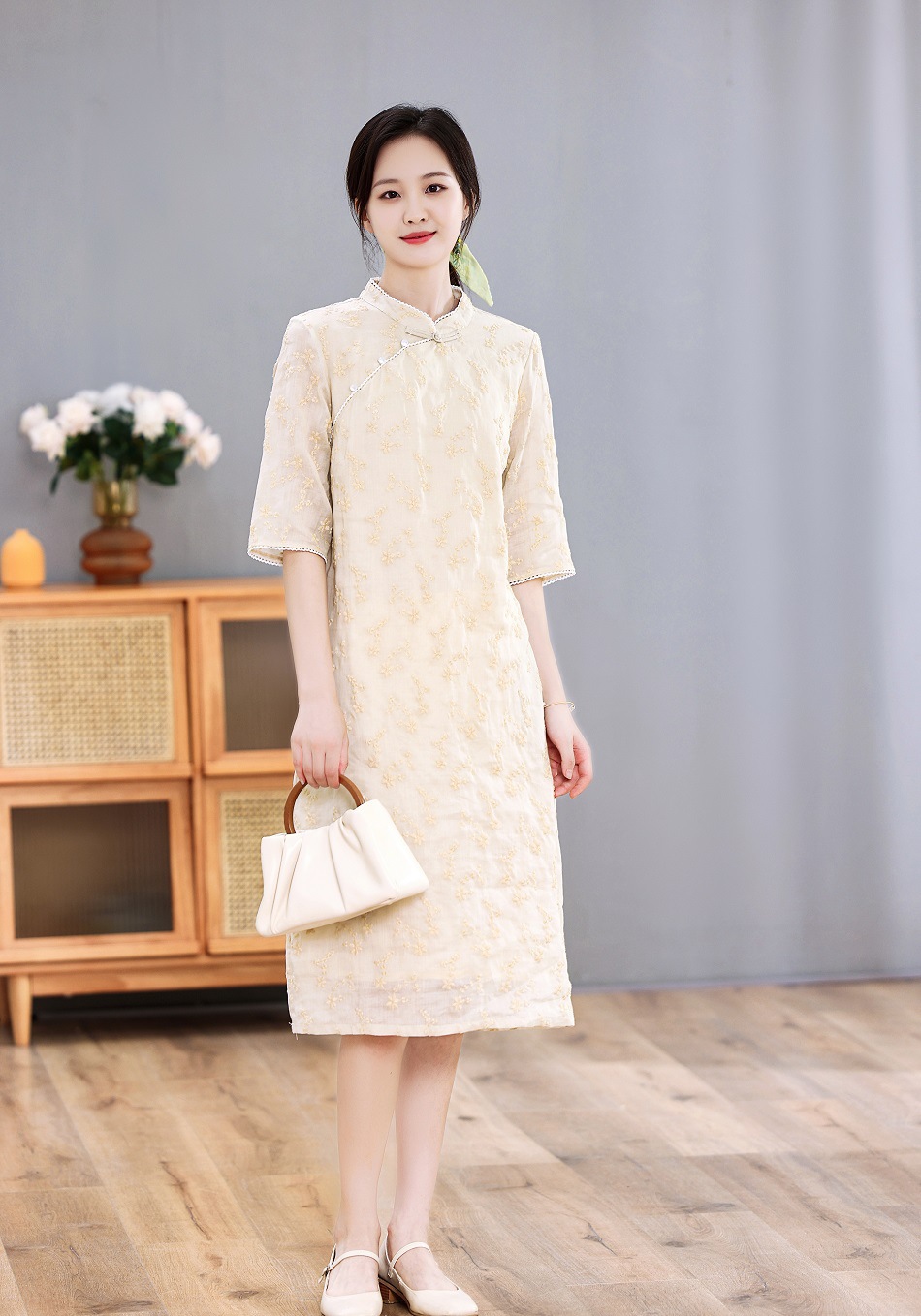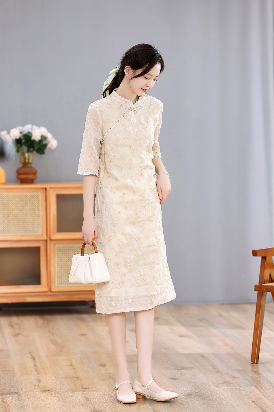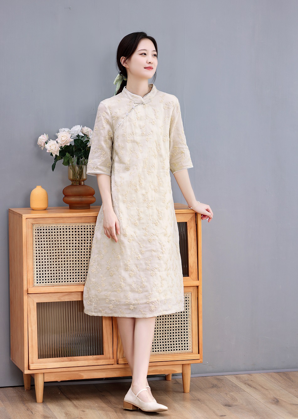 苎麻刺绣,重磅中袖长款连衣裙盘扣旗袍HS-HY2217-1