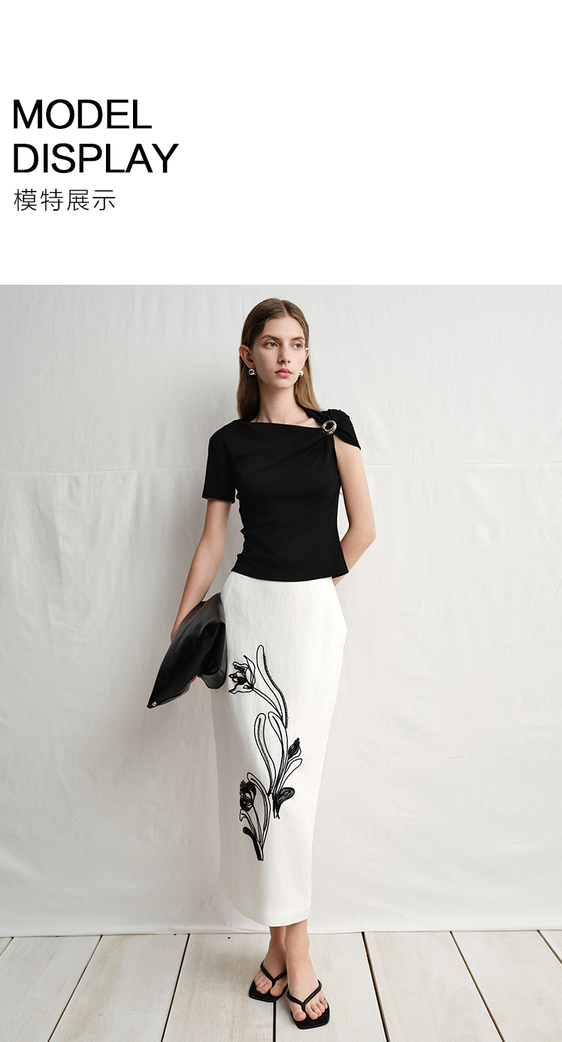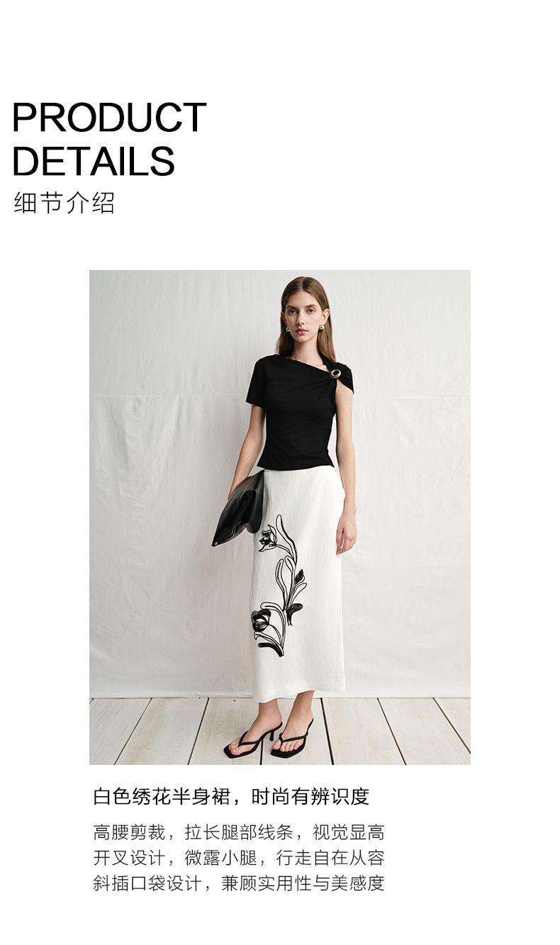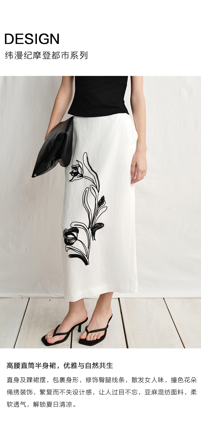 VIMAGE纬漫纪度假风刺绣撞色花朵及踝高腰直筒半身裙2025夏季新款V2306919