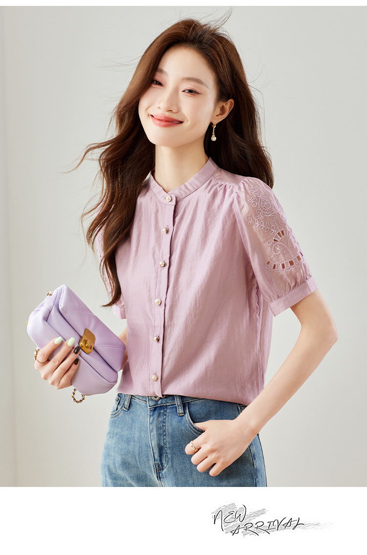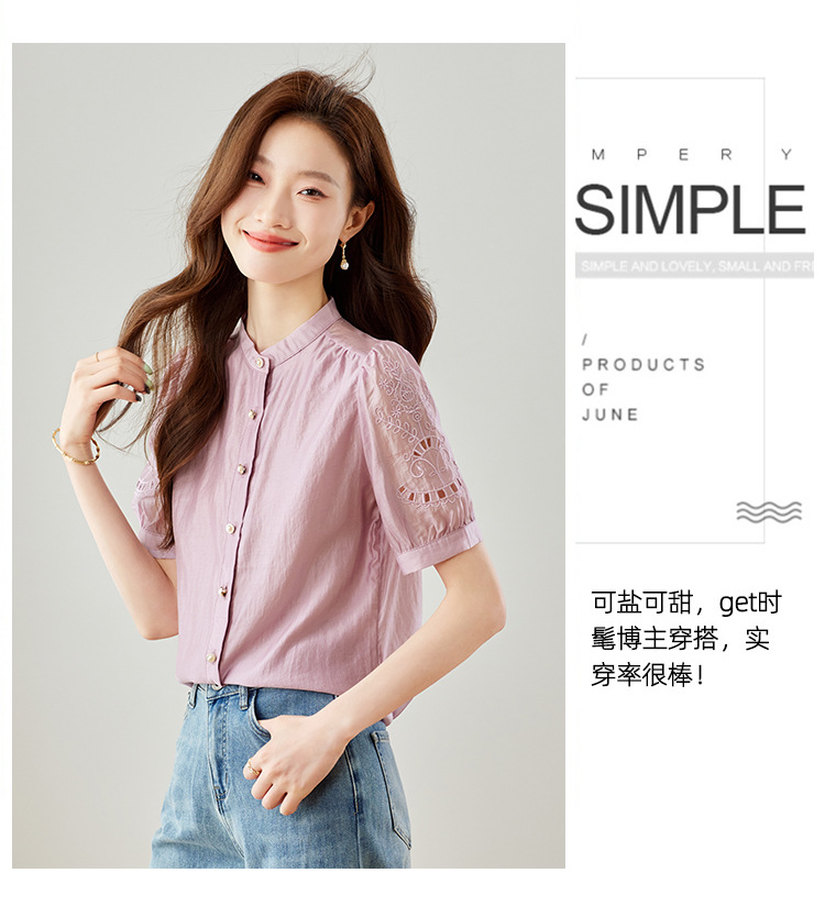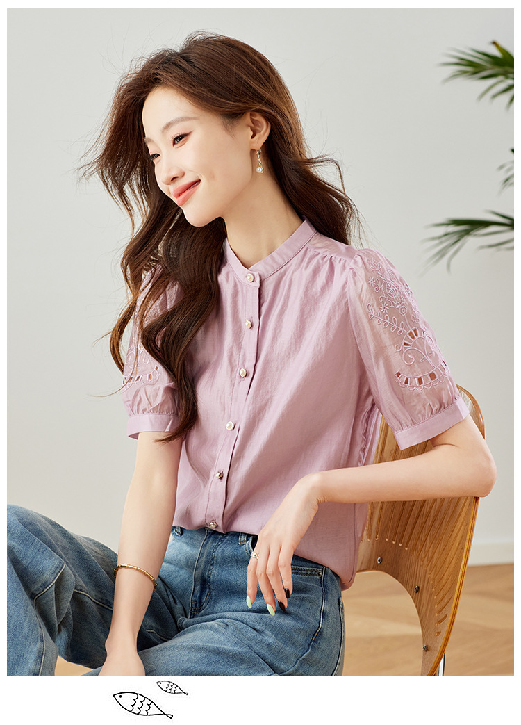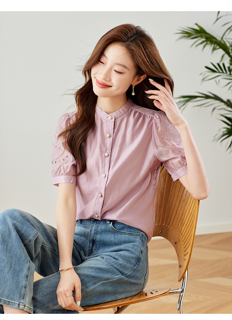 GT 6L 609-A#8551##45~镂空刺绣泡泡袖天丝衬衫女2024夏装法式小衫感别致上衣