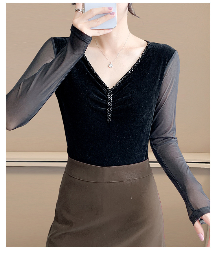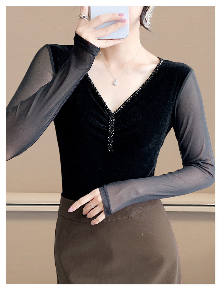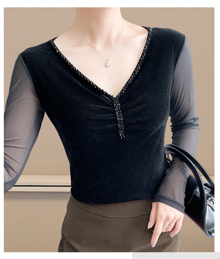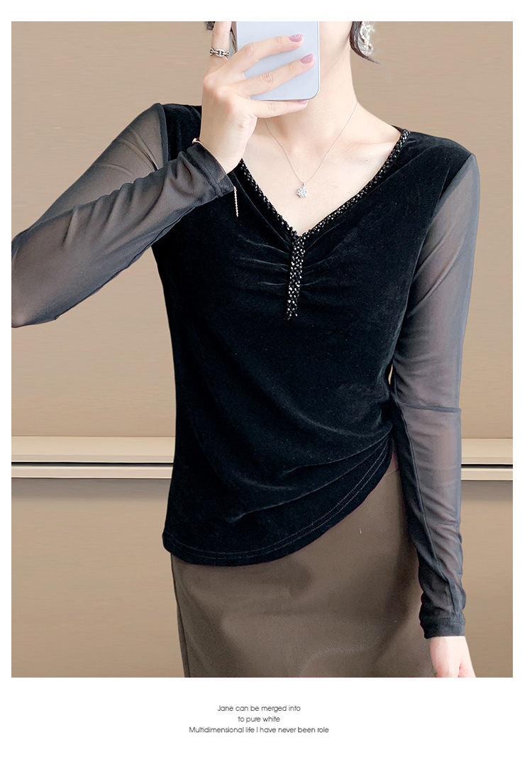 KQL 359H8316时尚修身网纱拼接皱褶钉珠长袖t恤