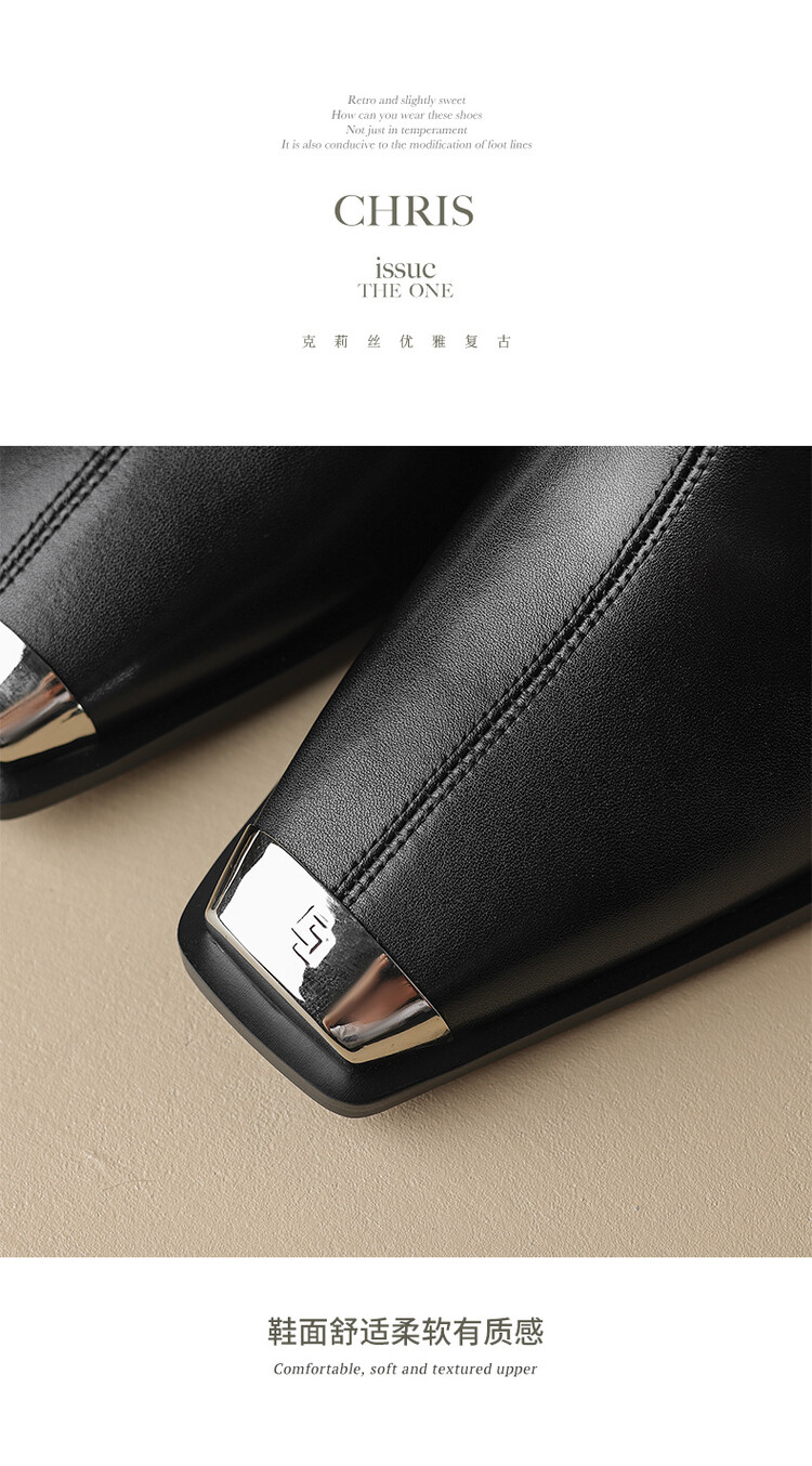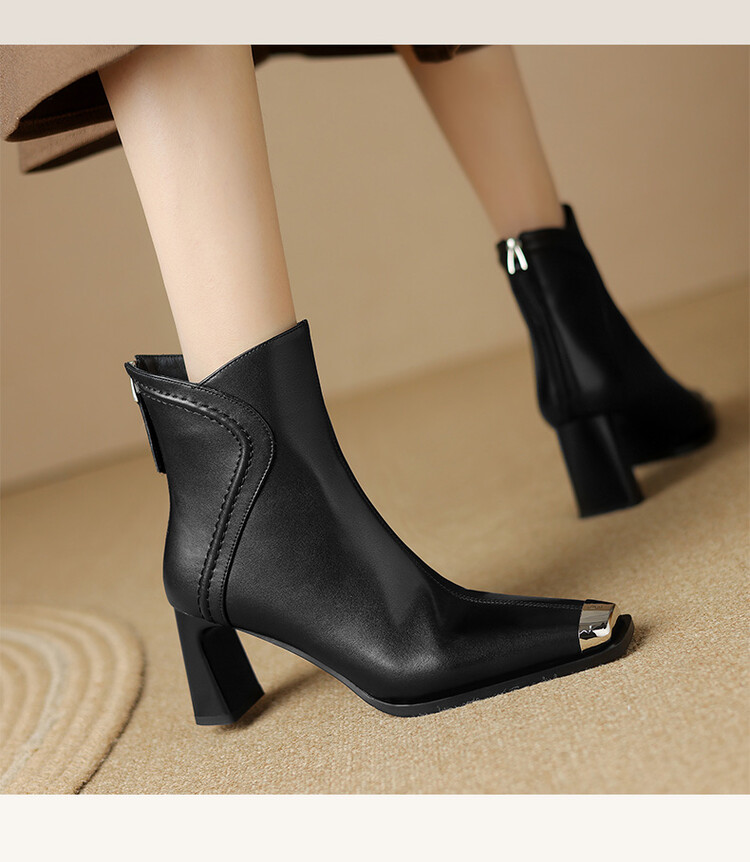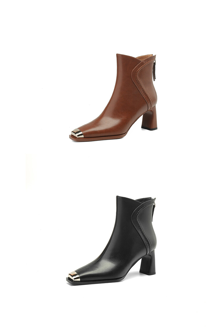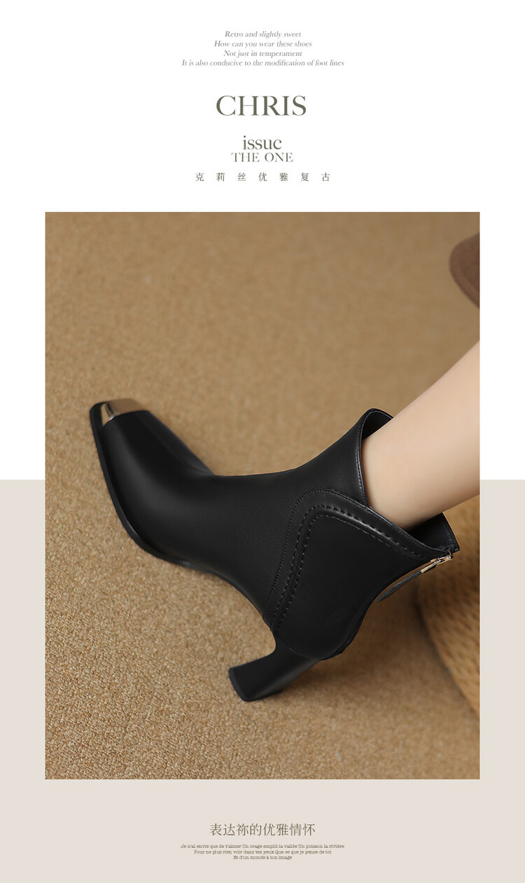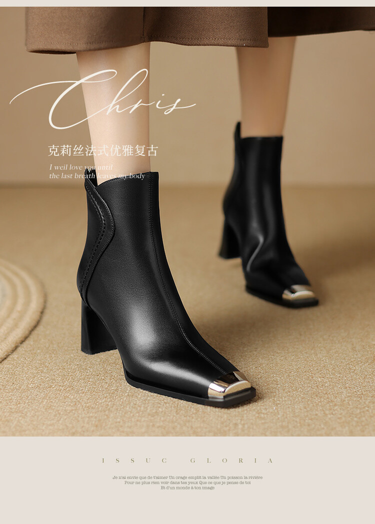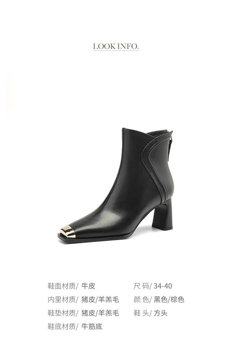 【预售5天】秋冬牛皮金属方头通勤时装靴高跟鞋羊毛里保暖粗跟短靴子女DB&M5758