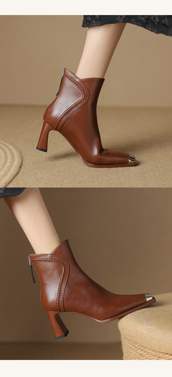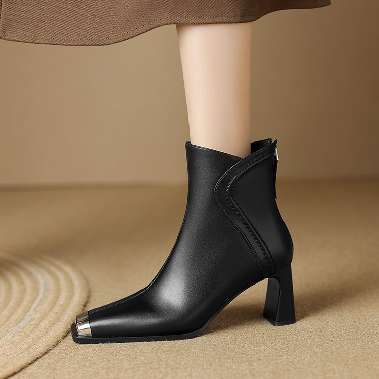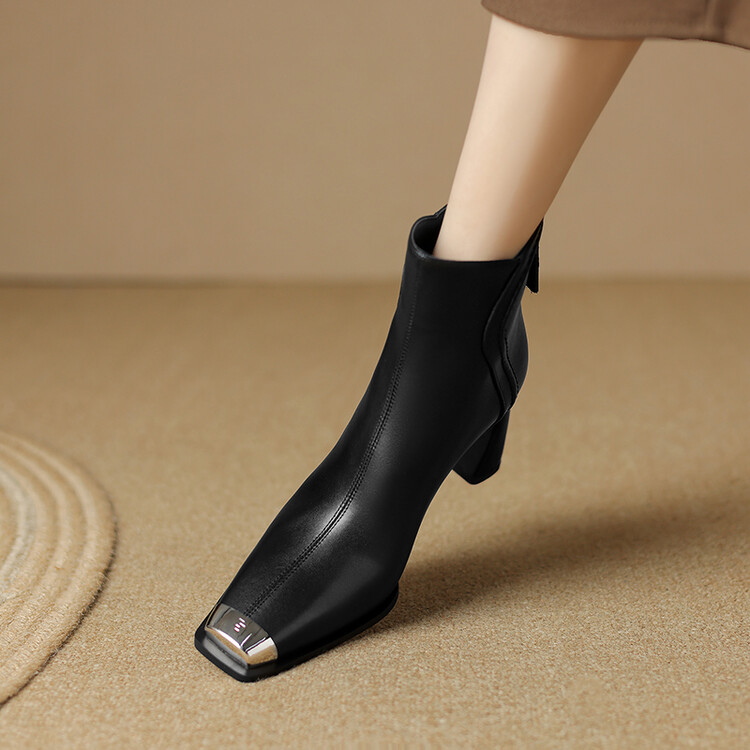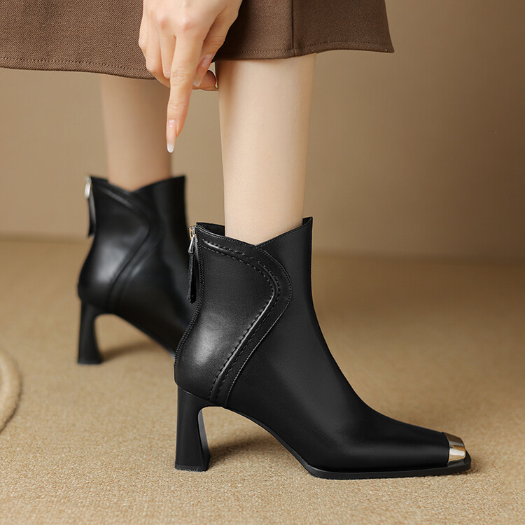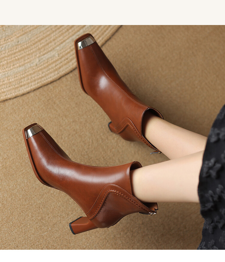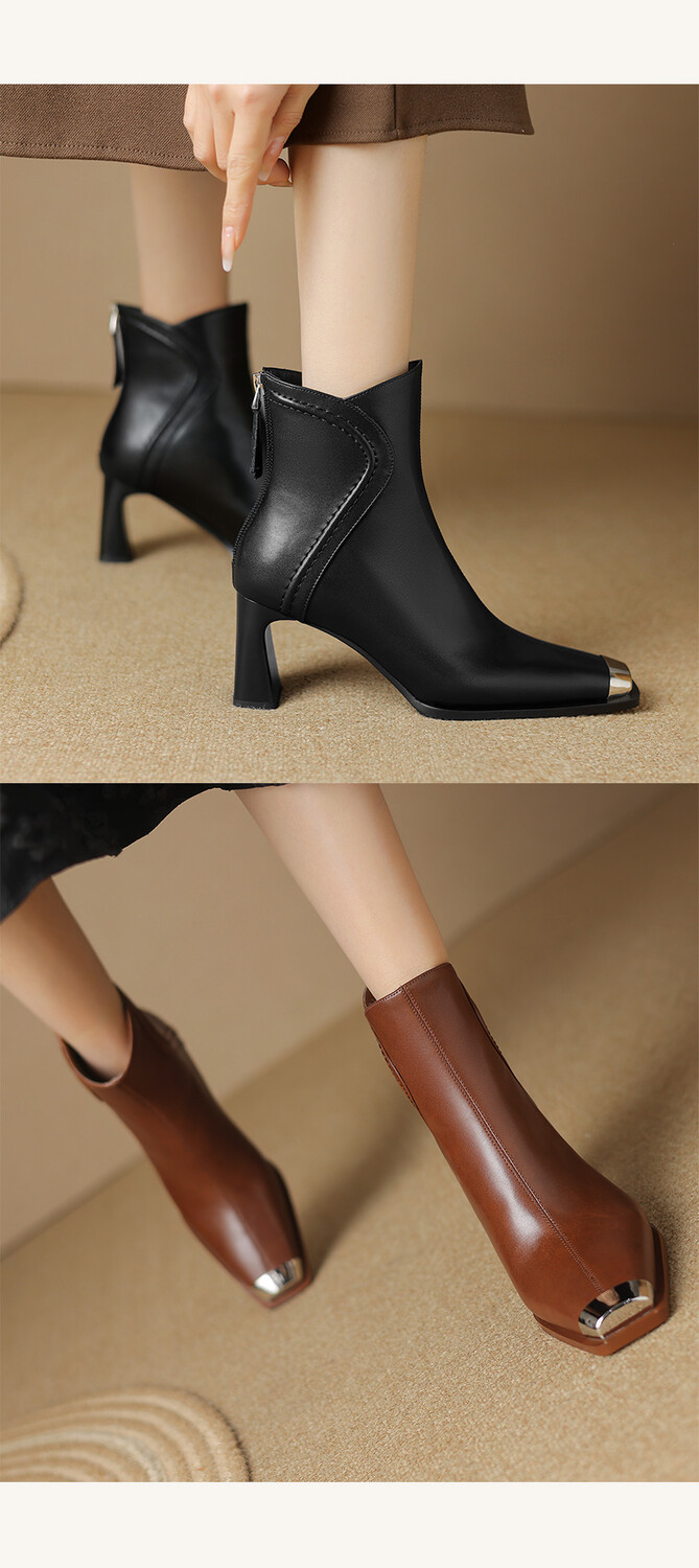 【预售5天】秋冬牛皮金属方头通勤时装靴高跟鞋羊毛里保暖粗跟短靴子女DB&M5758