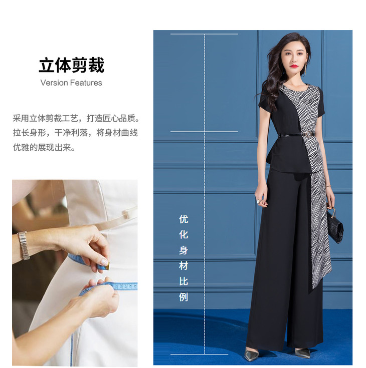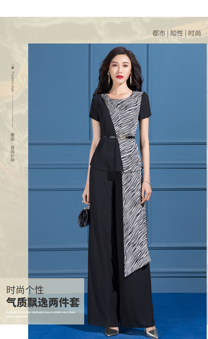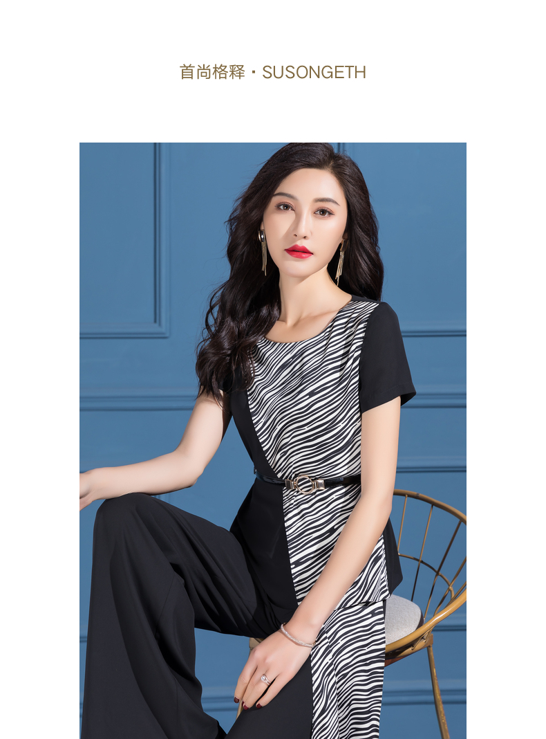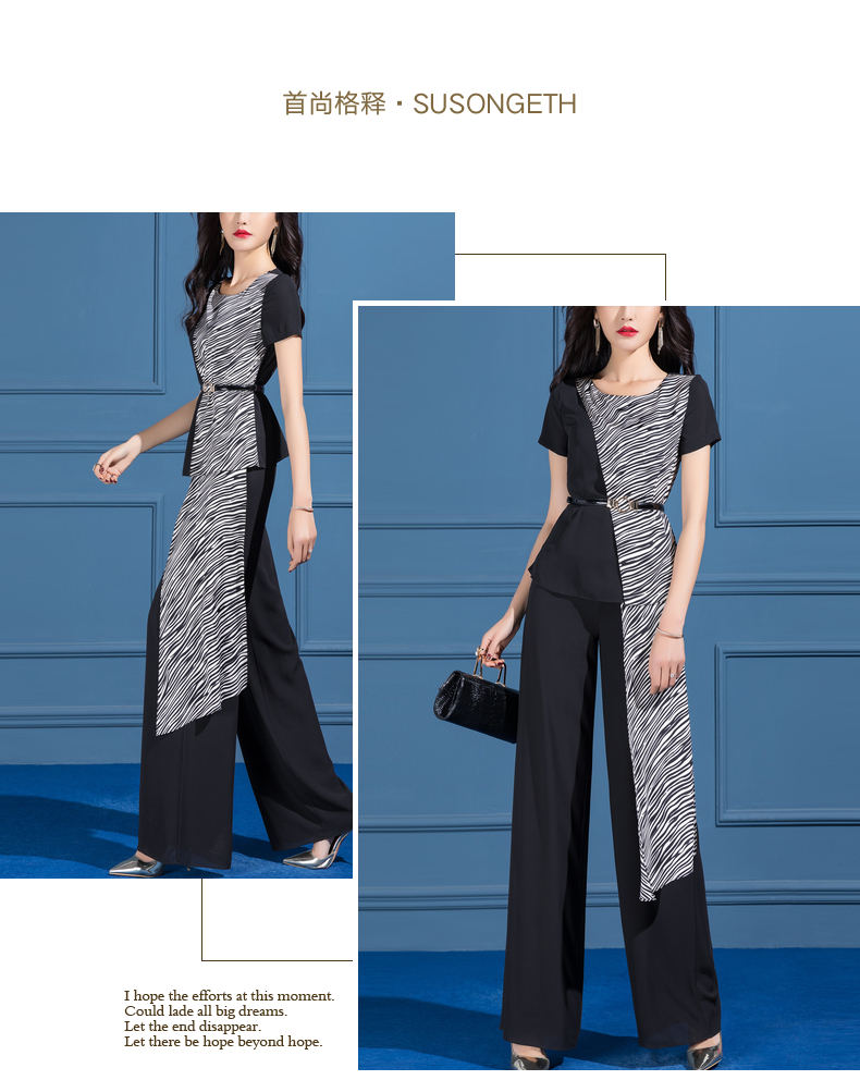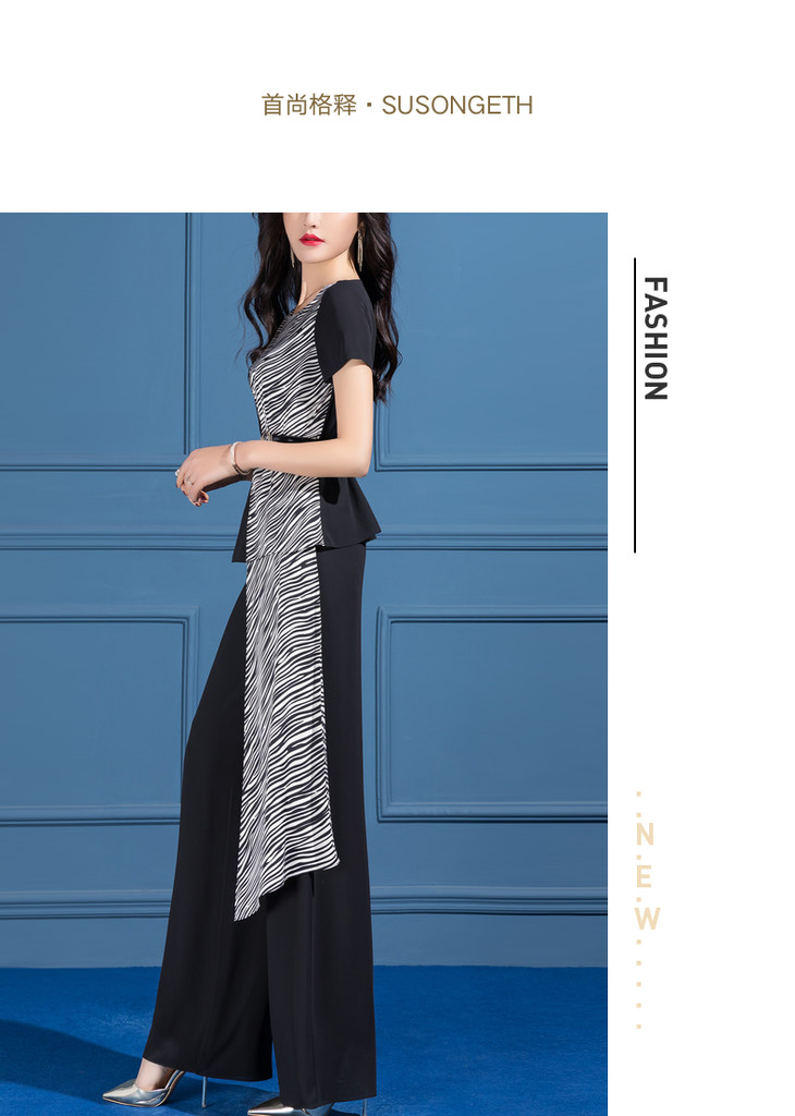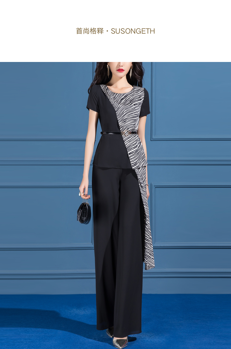 SSGS-Z346阔腿裤套装女夏2021年新款不规则印花拼接雪纺上衣垂感裤子两件套