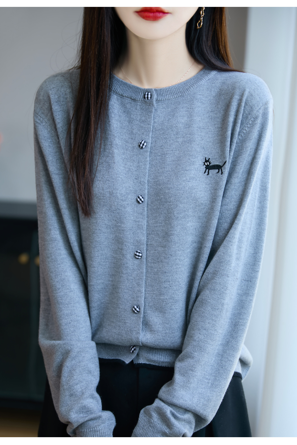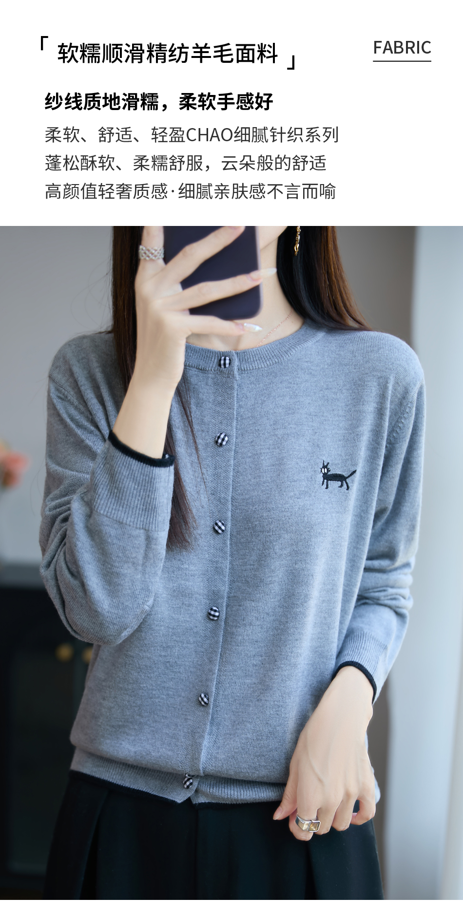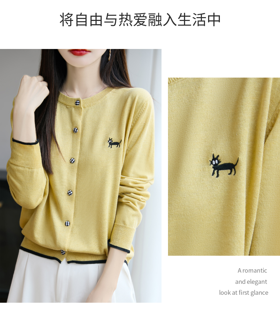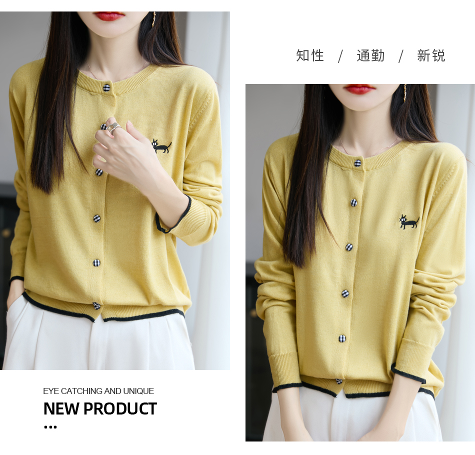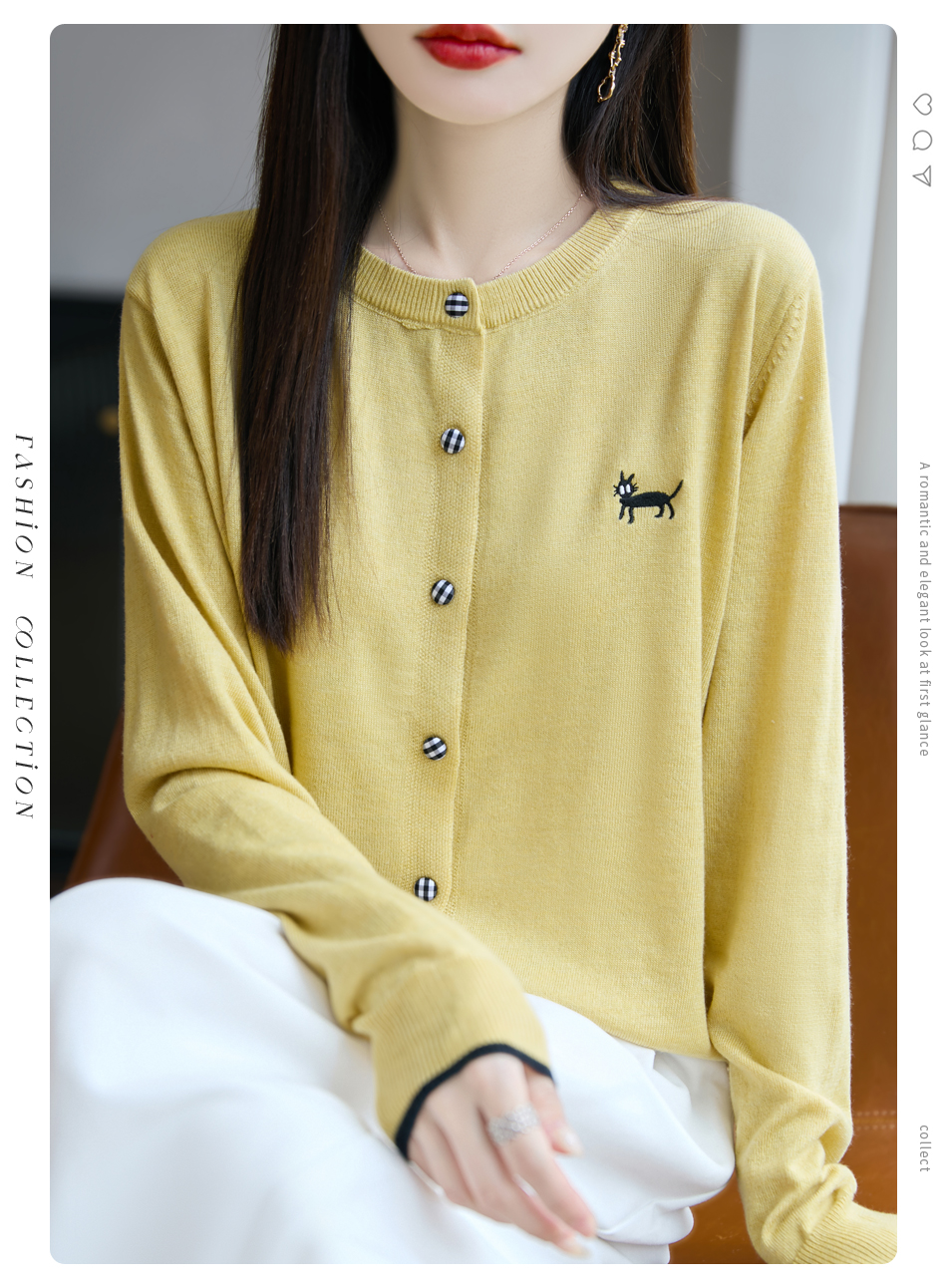 纤束马精纺羊毛小猫刺绣开衫 N-592