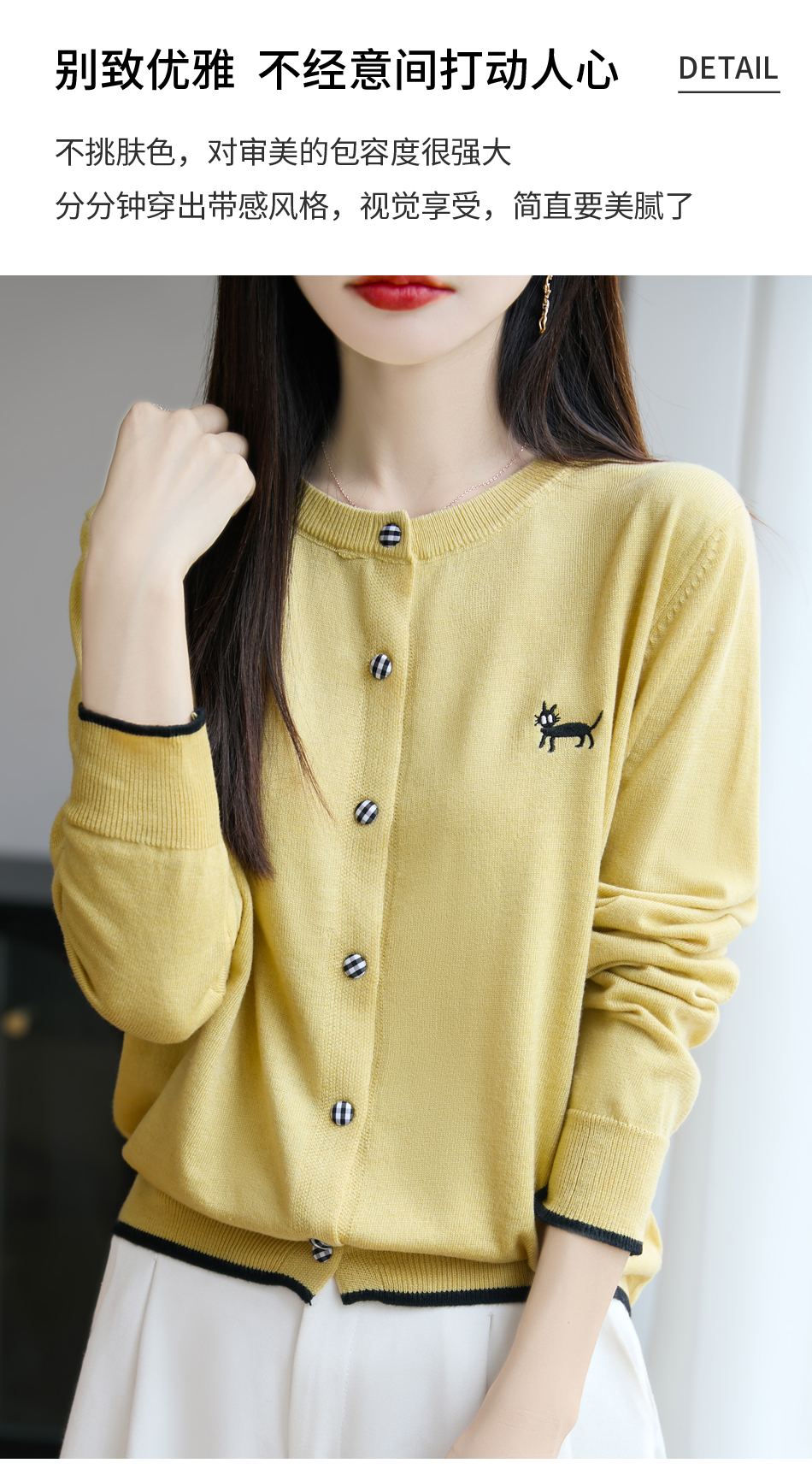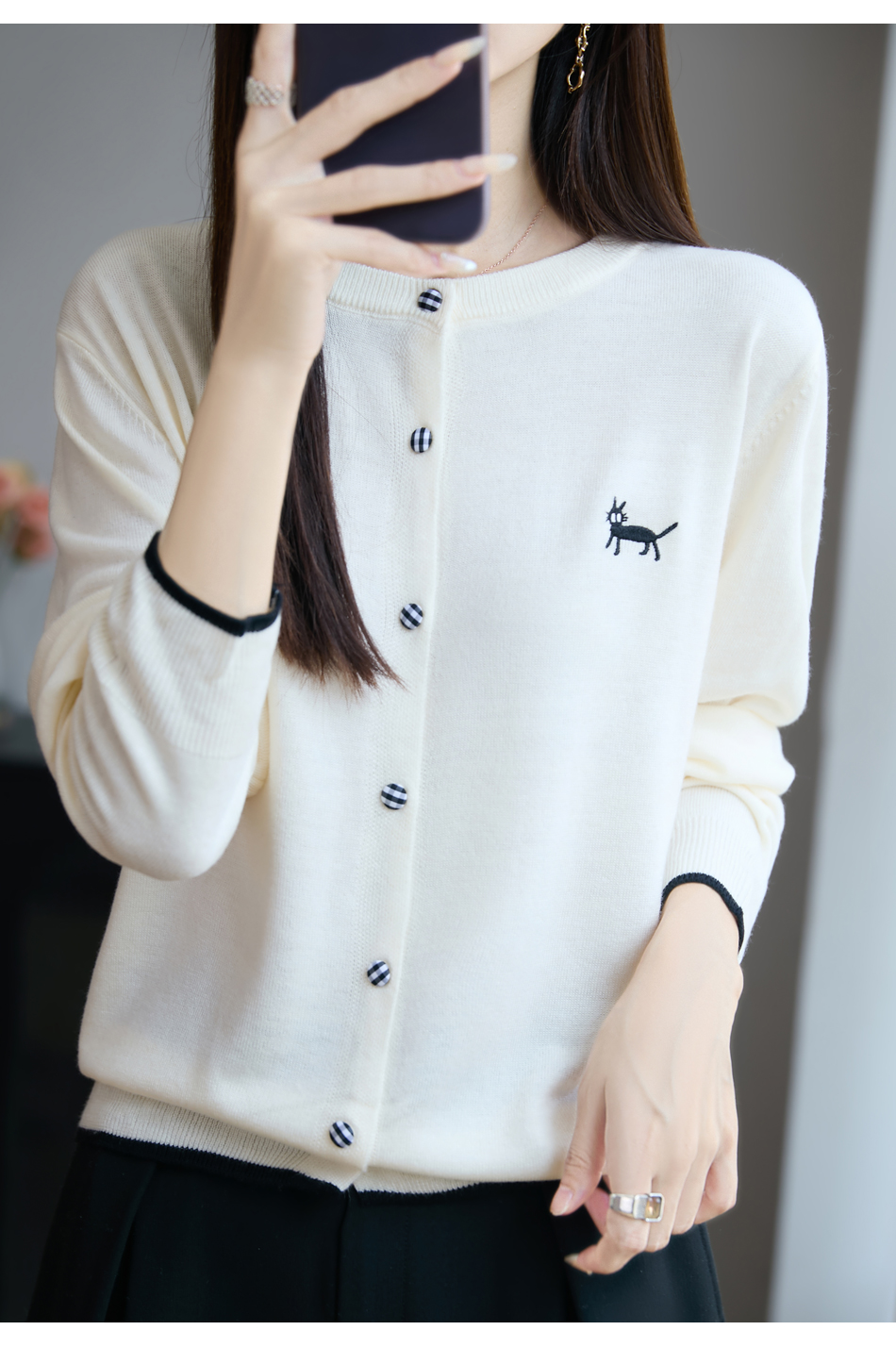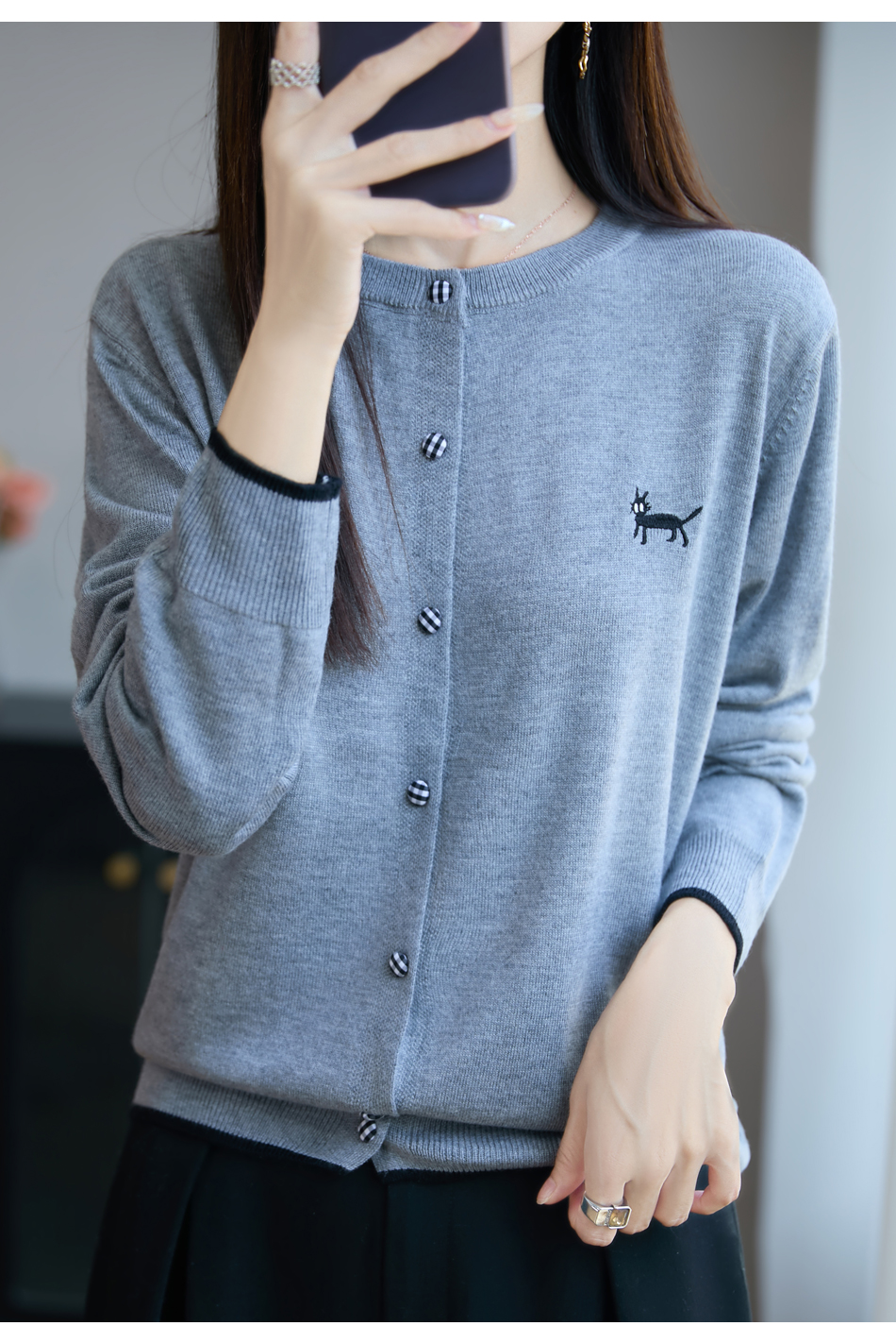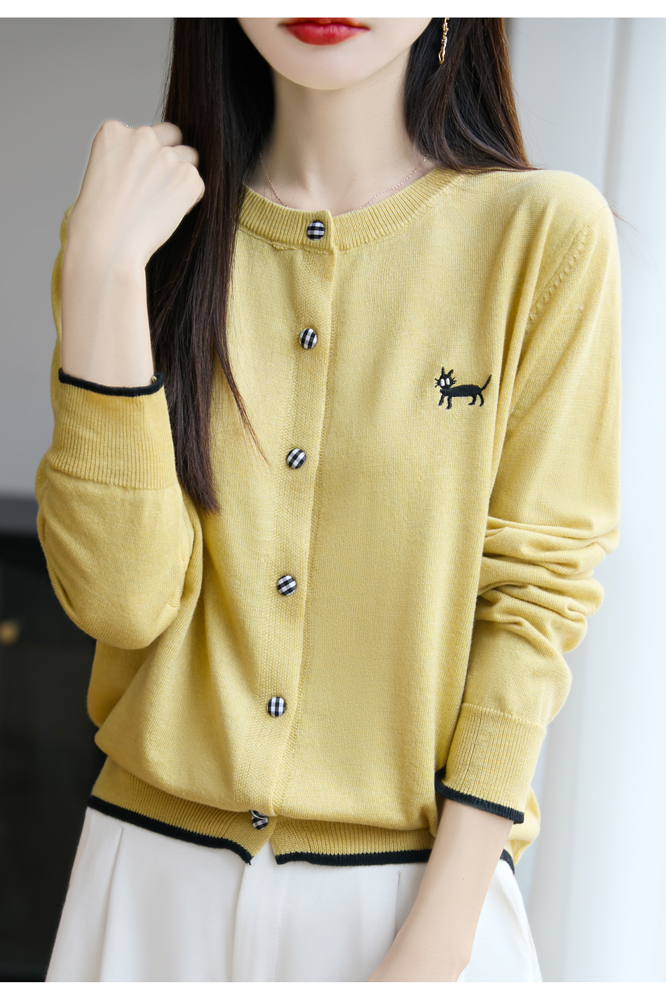 纤束马精纺羊毛小猫刺绣开衫 N-592
