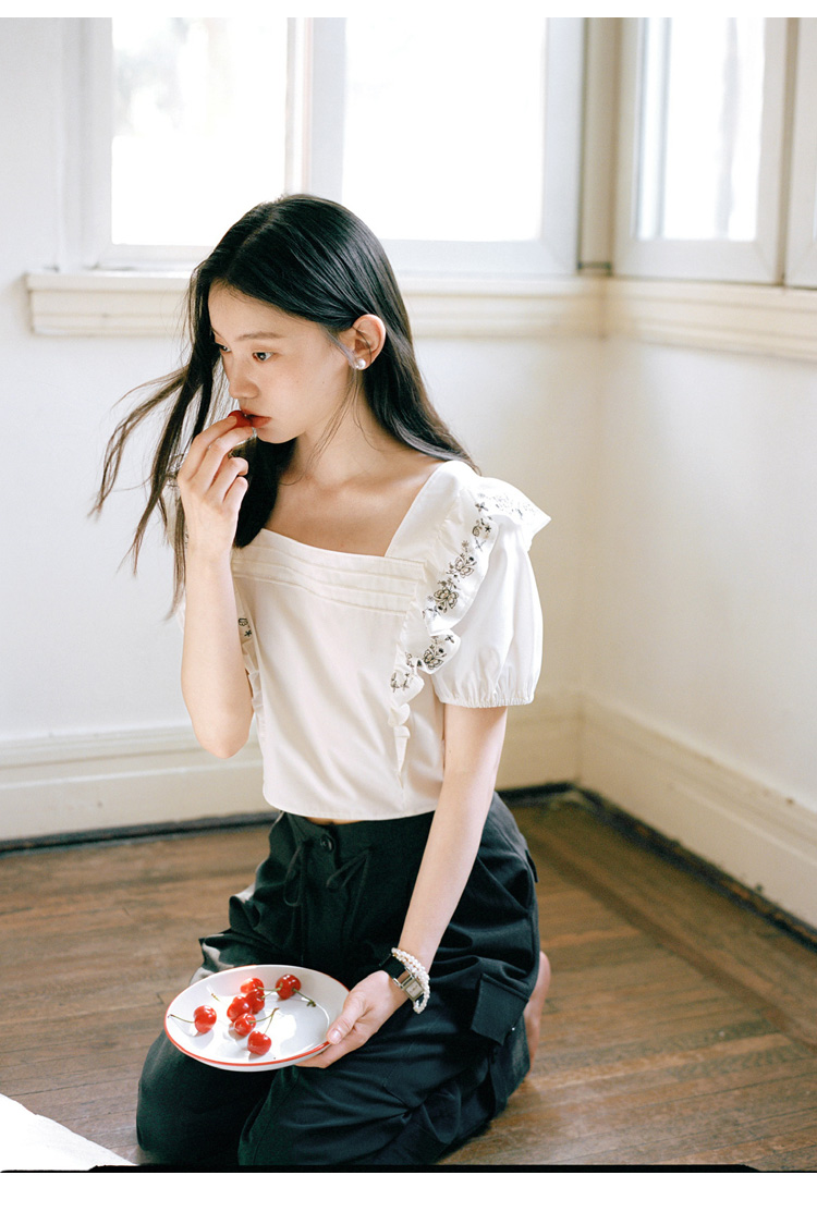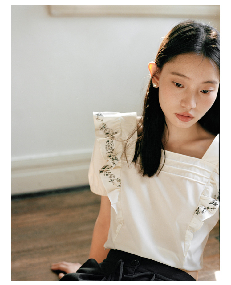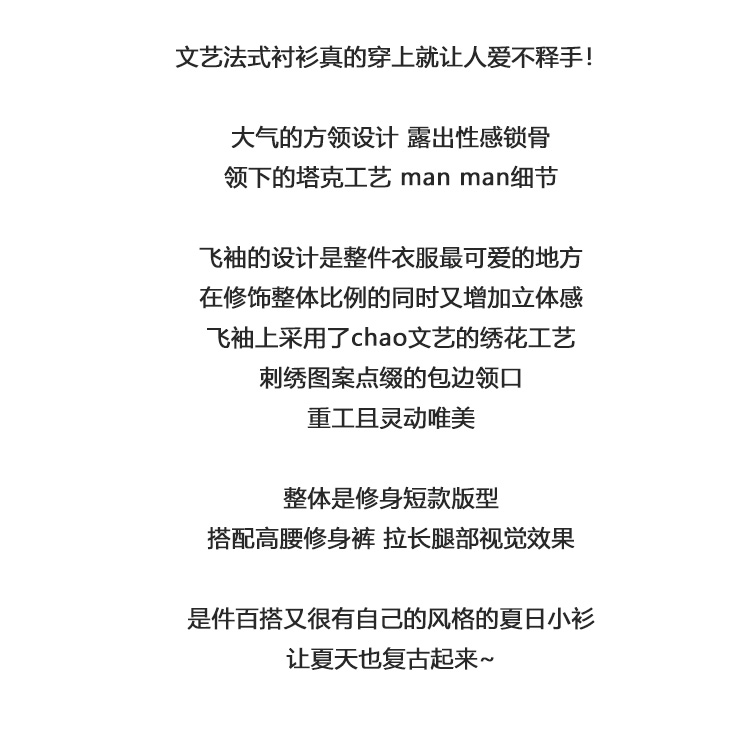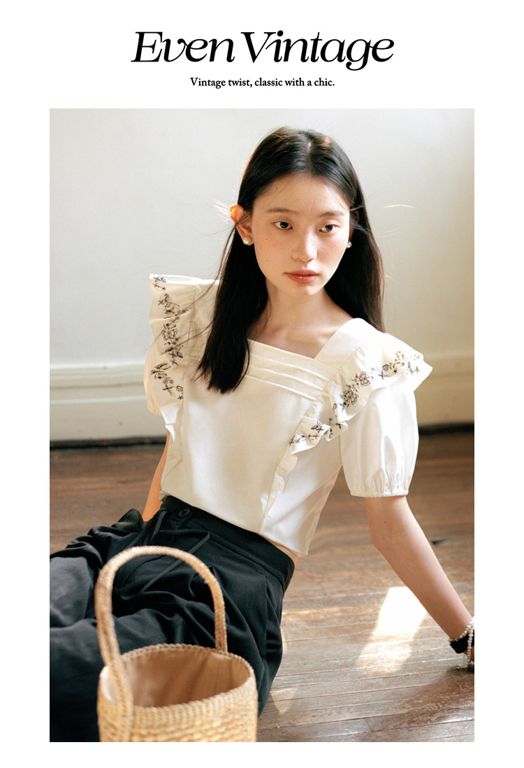 Even Vintage| 重工绣花 原创设计法式方领上衣精致飞袖修身衬衫