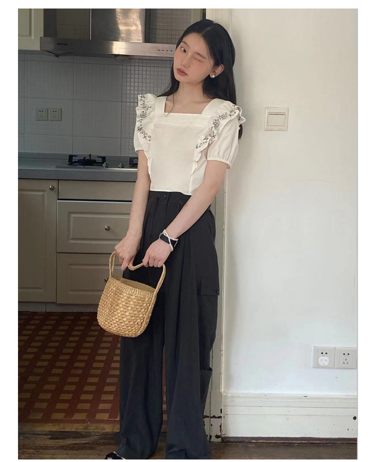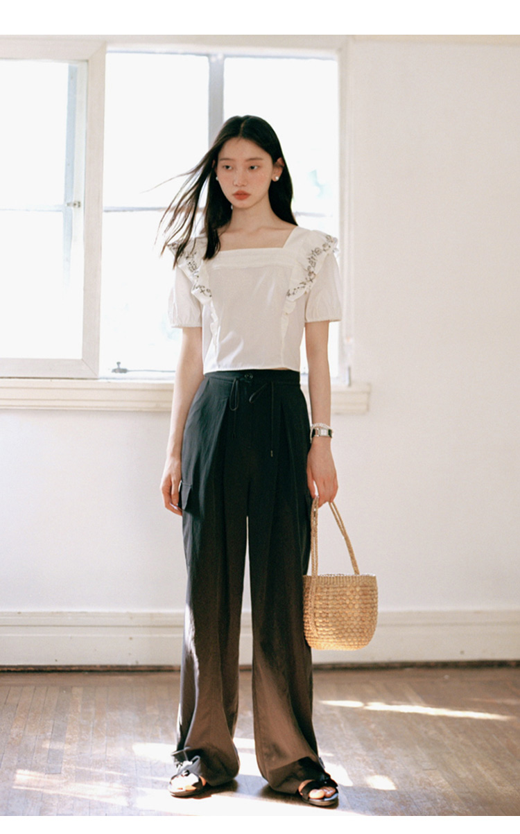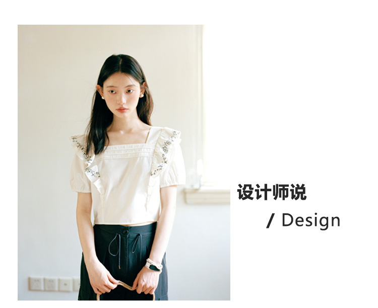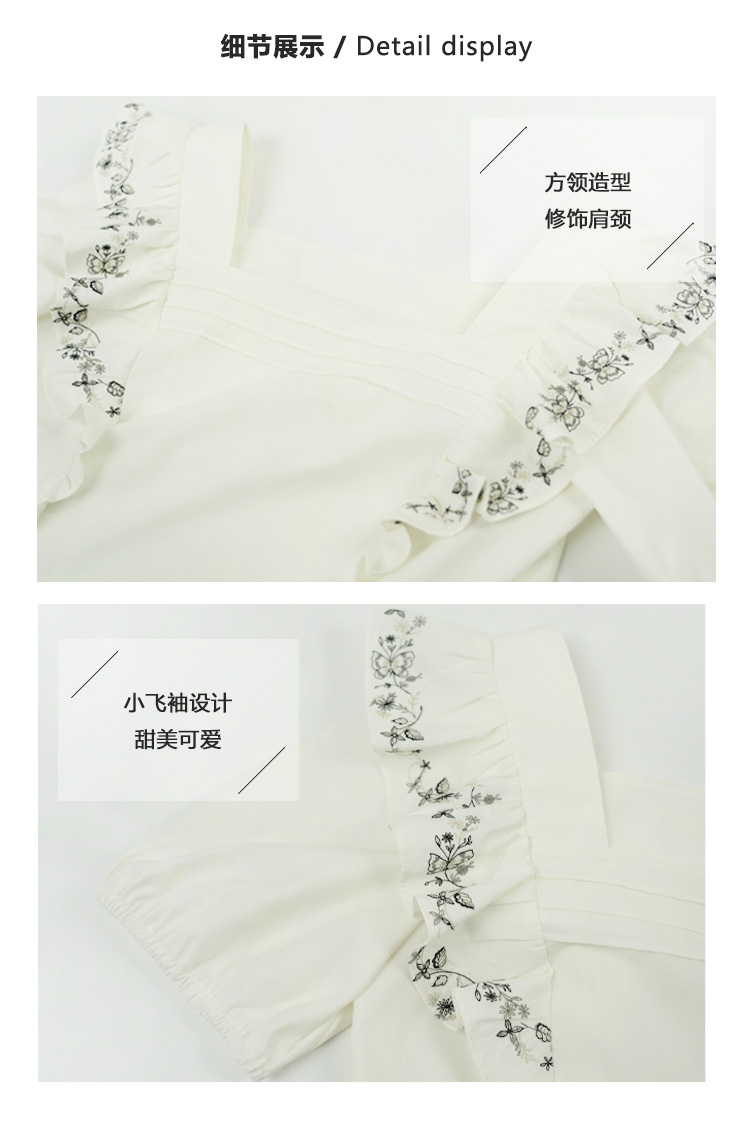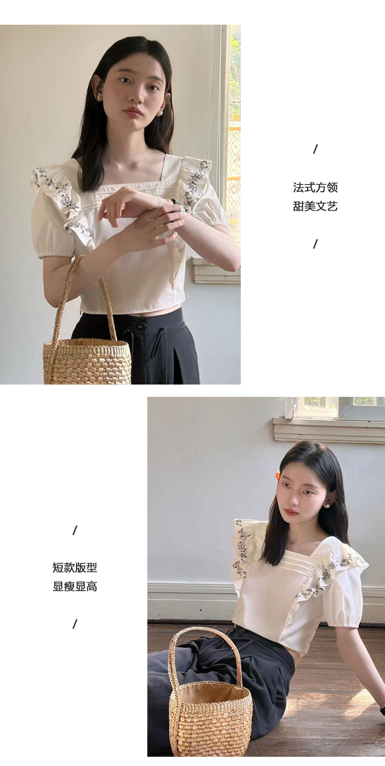 Even Vintage| 重工绣花 原创设计法式方领上衣精致飞袖修身衬衫