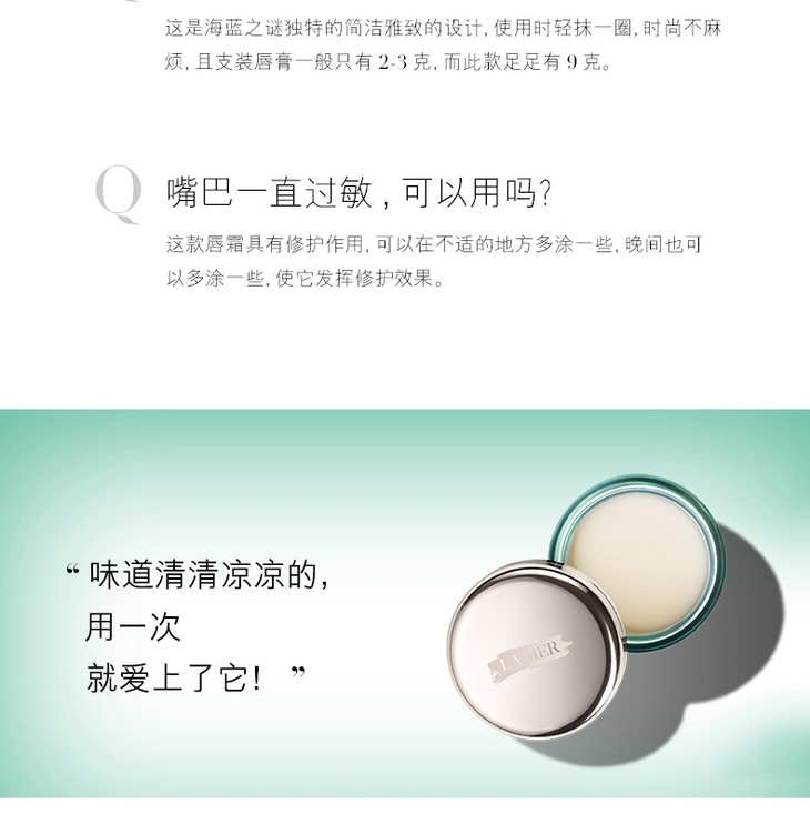 LAMER海蓝之谜护唇膏9g🔥 效果好得不是一般般‼️ 海蓝之谜,睡眠修复唇膜可以当唇膏㊙ 一个月有效去唇纹,唇膏中的爱马仕 ,尤其爱涂口红的😝 很重要 可作唇膜,修护唇霜还可为唇膏打底😍 有助于均匀上色,单独使用亦能使双唇透出自然柔嫩、丰盈、细致的光采。🌷 这个对纹完唇的妞修复也超级好。‼️