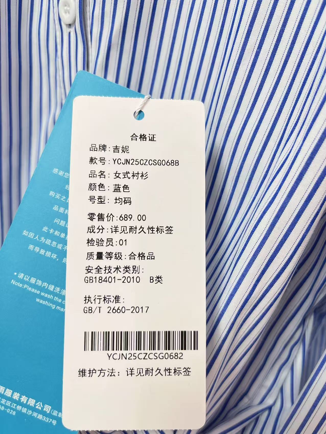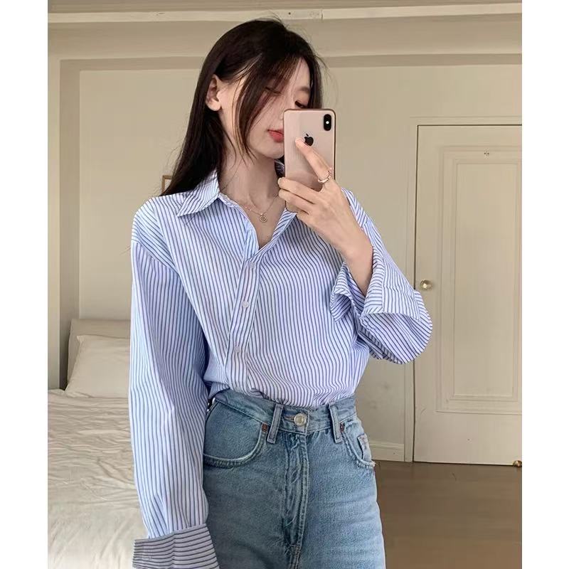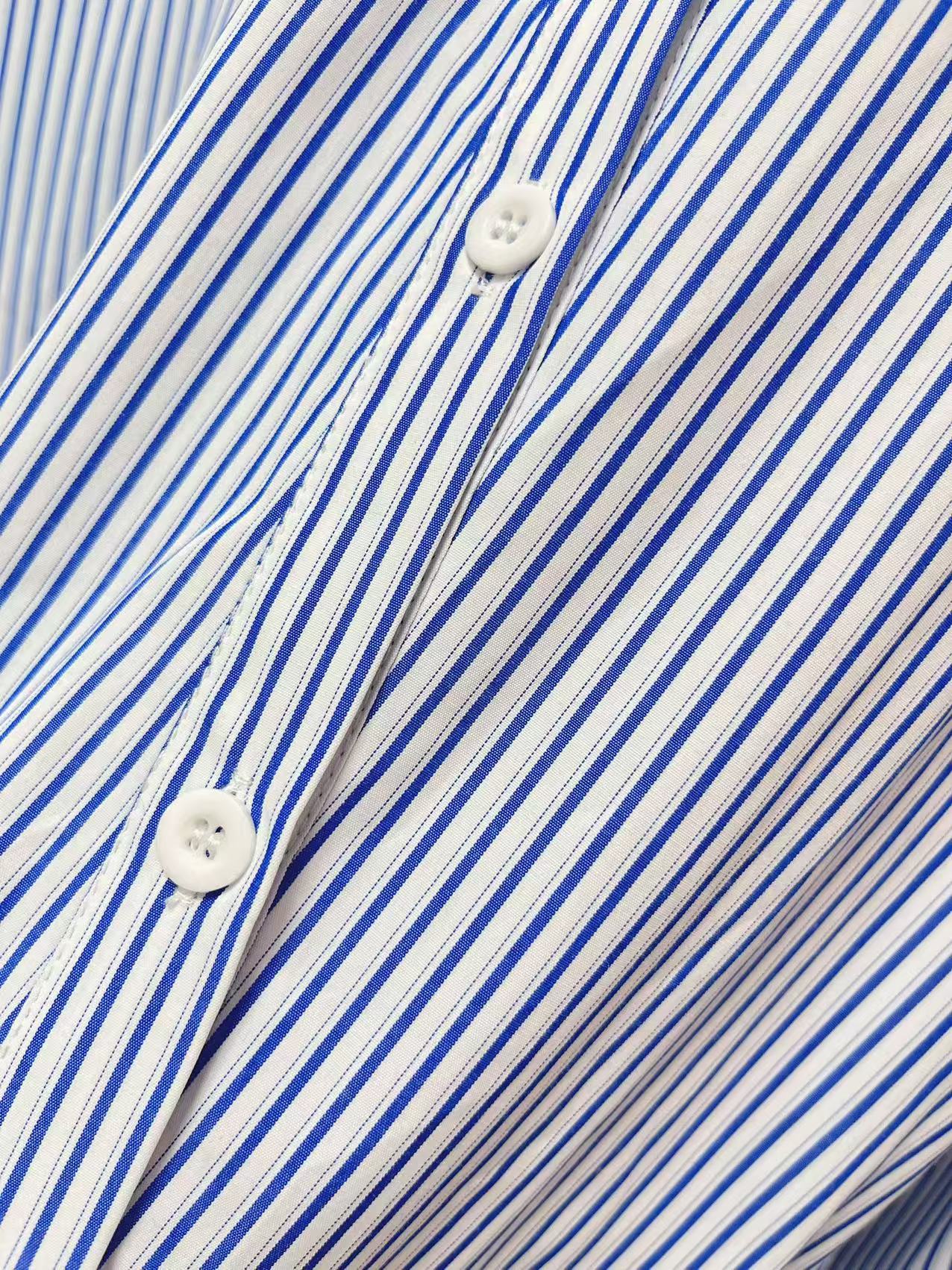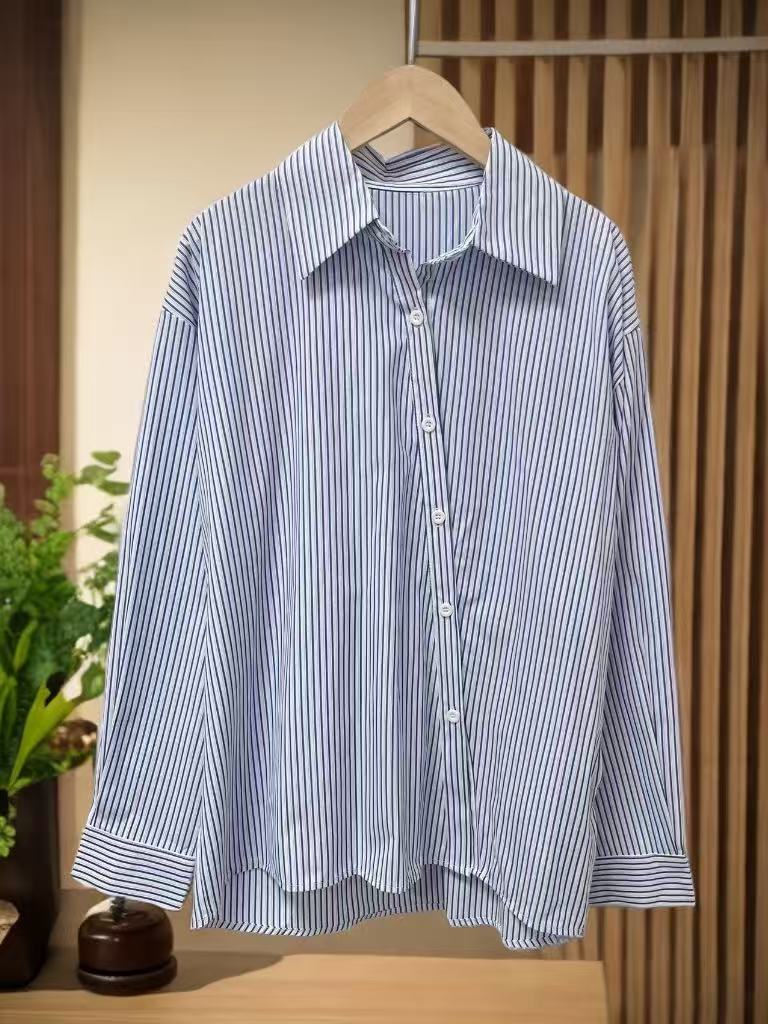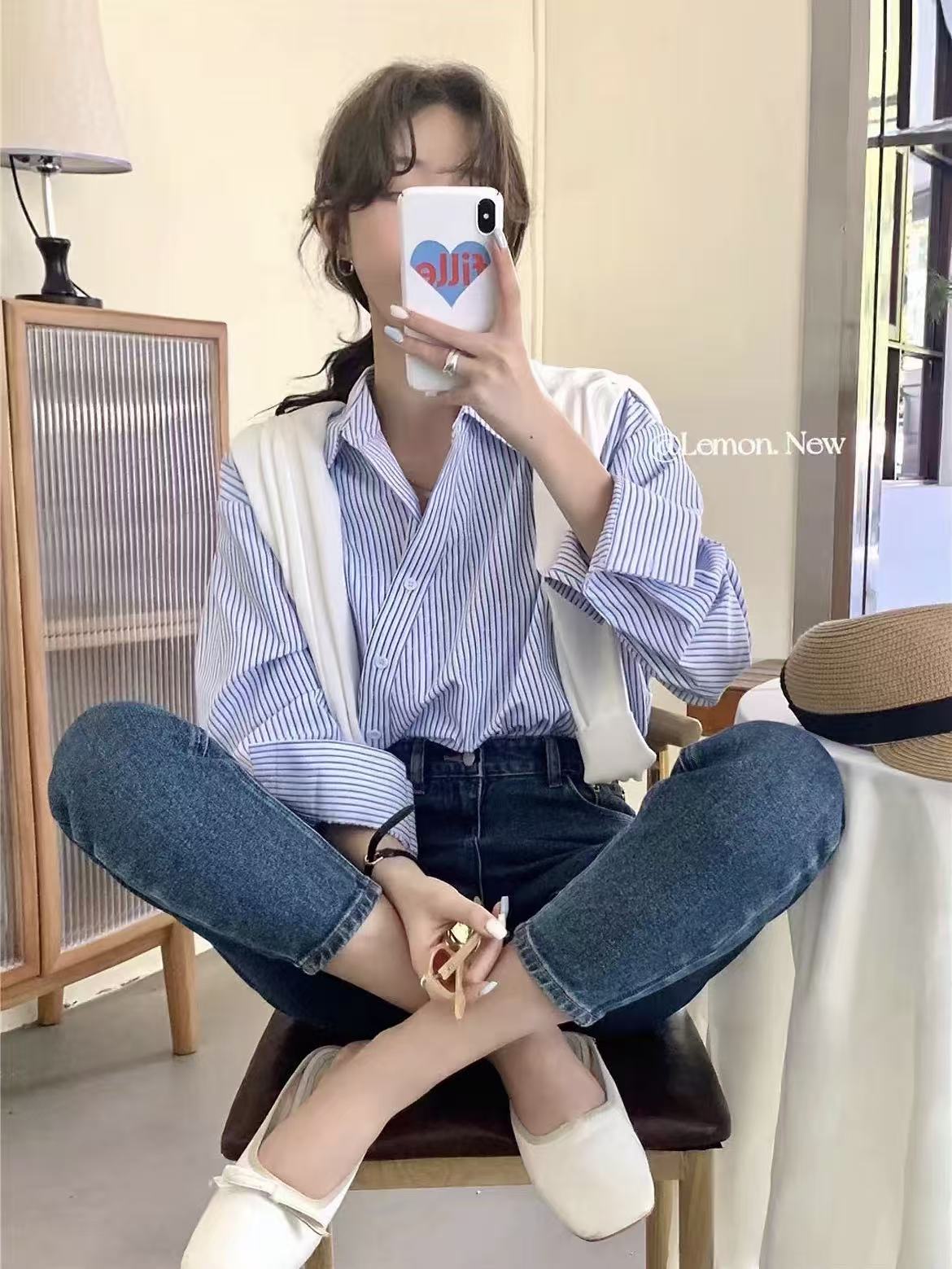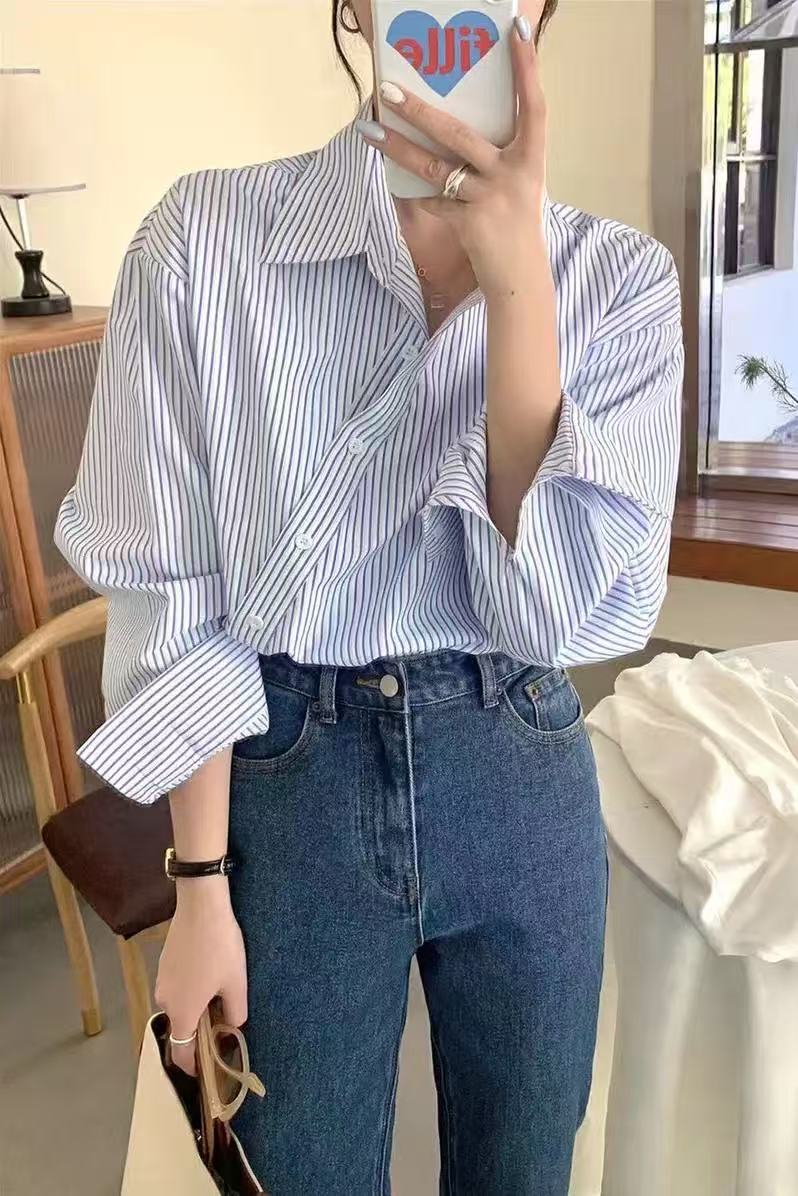 【秋上新】吉妮品牌 068B蓝色斜开扣设计感条纹衬衫-喜出