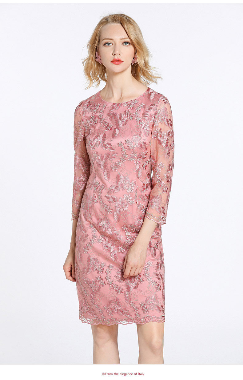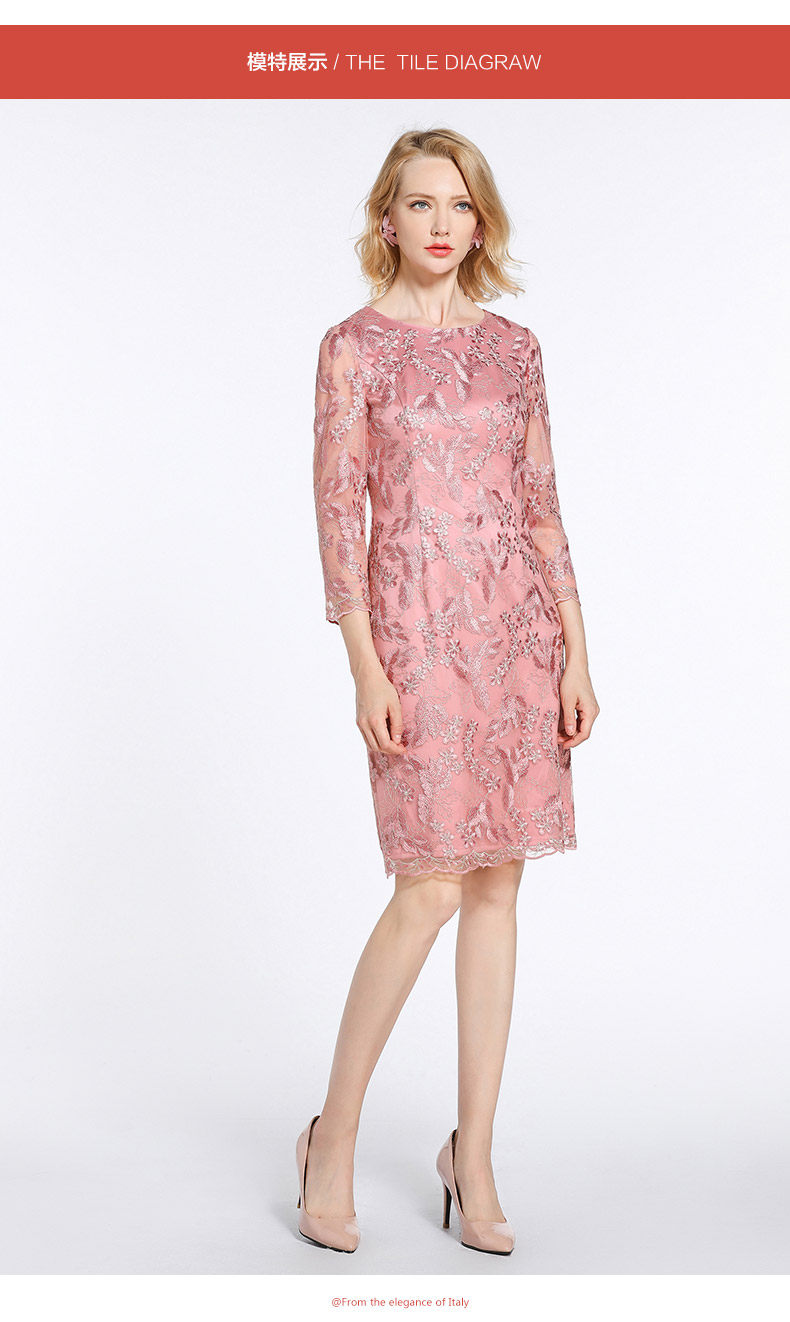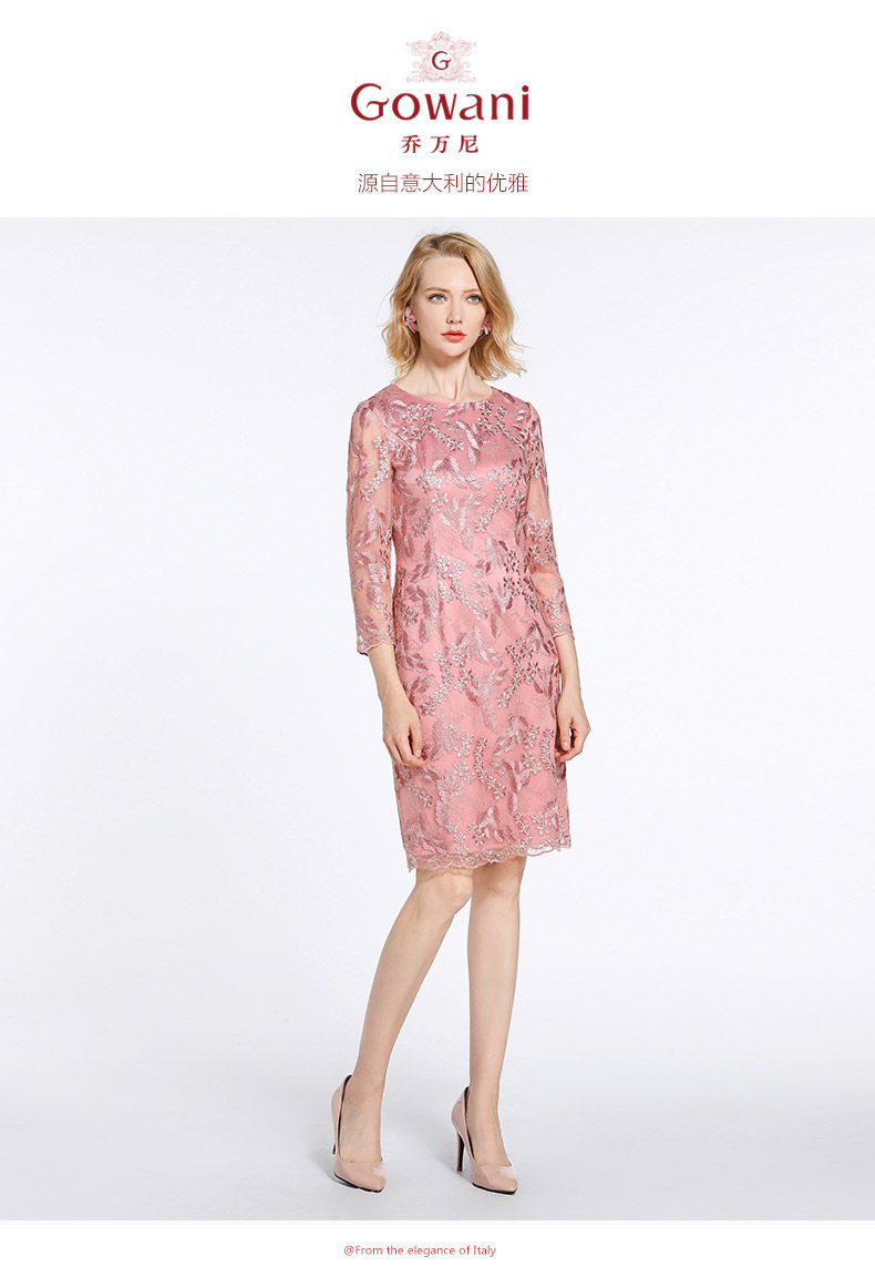 乔万尼春装女蕾丝气质修身绣花红装七分袖连衣裙EB3E230