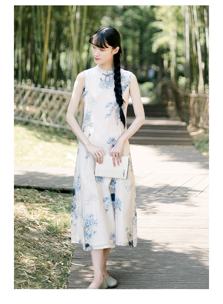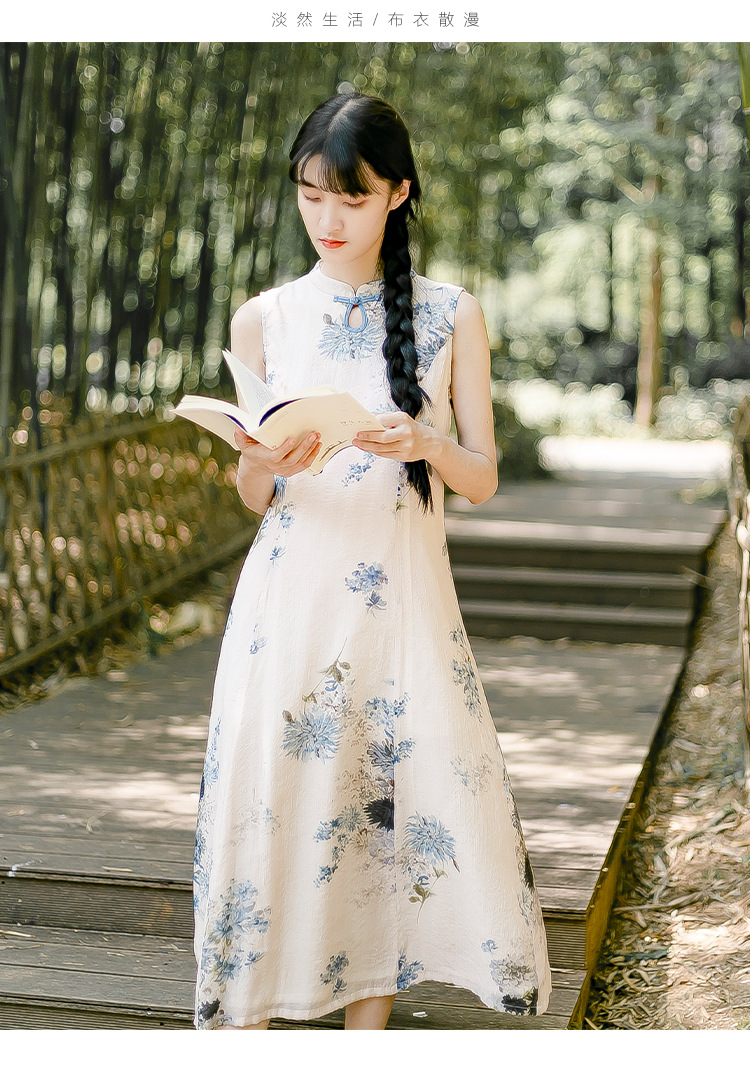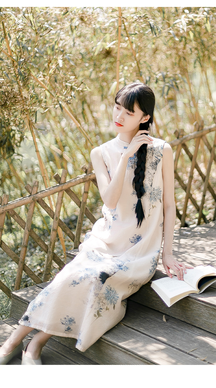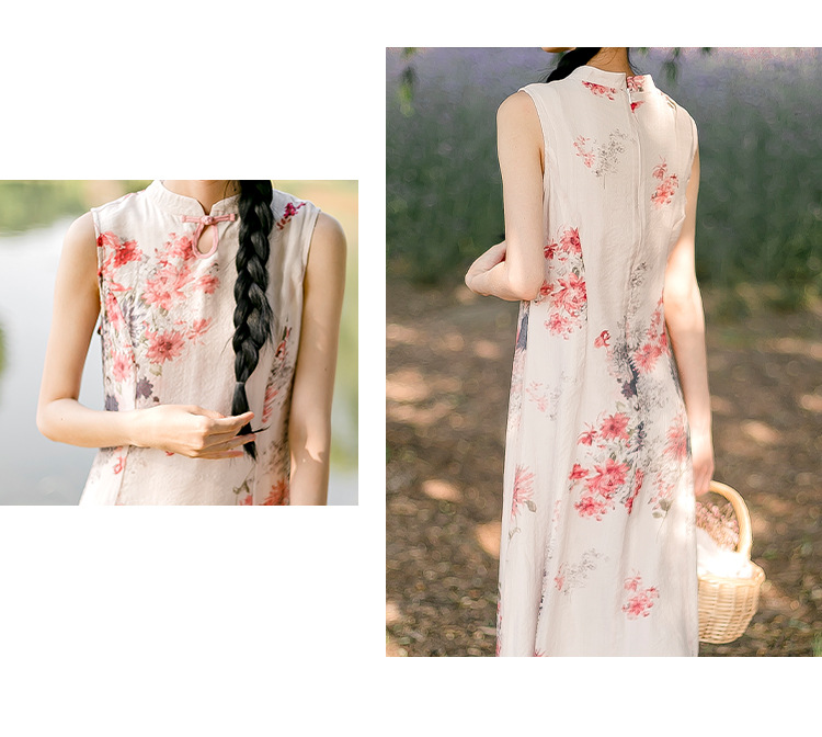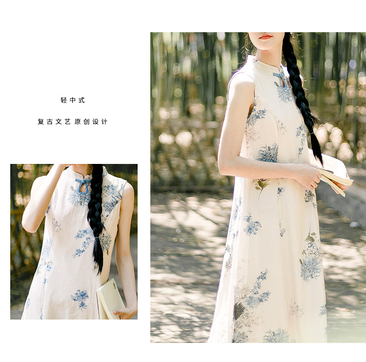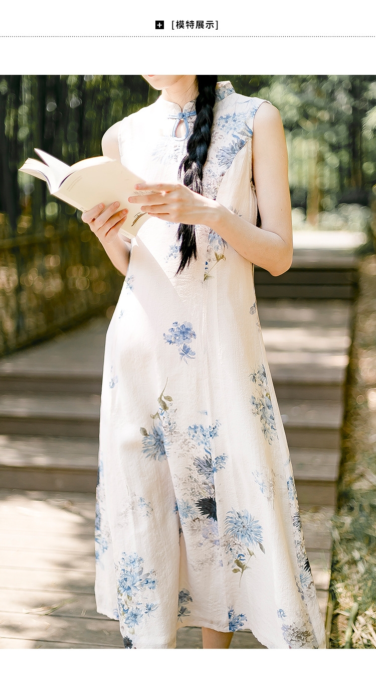 YM-9665棉麻印花 文艺优雅飘逸无袖丝麻立领收腰A字裙