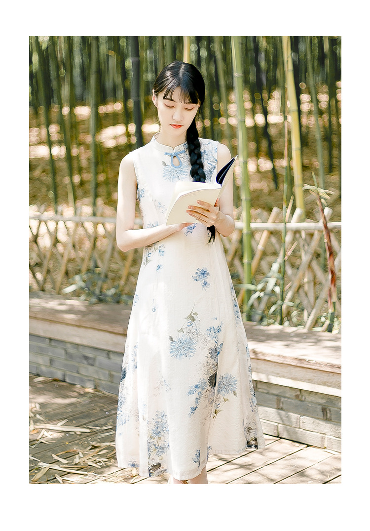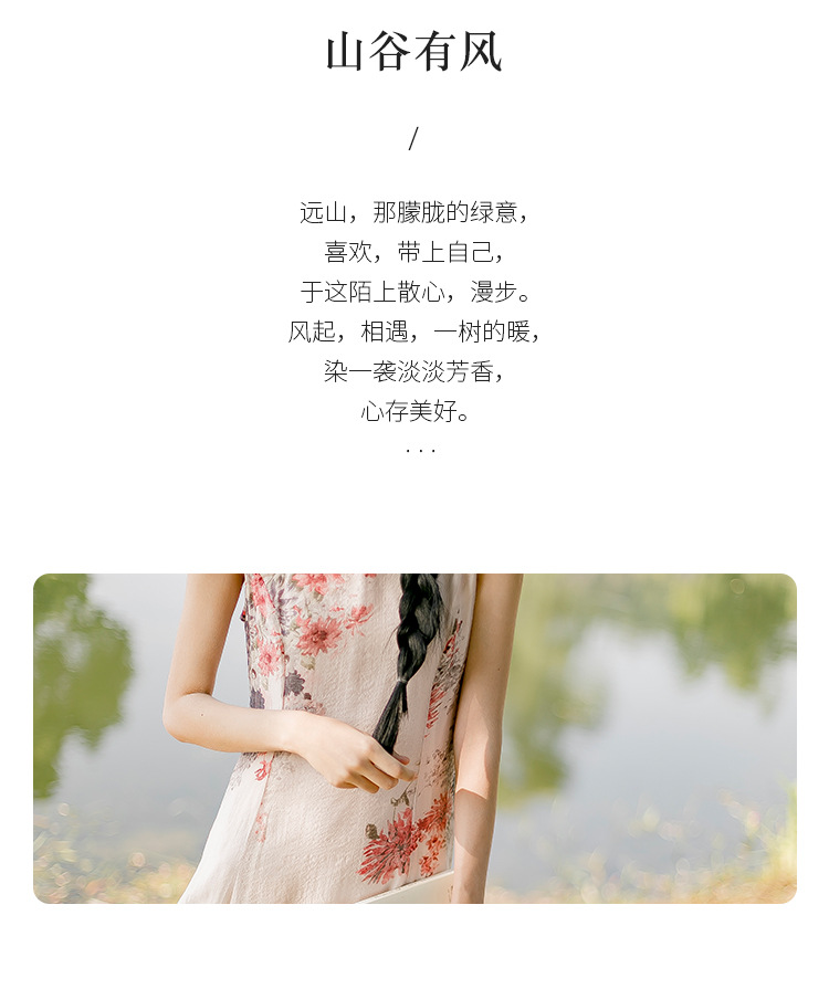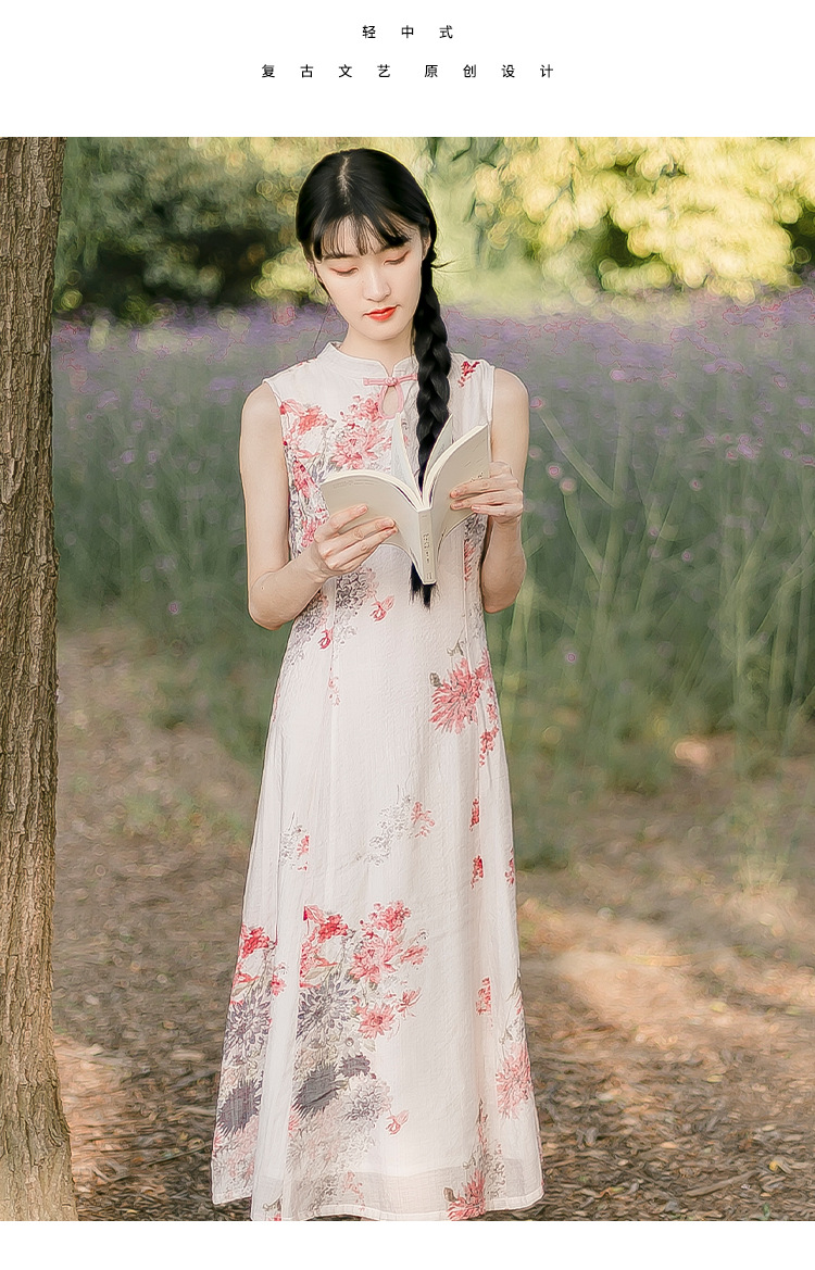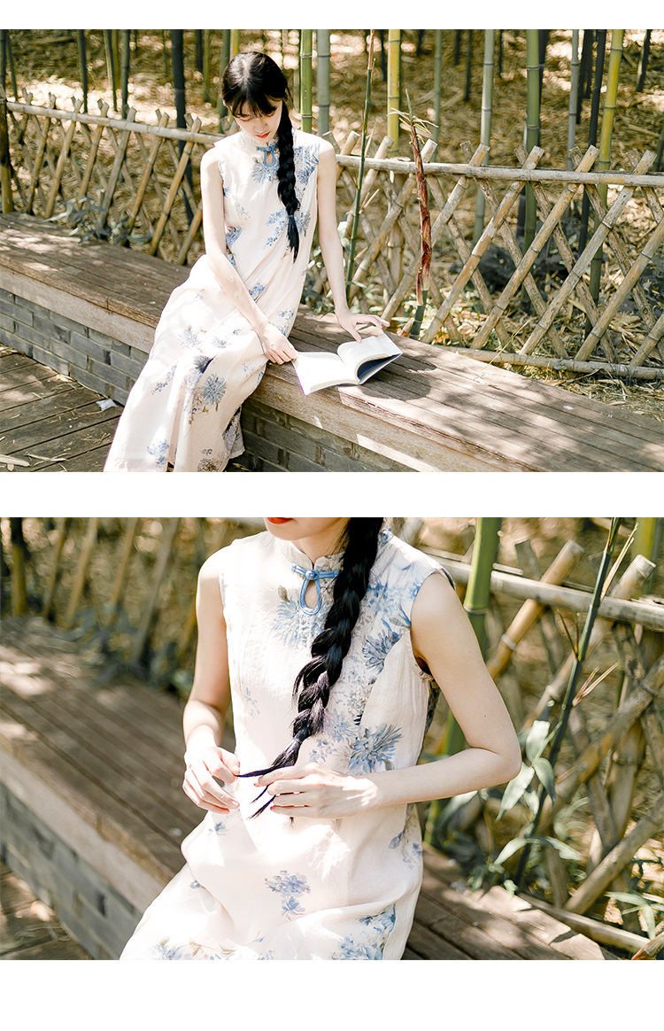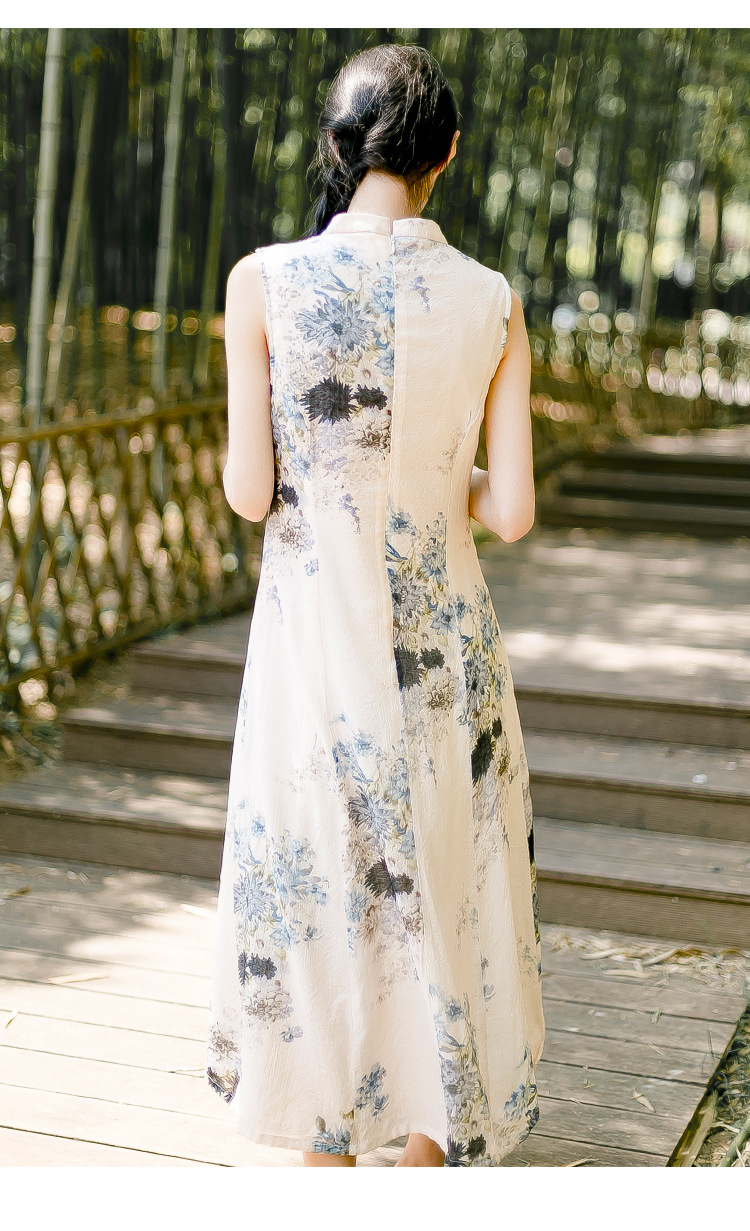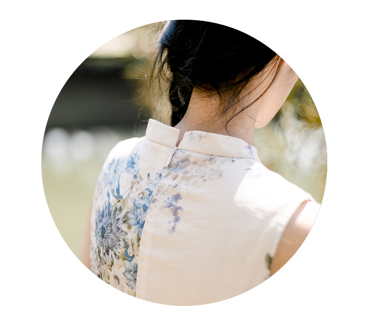 YM-9665棉麻印花 文艺优雅飘逸无袖丝麻立领收腰A字裙
