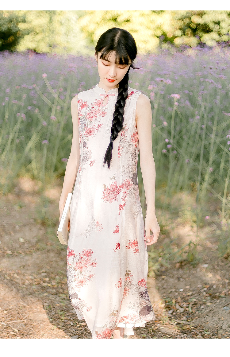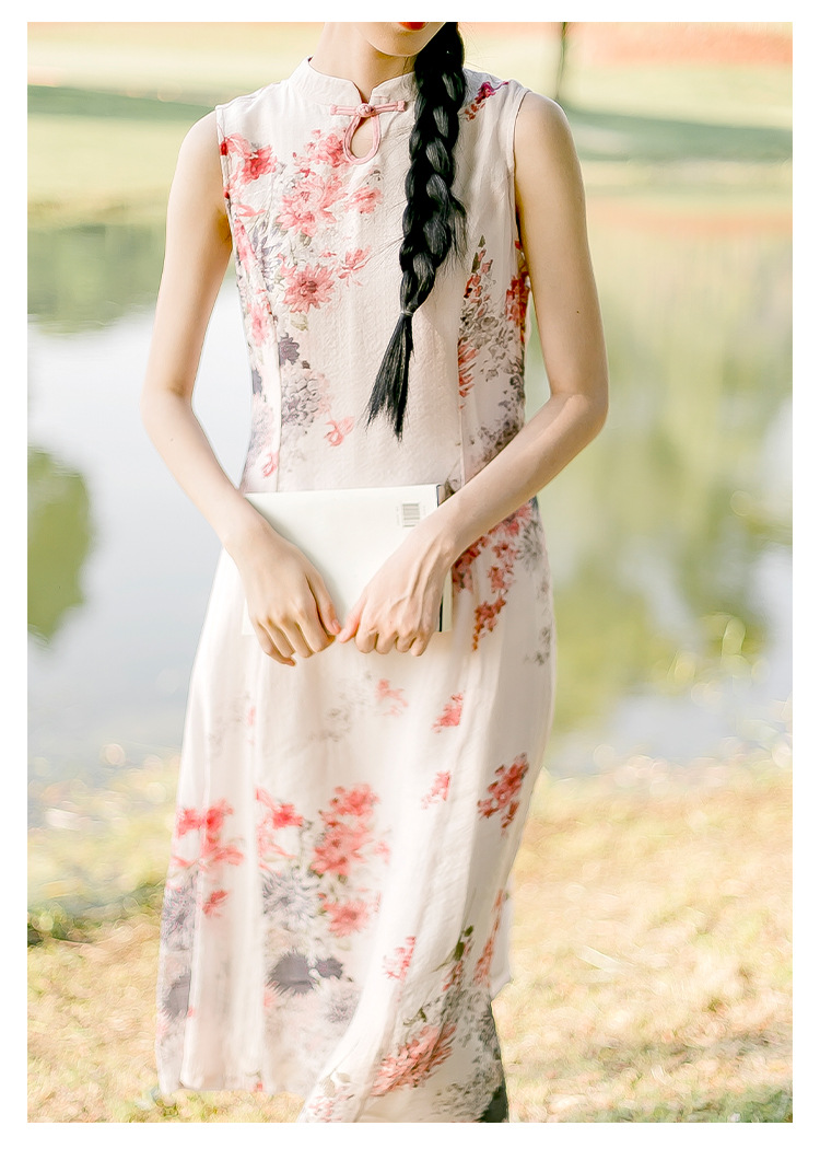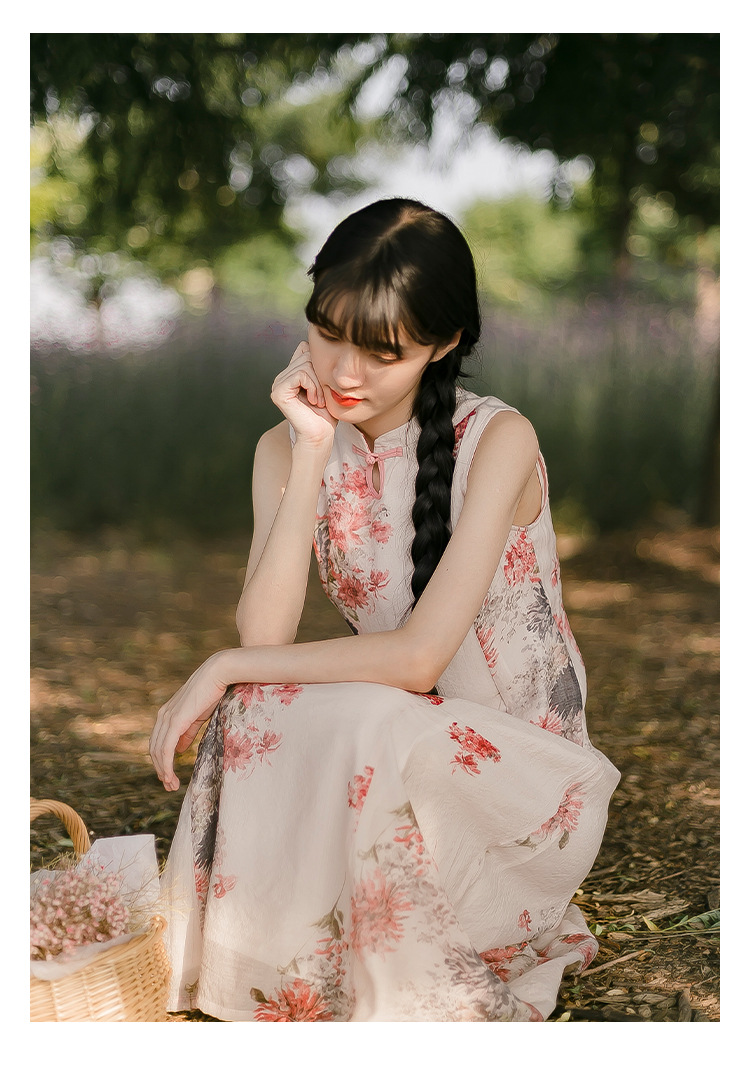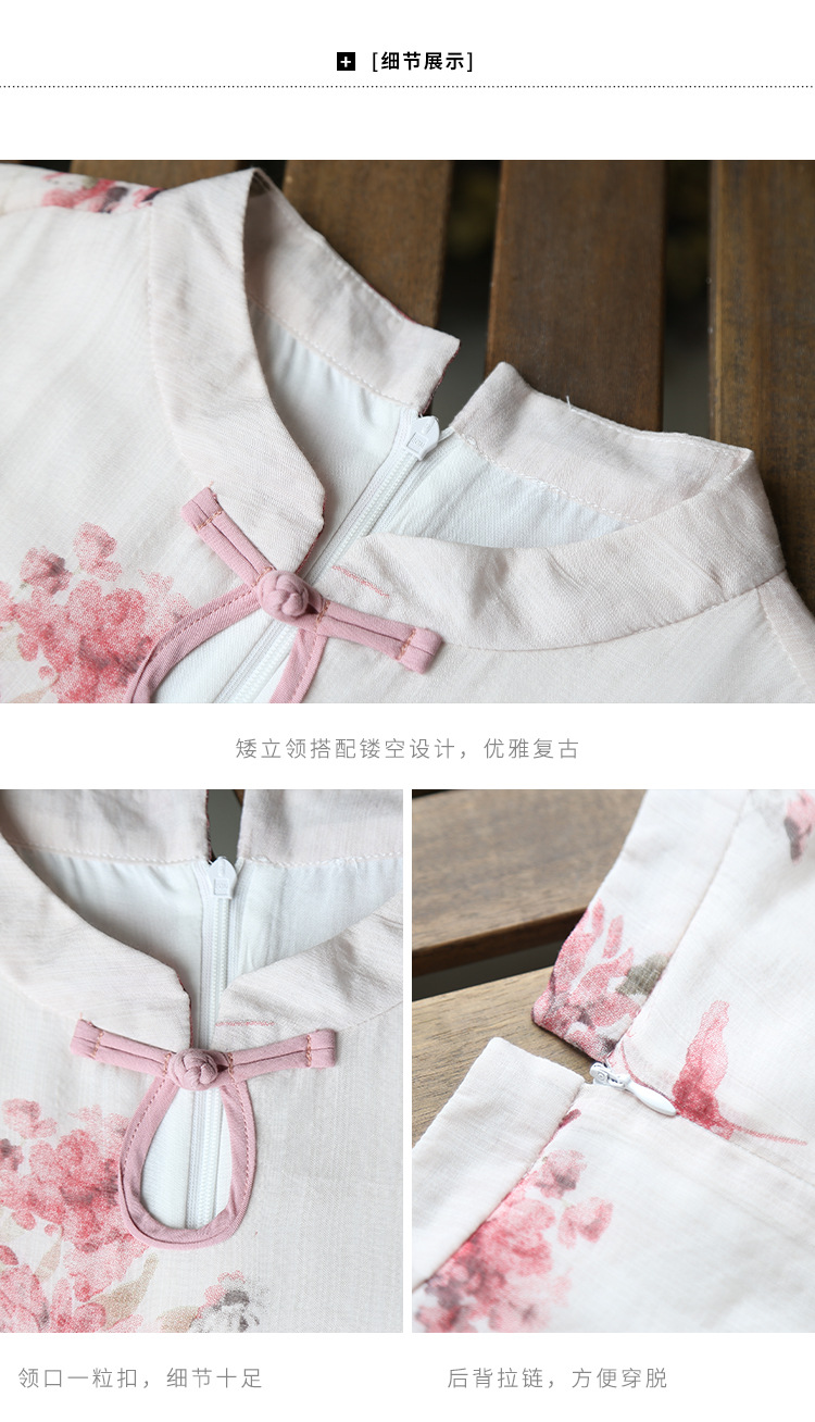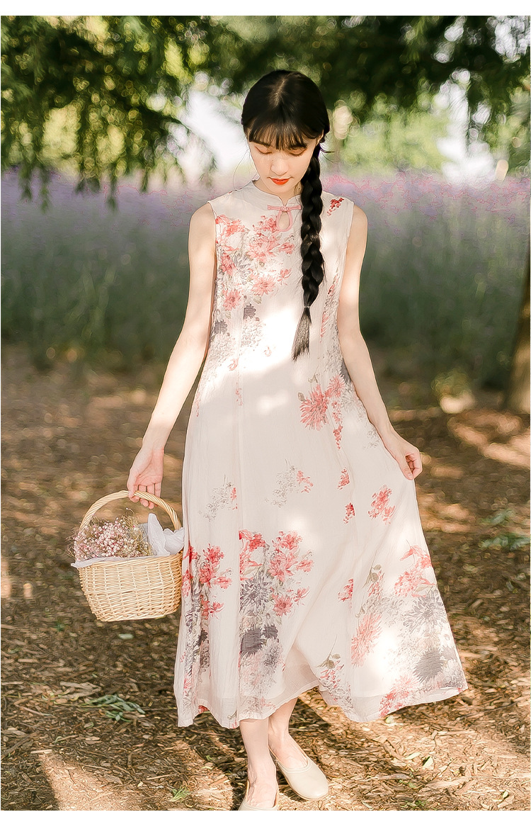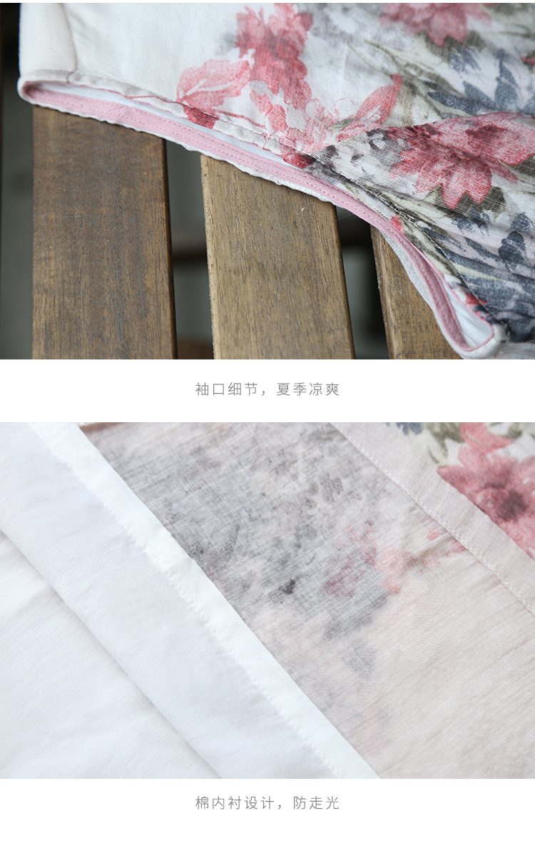 YM-9665棉麻印花 文艺优雅飘逸无袖丝麻立领收腰A字裙