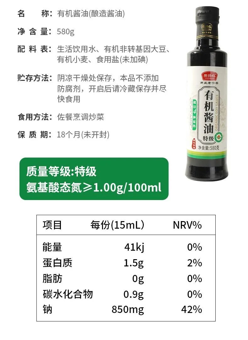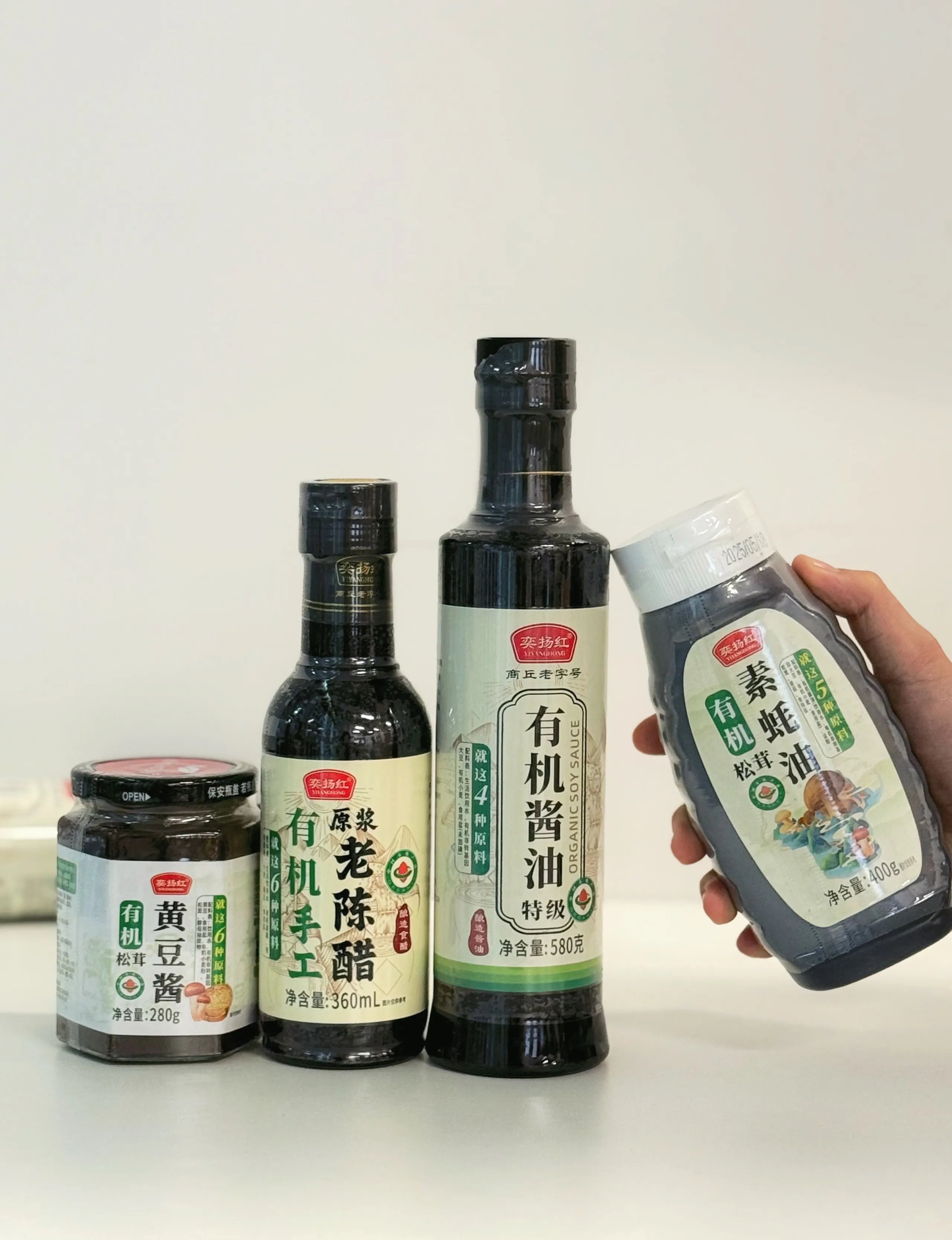 【品牌】奕扬红 【品名】有机调味料4件套组合 【规格】有机酱油+陈醋+松茸素蚝油+松茸黄豆酱(各1瓶,共4瓶) 【净含量】 有机松茸素蚝油:400g/瓶 有机酱油:580g/瓶 有机手工原浆老陈醋:360ml/瓶 有机松茸黄豆酱:280g/瓶 【生产日期】2025年7月 【保质期】 有机松茸素蚝油:18个月(未开封) 有机酱油:18个月(未开封) 有机手工原浆老陈醋:长期 有机松茸黄豆酱:18个月(未开封) 【贮存方法】 有机松茸黄豆酱:常温阴凉干燥处,本品不添加防腐剂,开启后请冷藏保存并尽快食用 有机松茸素蚝油:常温阴凉干燥处存放,本品不添加防腐剂,开启后请冷藏保存并尽快食用 有机酱油:阴凉干燥处保存,本品不添加防腐剂,开启后请冷藏保存并尽快食用 有机手工原浆老陈醋:阴凉通风干燥处保存 【禁止食用】婴幼儿,对产品过敏者禁止食用 【注意事项】 有机松茸黄豆酱:本产品是发酵食品,出现的白点是氨基酸(主要为络氨酸)结晶,属正常现象,请放心食用 有机酱油:发酵产品,若有少量沉淀,属正常现象,对口味没有任何影响,请放心食用。 有机手工原浆老陈醋:发酵产品,若有少量沉淀,属正常现象,对口味没有任何影响 【产地】 有机松茸素蚝油:河南商丘 有机酱油:河南商丘 有机松茸黄豆酱:河南商丘 有机手工原浆老陈醋:山西清徐 【发货地】河南商丘 【发货快递】中通、韵达(随机发) 【加运费地区】北京、上海+1元/件 【发货时间】下单2-3天内,如其他渠道爆单2-7天内延顺,不接急单 【不发货地区】港澳台、新疆、西藏、甘肃、宁夏、青海、海南、内蒙古(偏远或特殊地区以打单为主,不发可退款) 【售后标准】特殊产品不支持7天无理由,破损按比例赔付,若有质量问题请于签收后的24小时内拿快递面单+产品实拍+视频,找客服处理售后