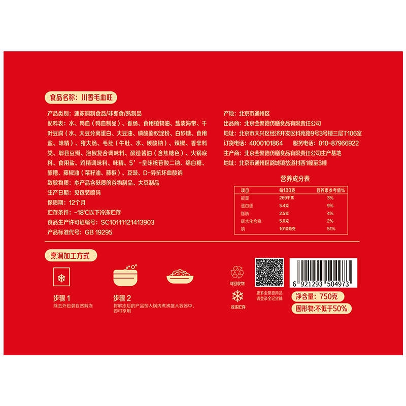 川香毛血旺 750克 冷冻品 2025.12.18到期