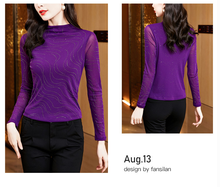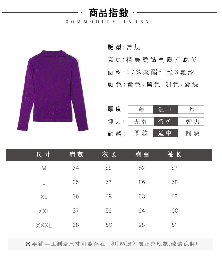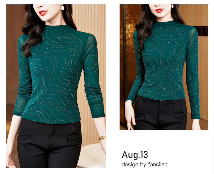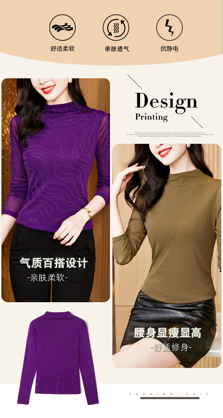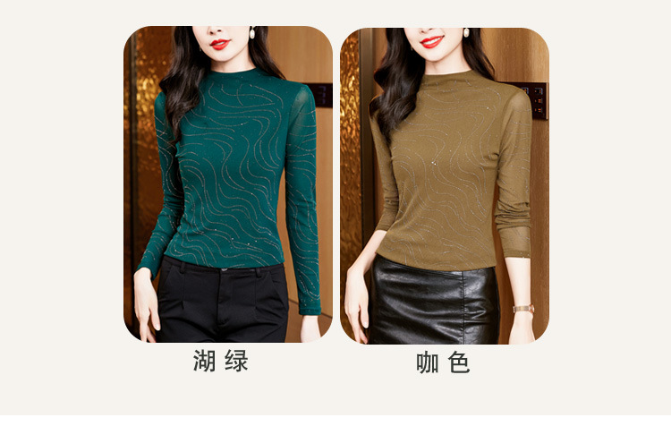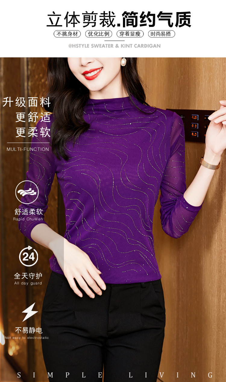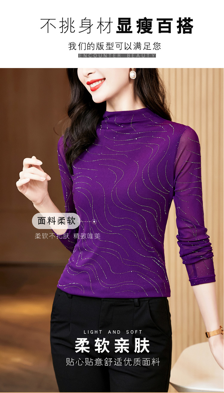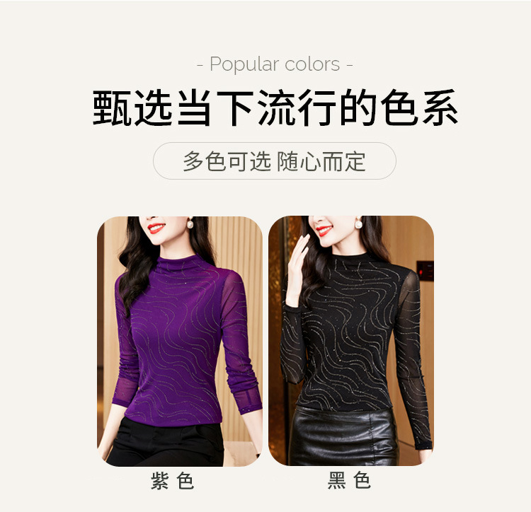 KQL-E37M2719秋冬新款半高领修身百搭烫钻长袖网纱打底衫纯色显瘦T恤