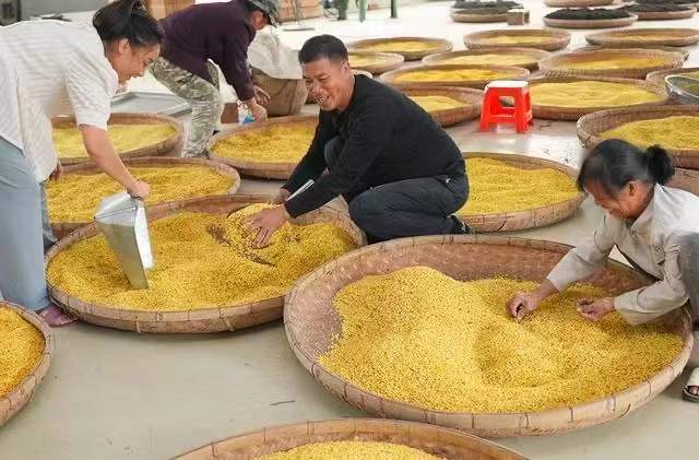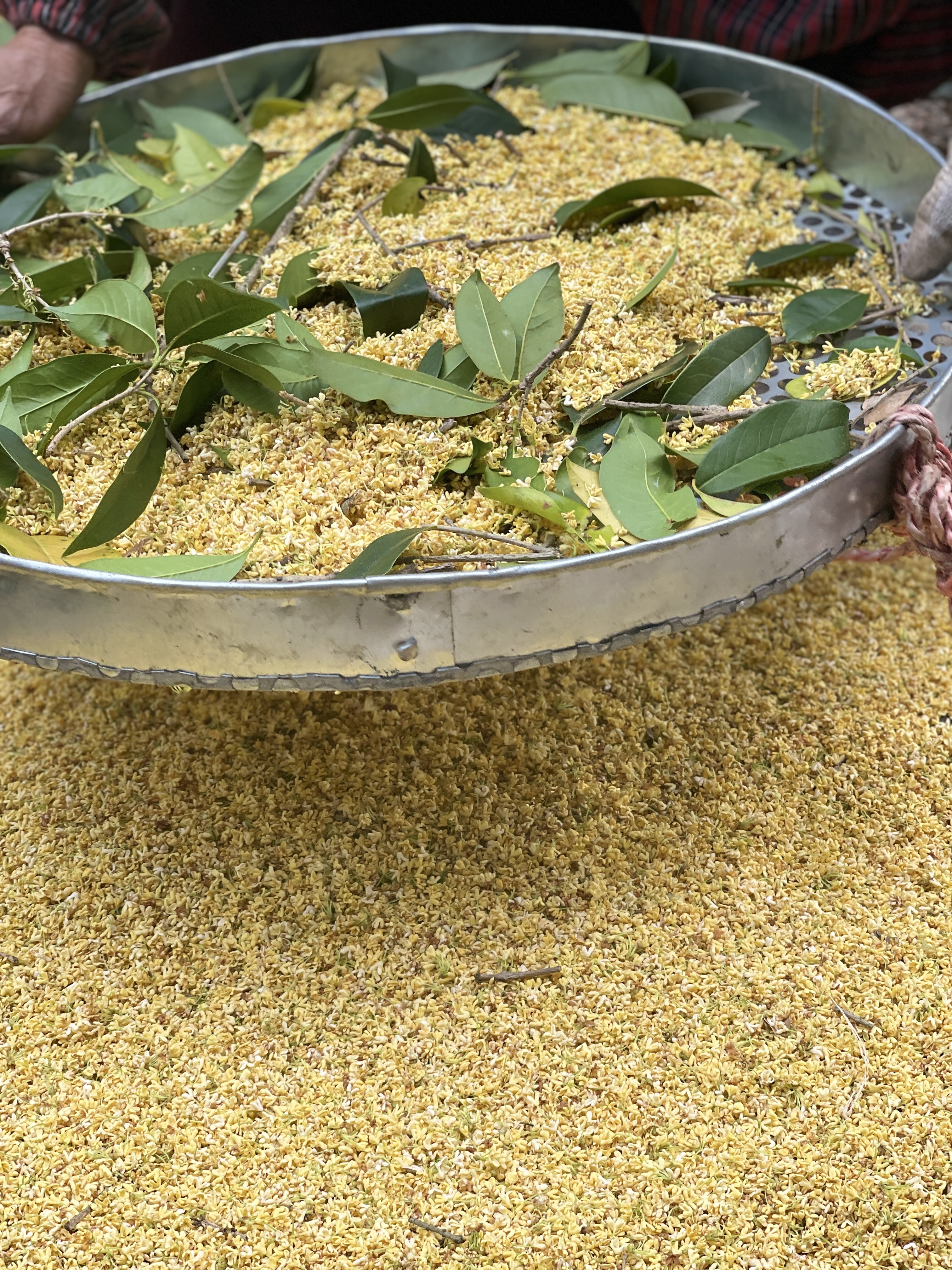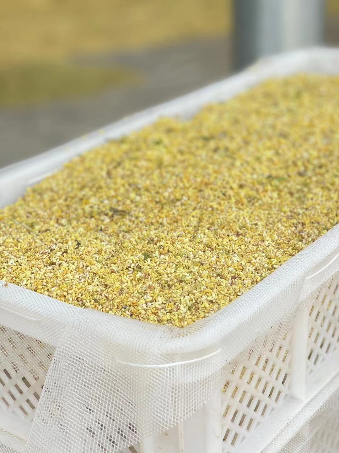 今年雨水较少,所以桂花开的特别晚。10斤的鲜花经过严格筛选才能精选出500克的特级金桂花。