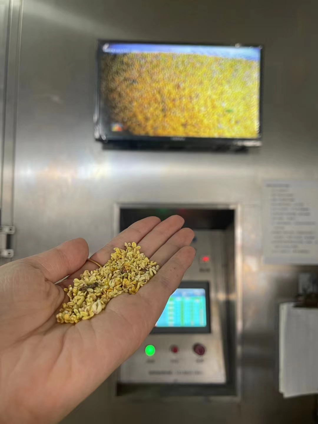关于筛选:采收新鲜的桂花进行手工筛选掉树叶和枝干等杂质,高程度高标准剔除杂质,机选+人工筛选,严格规范操作,10斤的鲜花经过严格筛选才能精选出500克的特级金桂花