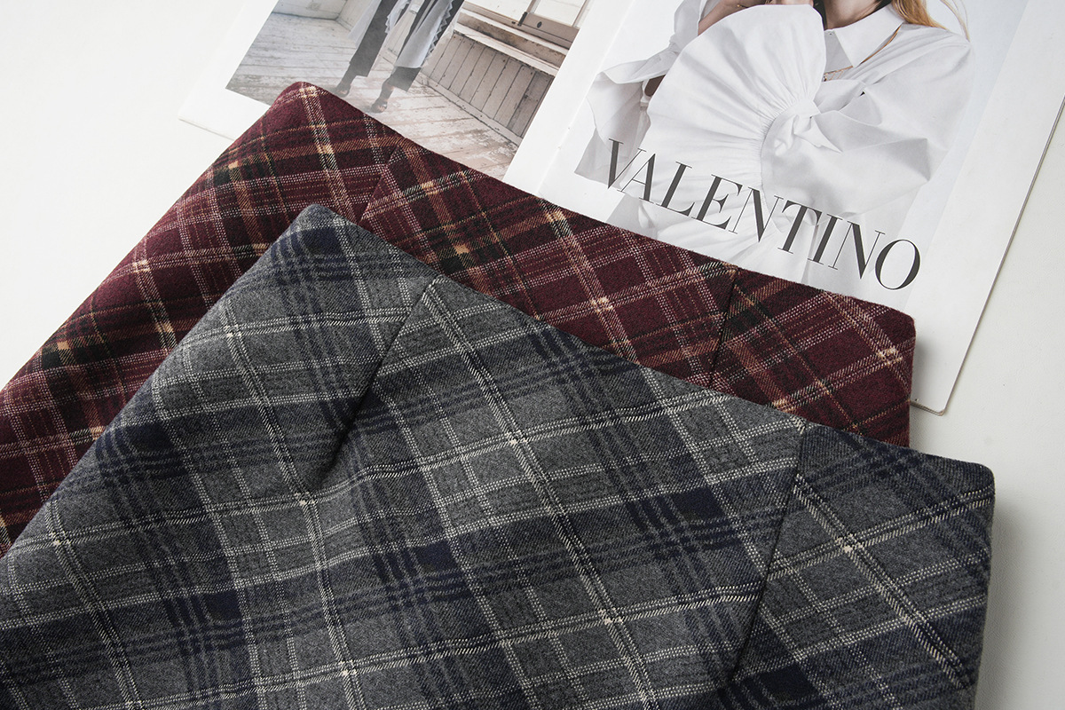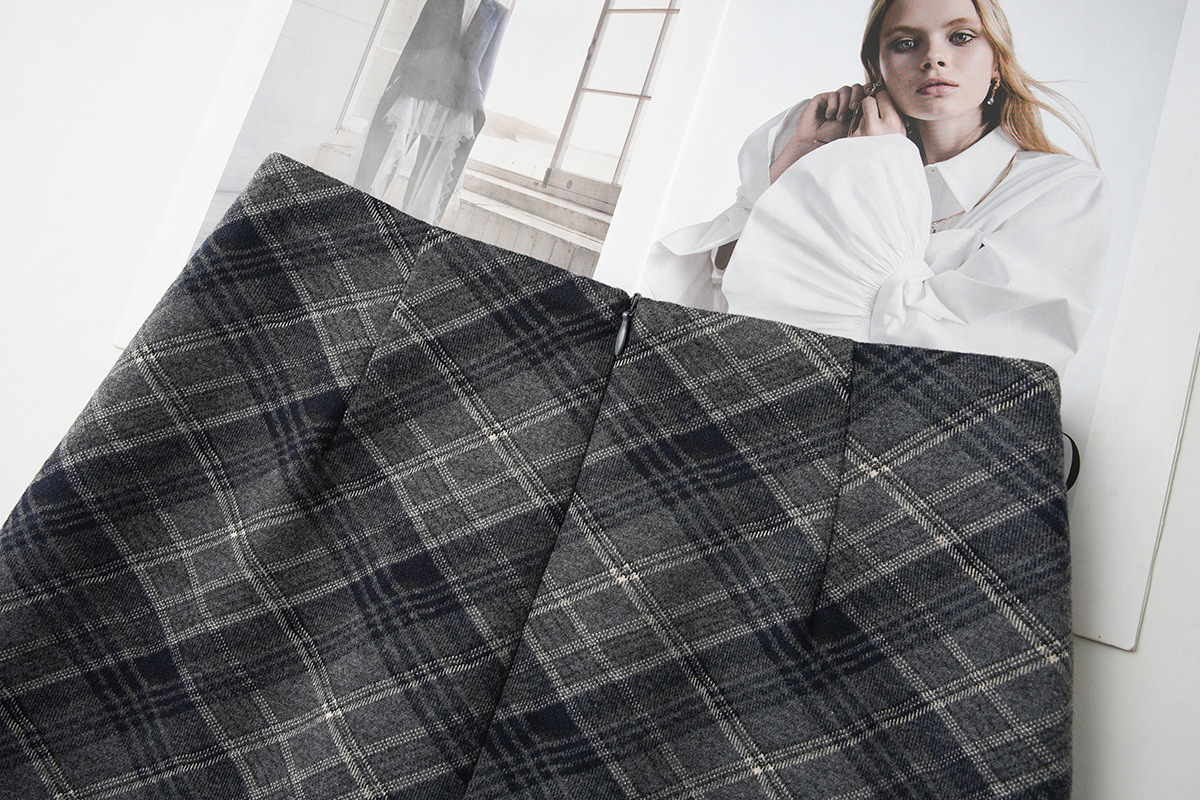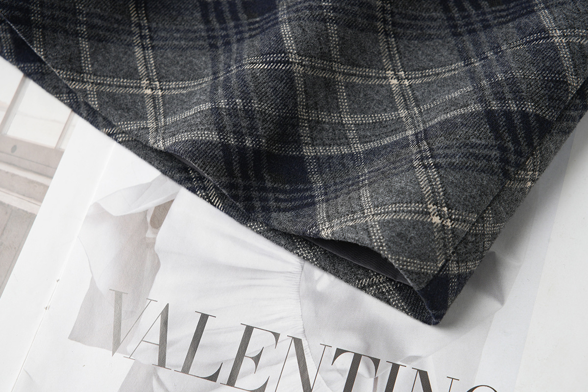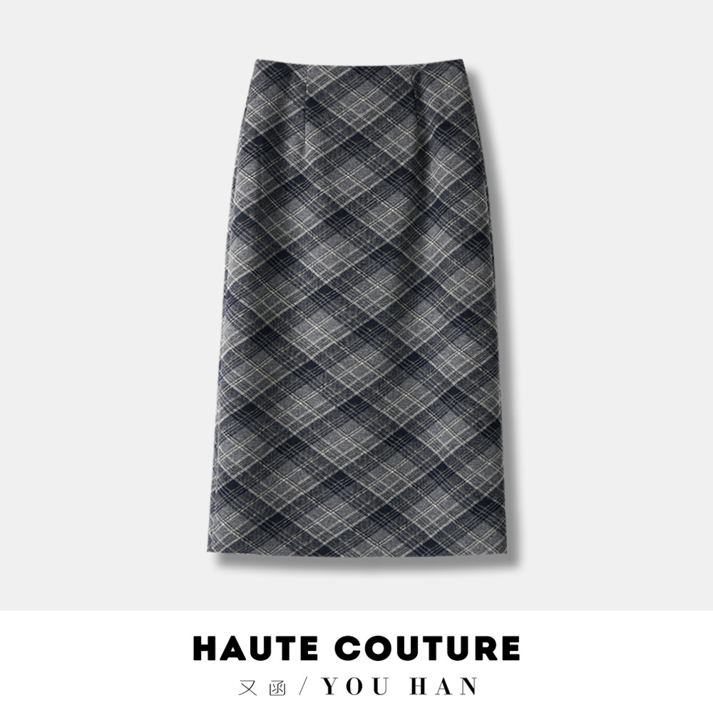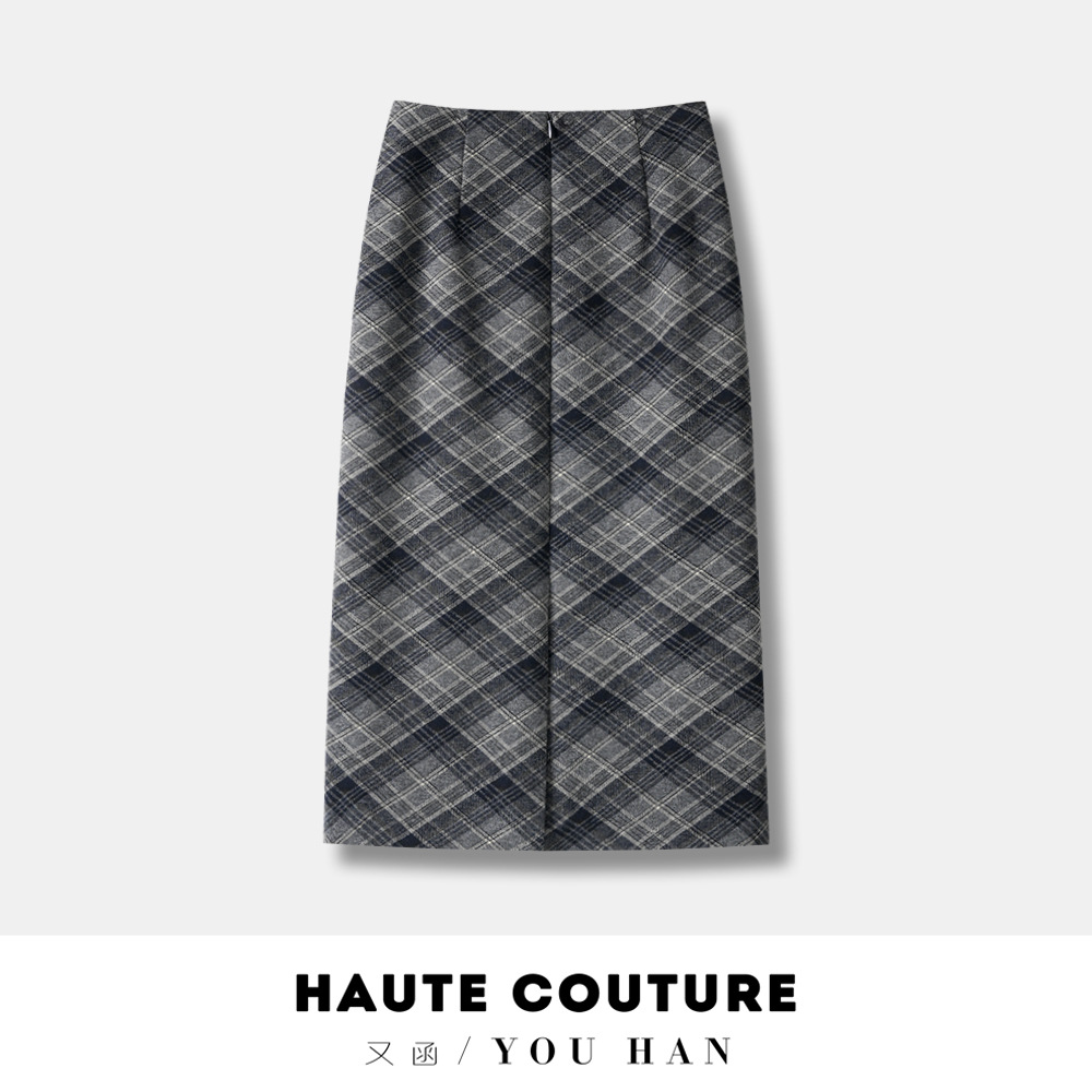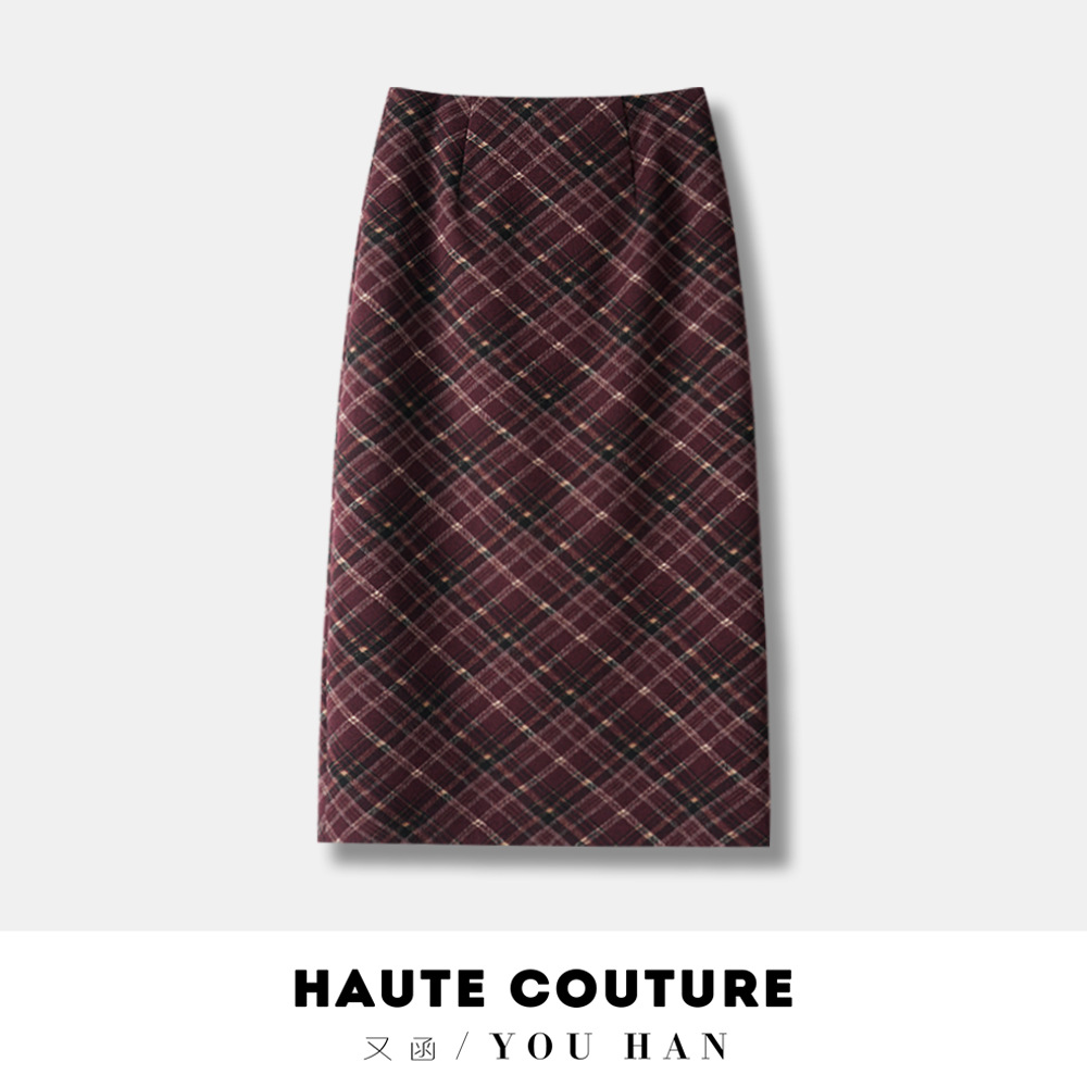 丁摩 安可拉红秋冬复古格纹毛呢半身裙开叉中长裙格子气质百搭5ZF-850