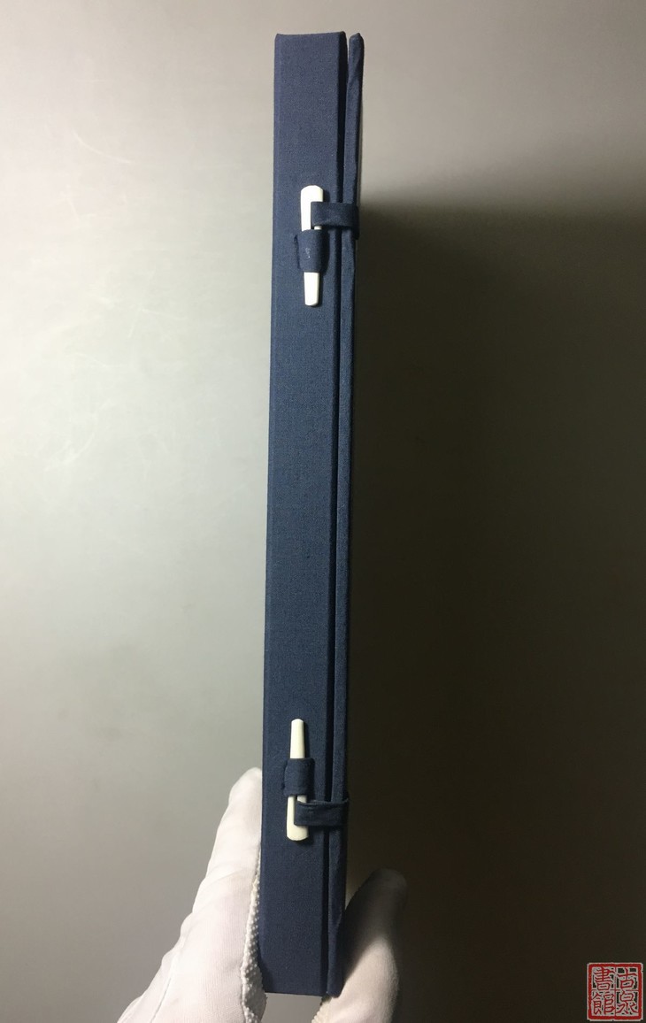 装帧:纯手工装订。安徽手工单宣双色印刷,衬手工宣单页,封面为打蜡瓷青纸,函套用冰梅蓝绫简套,签条用仿古晒金宣双色印刷后贴白宣。六眼线装。