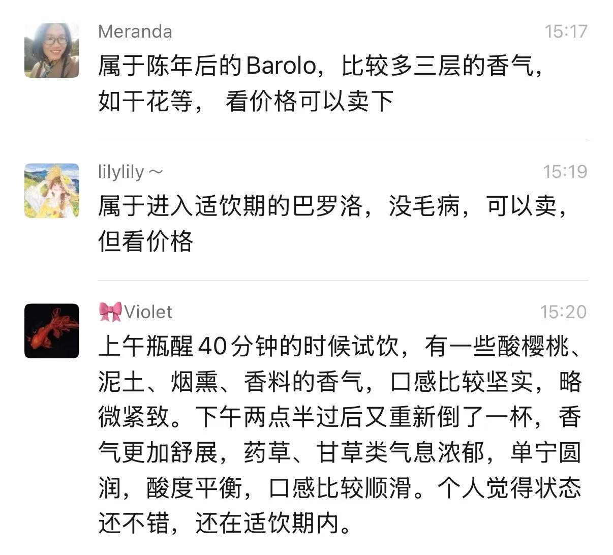 此酒距今已有 19 年,经过漫长岁月的打磨,酒中的单宁变得更加圆润细腻,果香与陈年香气和谐相融,口感也变得更加顺滑、富有层次。经过我们团队亲试,这支巴罗洛的状态依旧很好,正值适饮期。