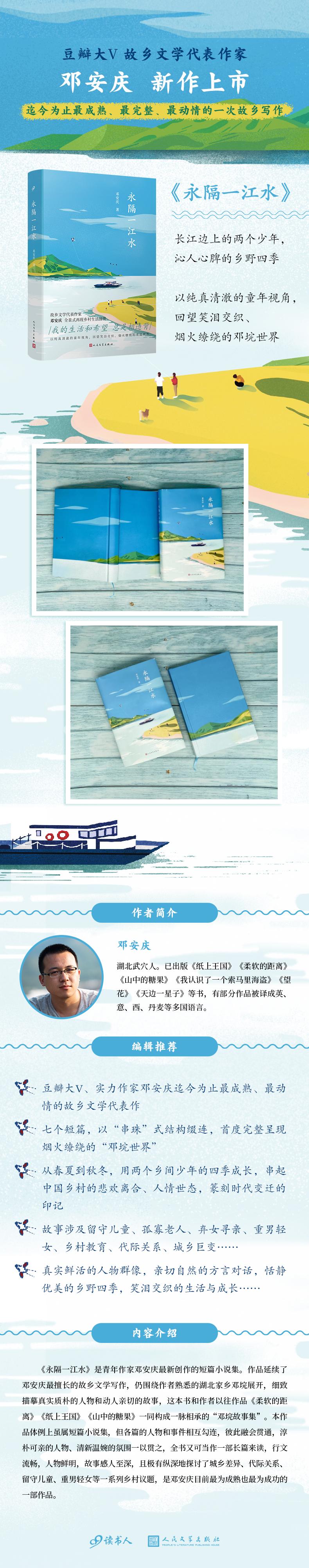 《永隔一江水》是青年作家邓安庆创作的短篇小说集。作品延续了邓安庆最擅长的故乡文学写作,仍围绕作者熟悉的湖北家乡邓垸展开,细致描摹真实质朴的人物和动人亲切的故事,这本书和作者以往作品《柔软的距离》《纸上王国》《山中的糖果》一同构成一脉相承的“邓垸故事集”。本作品体例上虽属短篇小说集,但各篇的人物和事件相互勾连,彼此融会贯通,淳朴可亲的人物、清新温婉的氛围一以贯之,全书又可当作一部长篇来读,行文流畅,人物鲜明,故事感人至深,且极有纵深地探讨了城乡差异、代际关系、留守儿童、重男轻女等一系列乡村议题,是邓安庆目前最为成熟也最为成功的一部作品。