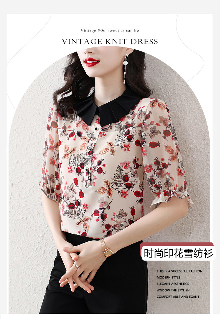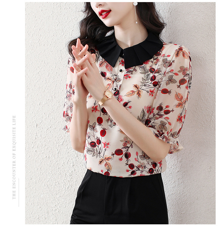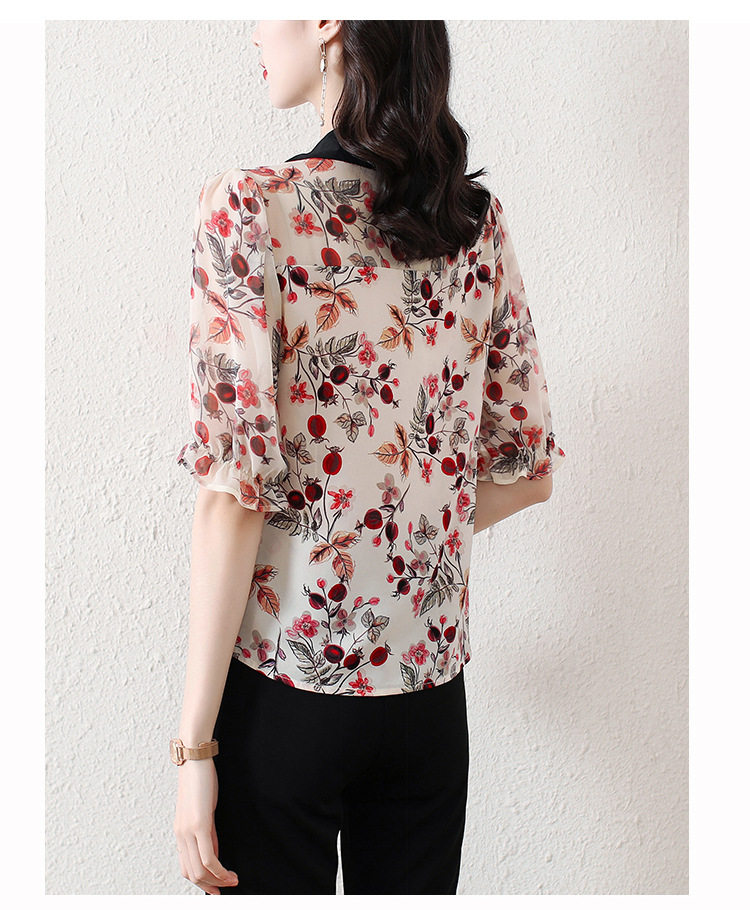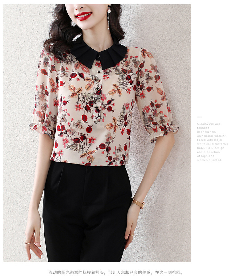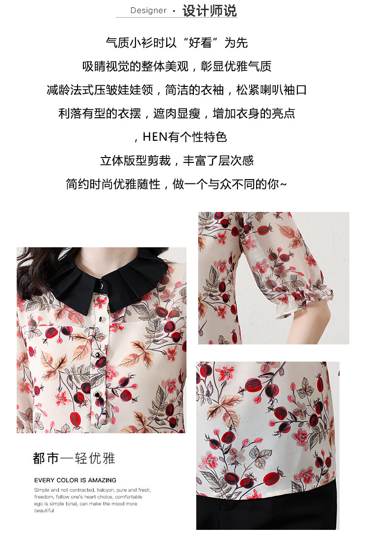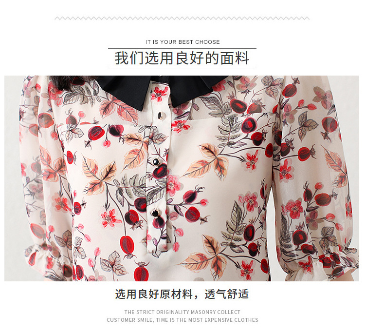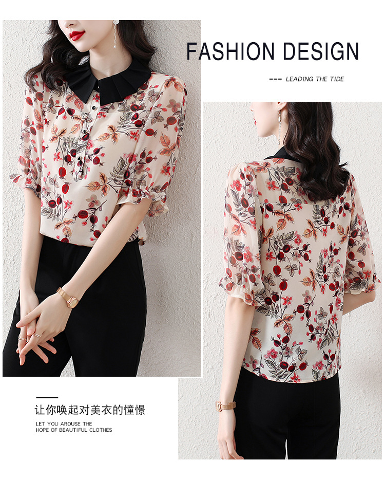 新款撞色,翻领衬衫小碎花气质减龄雪纺衫上衣KQL-9259