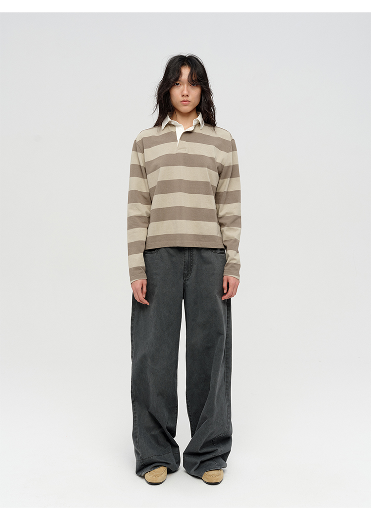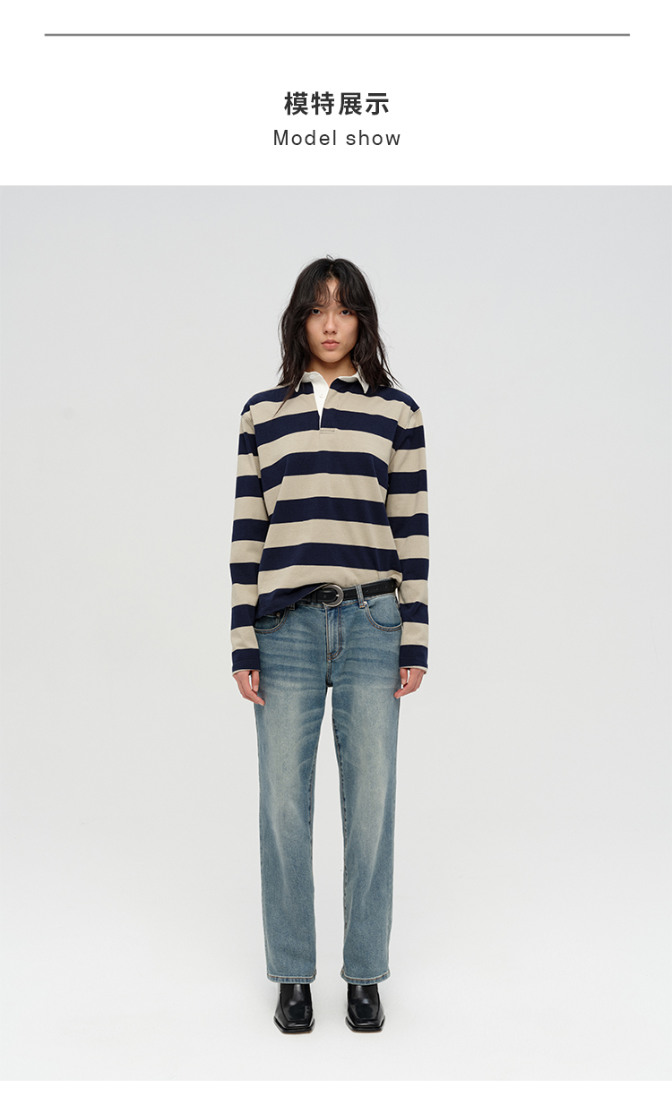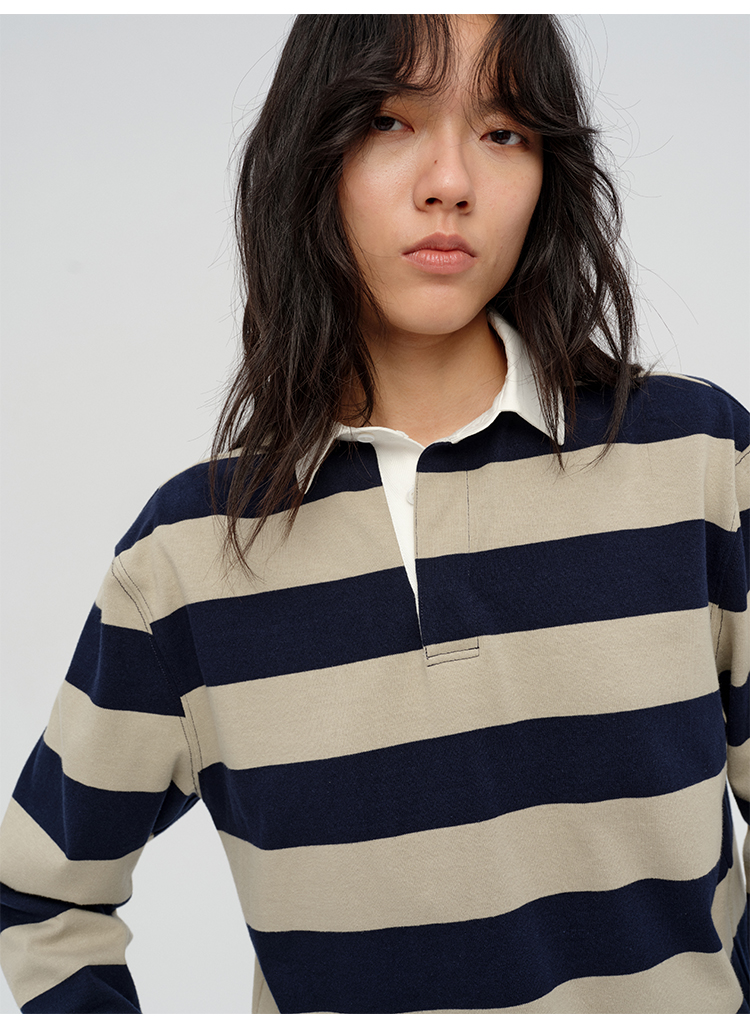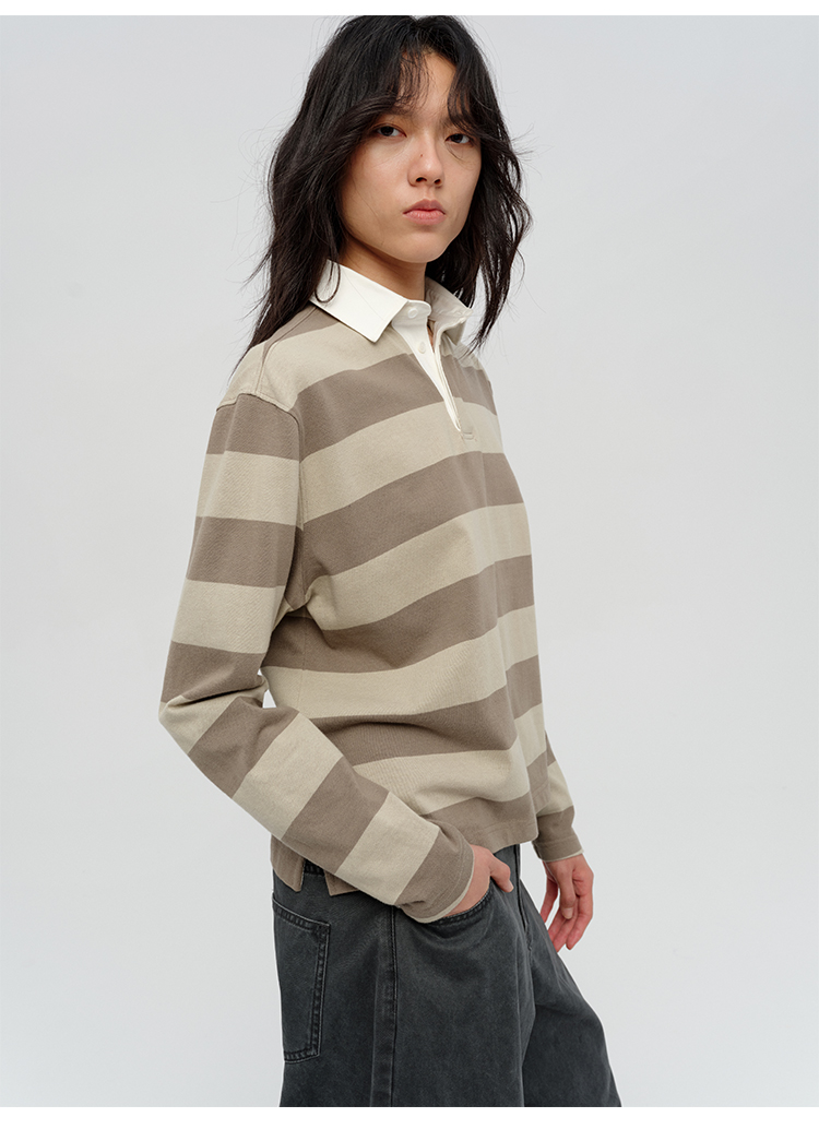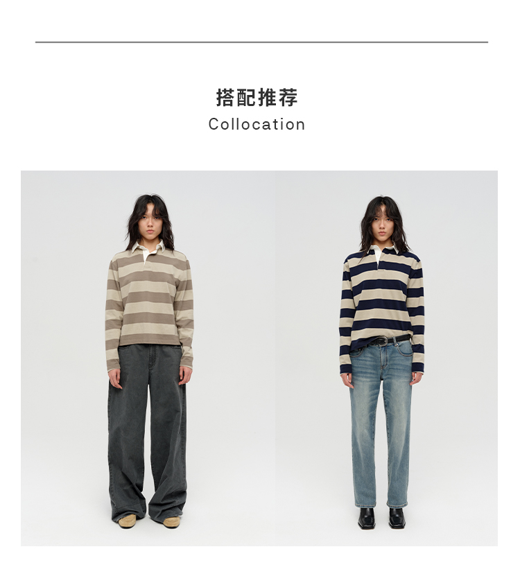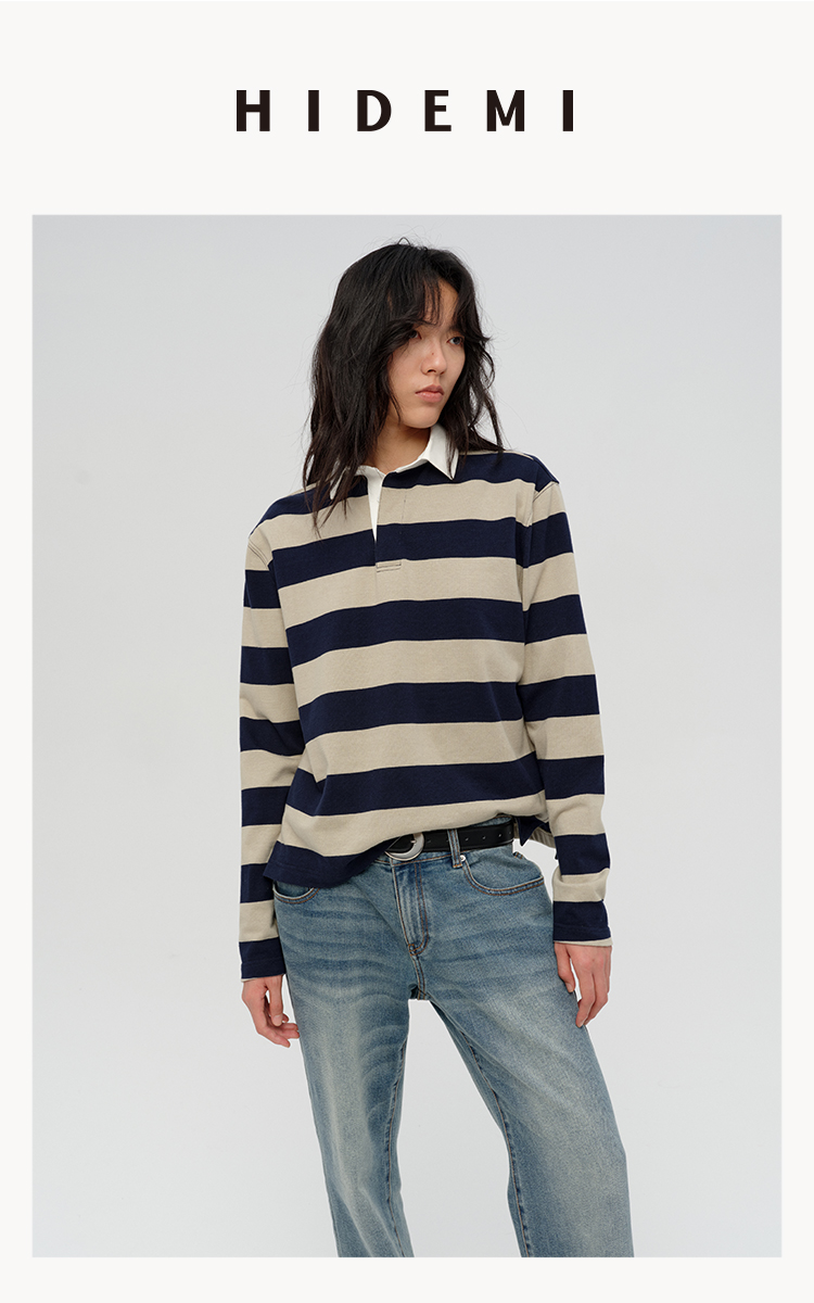 HIDEMI 小男孩系列自然棉色织条纹polo领拼接长袖T恤上衣 浅芸豆灰绿条纹/深炭灰绿条纹
