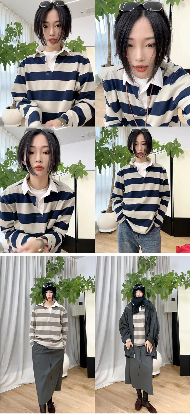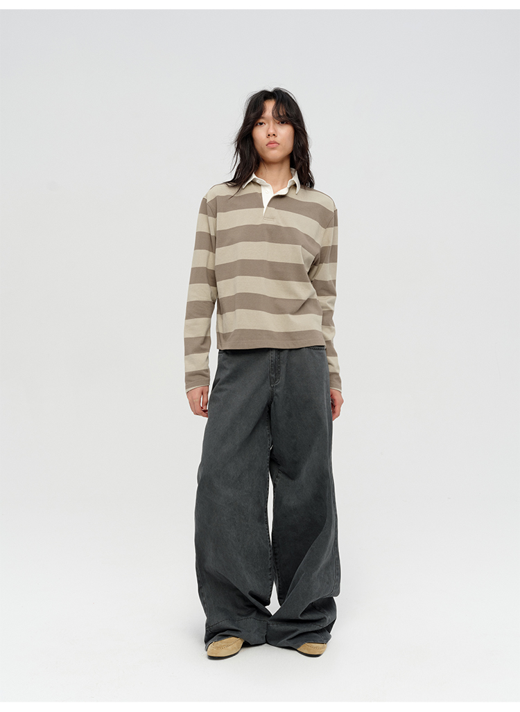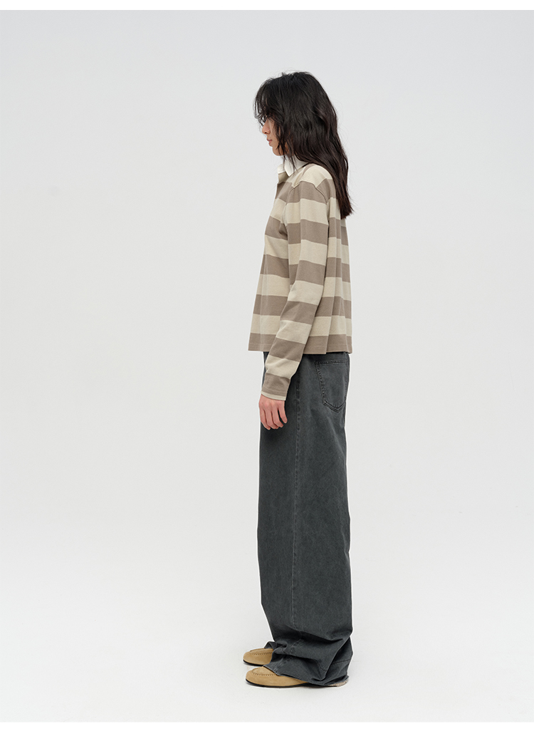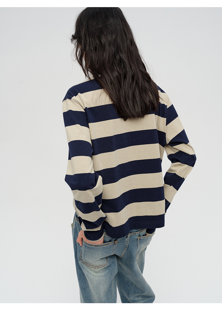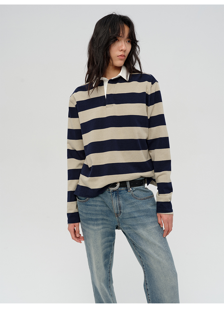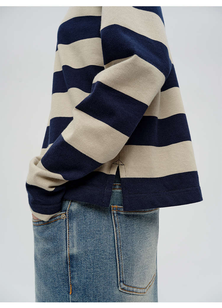 HIDEMI 小男孩系列自然棉色织条纹polo领拼接长袖T恤上衣 浅芸豆灰绿条纹/深炭灰绿条纹