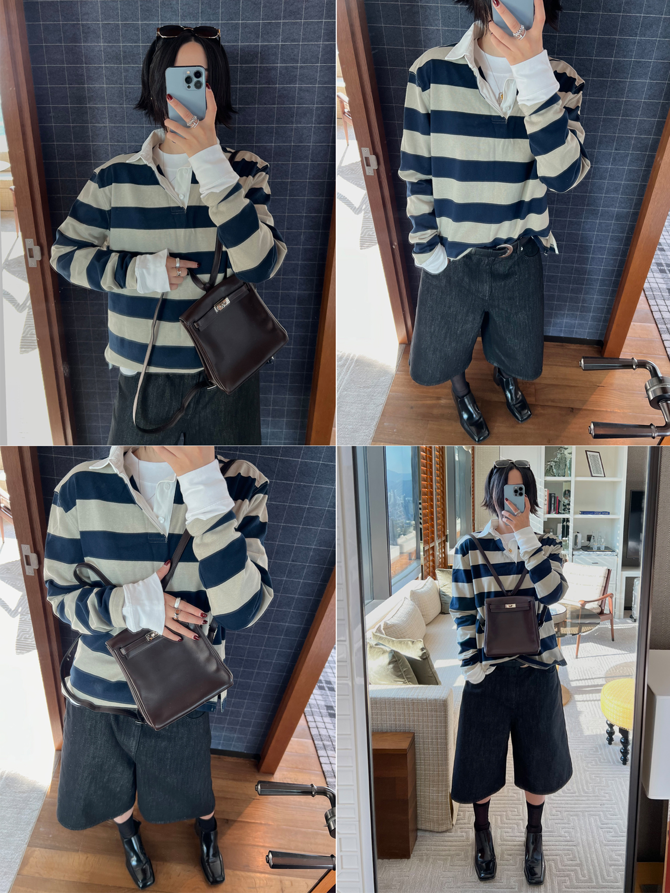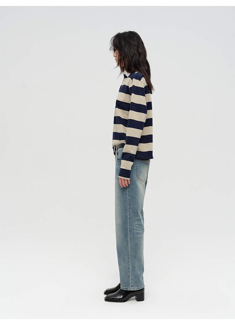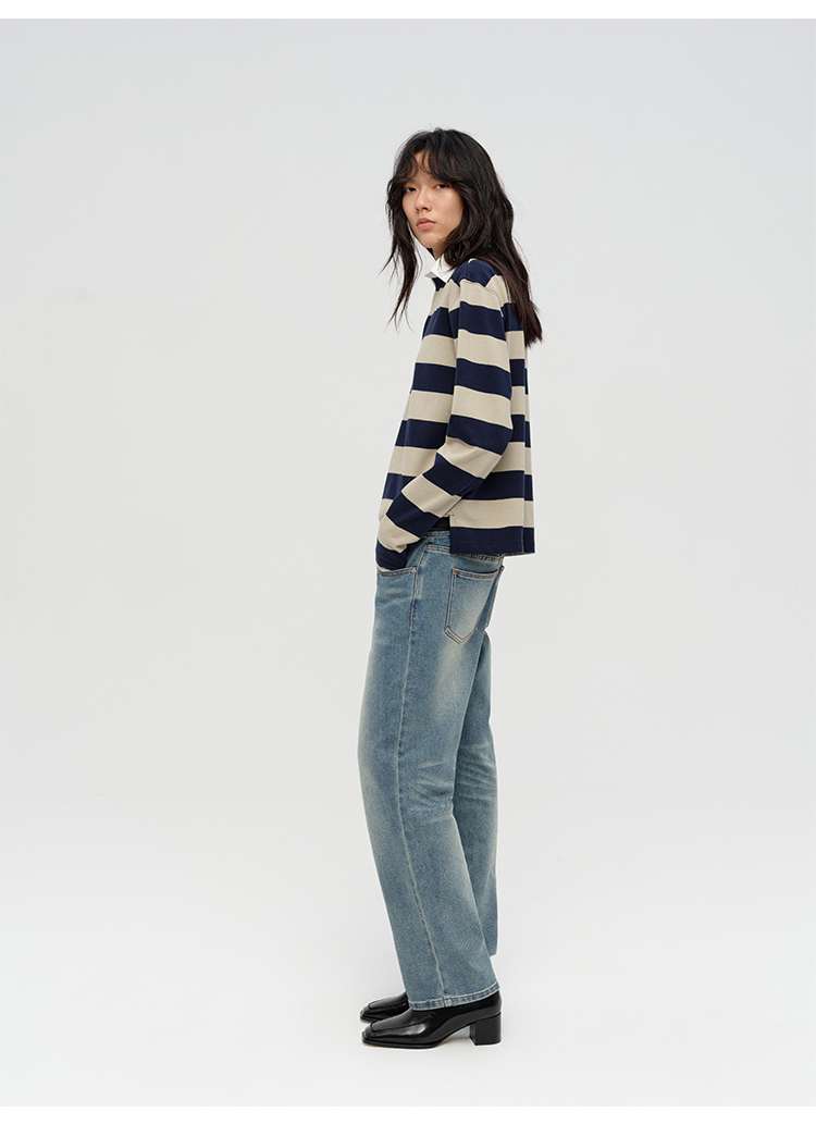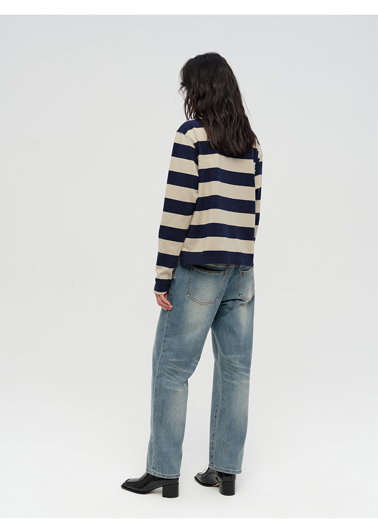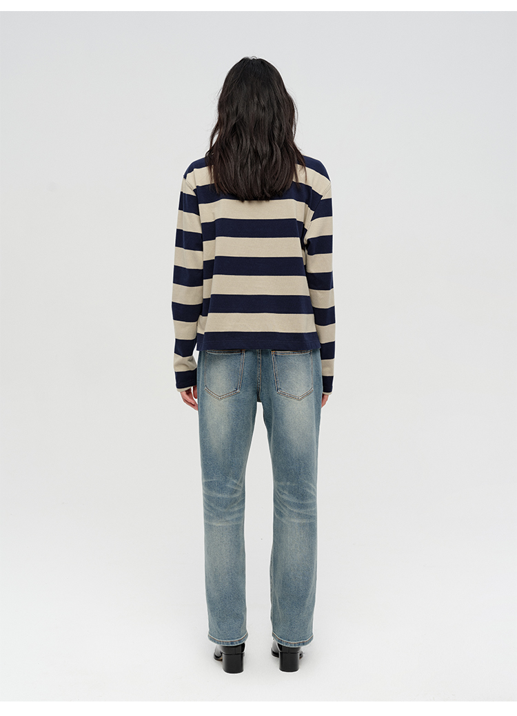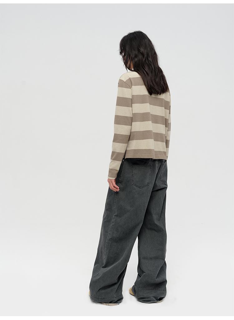 HIDEMI 小男孩系列自然棉色织条纹polo领拼接长袖T恤上衣 浅芸豆灰绿条纹/深炭灰绿条纹