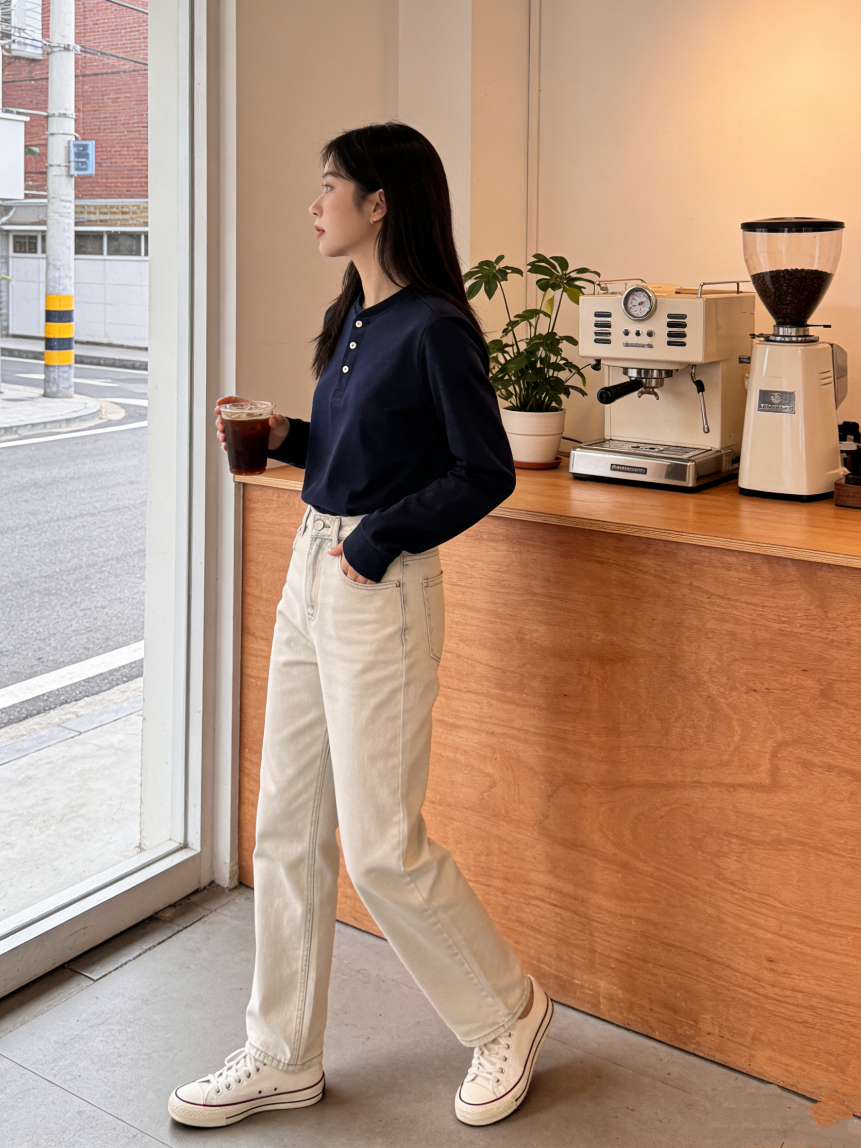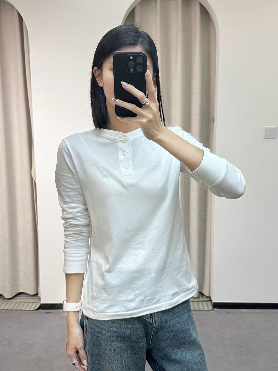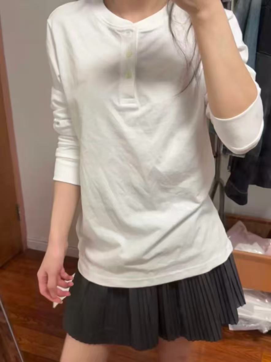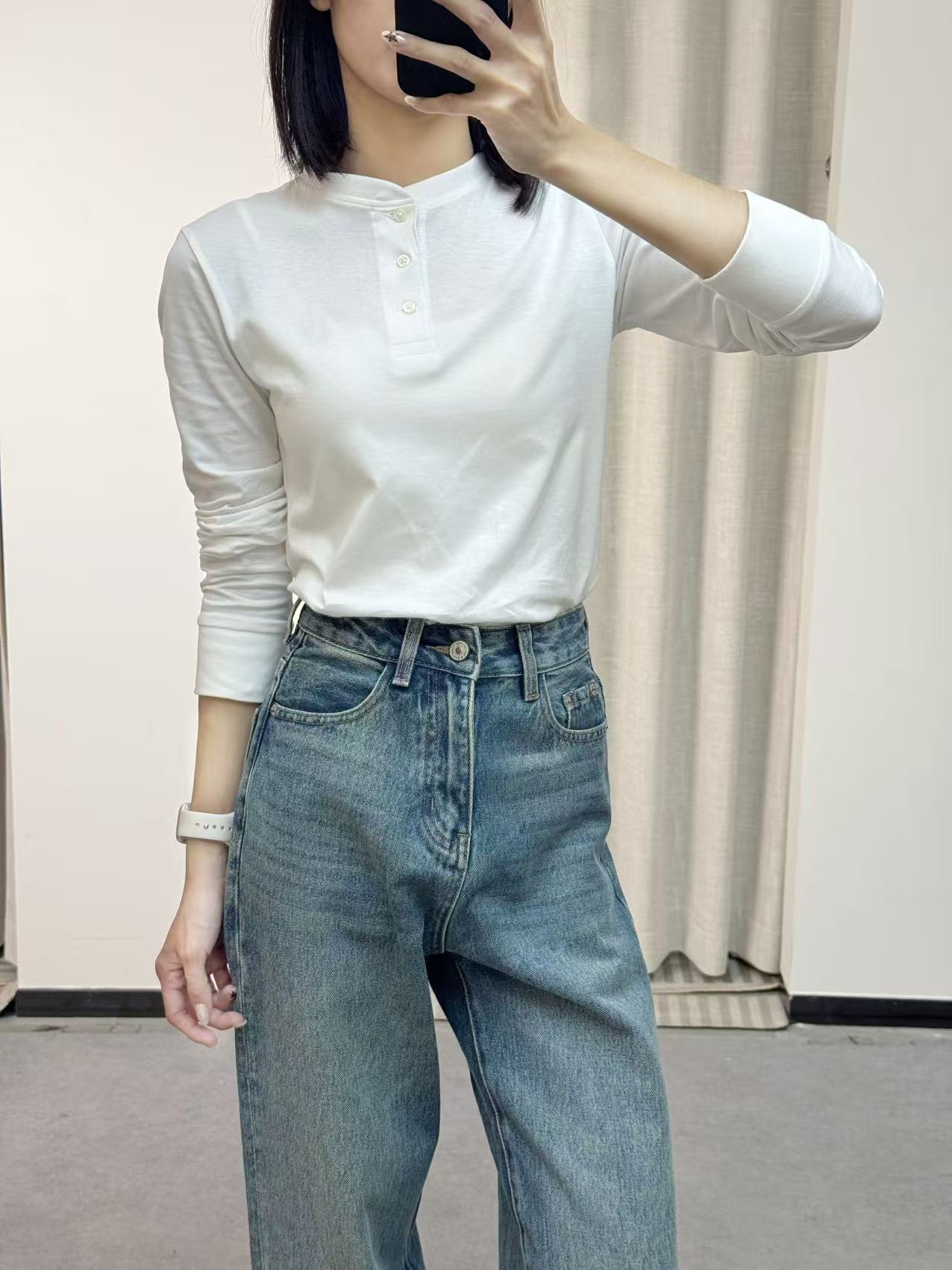 叠穿层次感:白色亨利衫内搭 + 牛仔外套 / 卡其色工装夹克
