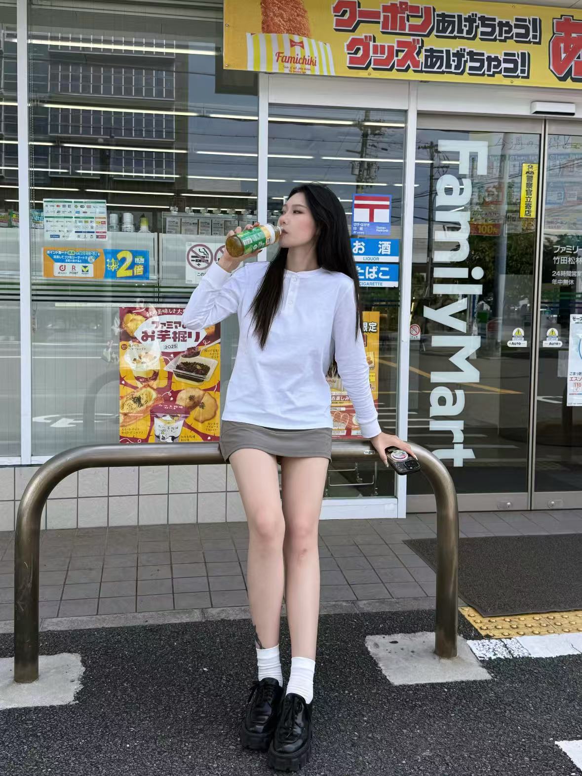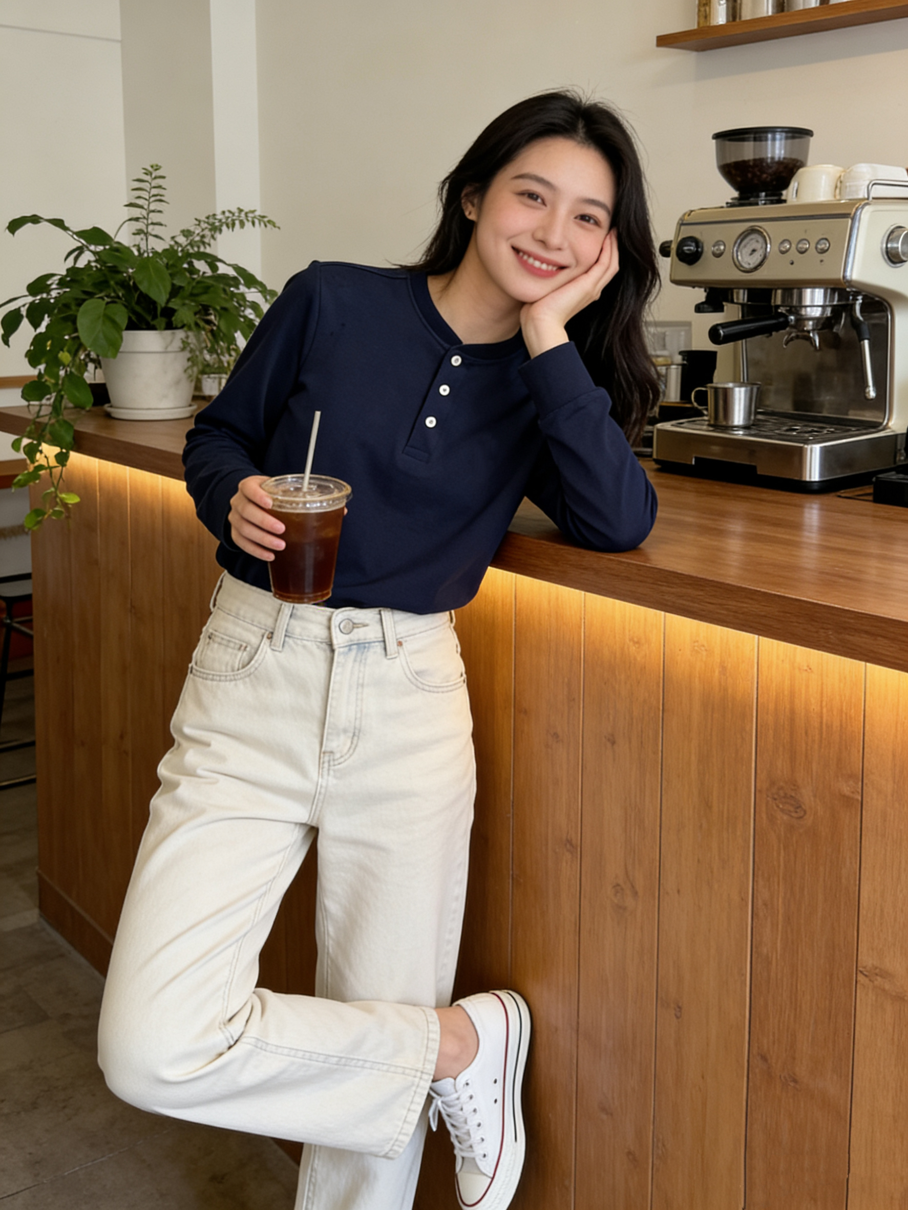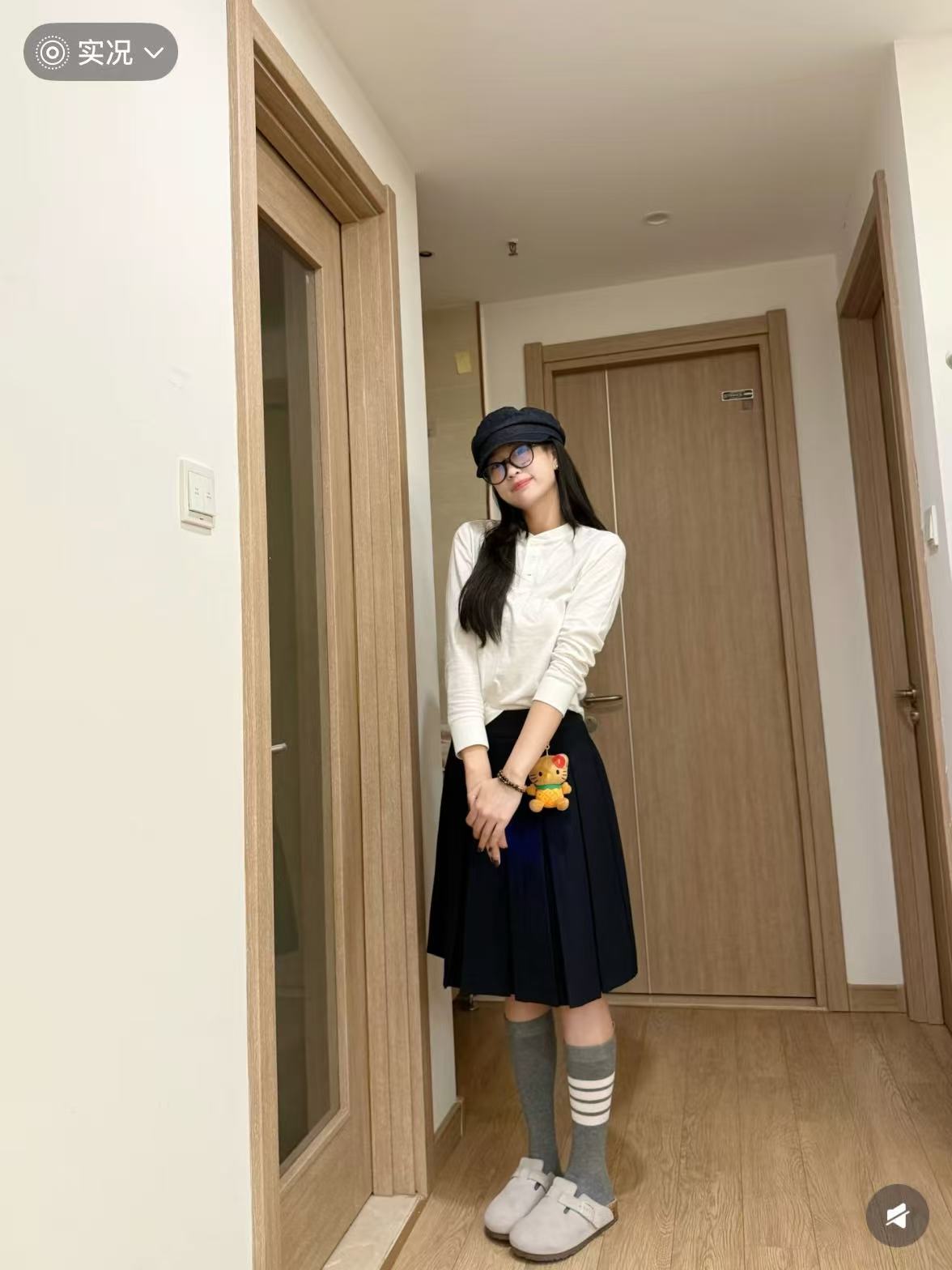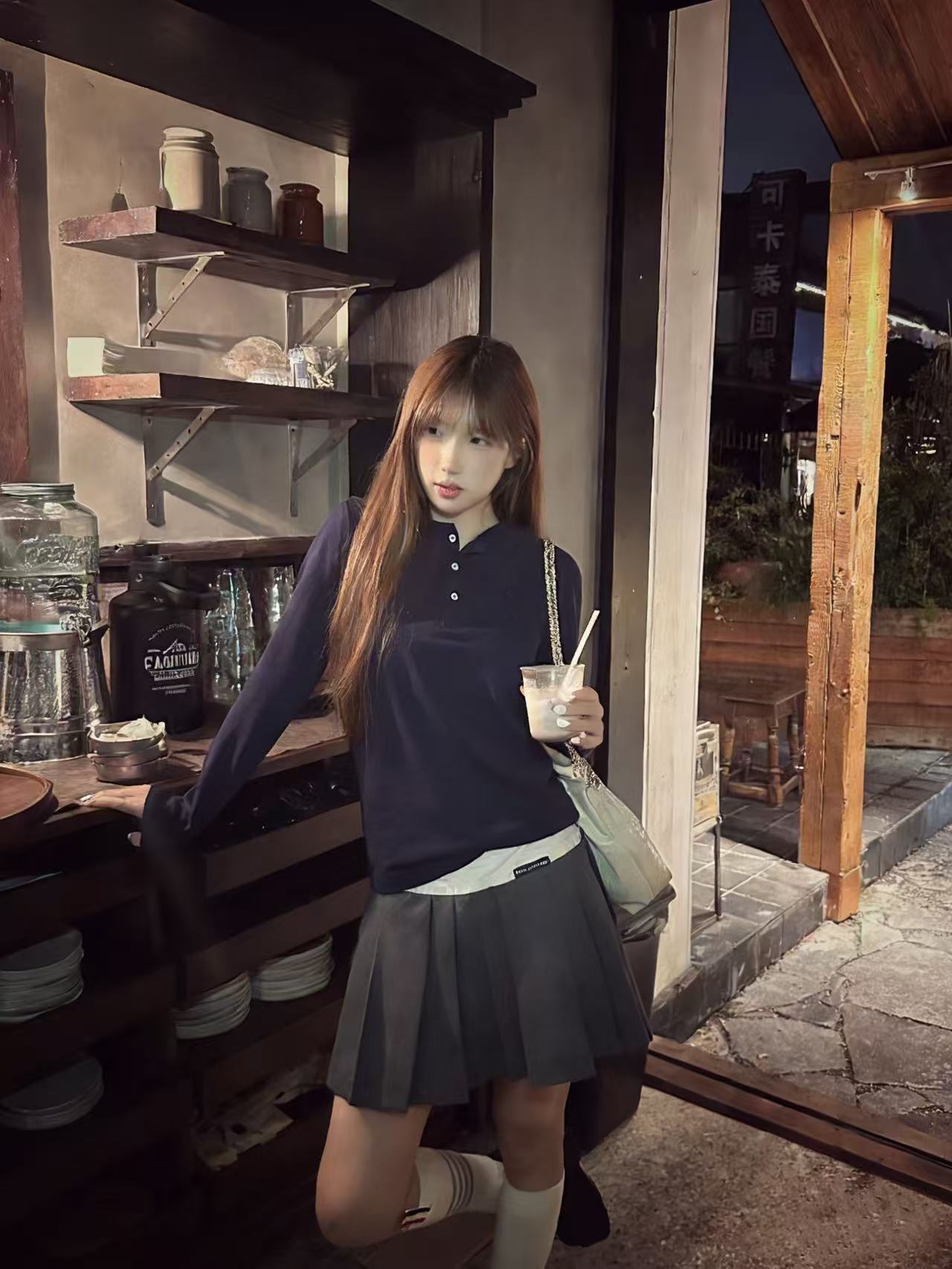 学院氛围感:藏青色亨利衫 + 卡其色百褶裙(女宝)/ 休闲裤(男宝)+ 乐福鞋