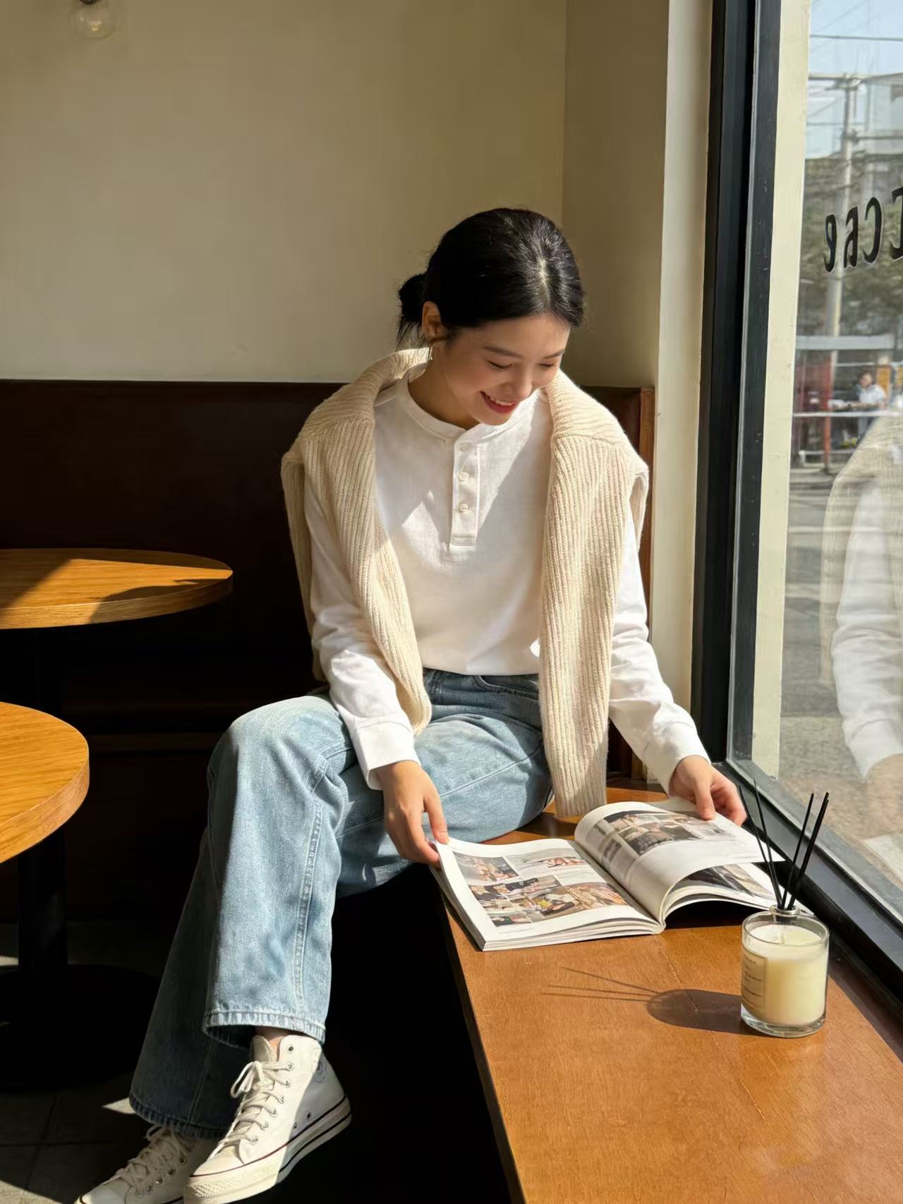 秋冬保暖叠穿:藏青色亨利衫内搭 + 燕麦色针织开衫 + 同色系围巾