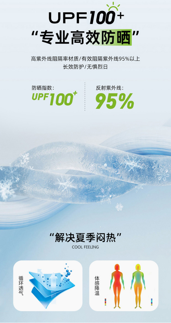 专业户外防晒+防水面料 UPF100+、持久防晒 有效遮蔽95%以上紫外线